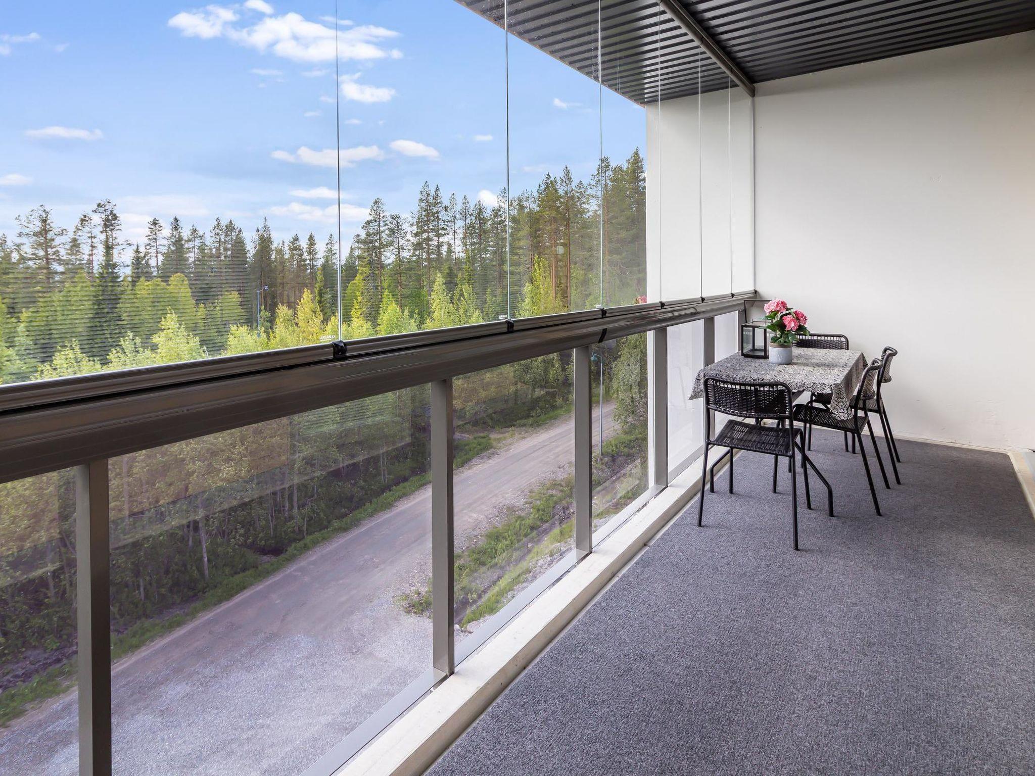 A large, fully glazed balcony spans the entire width of the apartment, offering stunning views of Aakenustunturi and the West slopes. The apartment comes with a private parking space equipped with a power outlet, suitable for charging electric or hybrid vehicles.