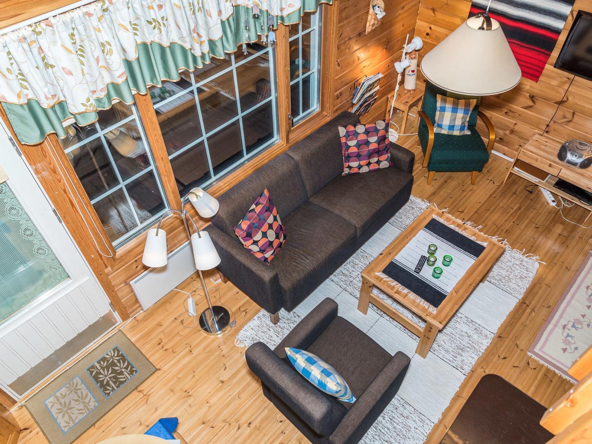 Living room, kitchenette, loft divided into two compartments by wall (one compartment with 3 beds, one with 2 beds) there is sloping ceiling in the loft, sauna (electric stove), washroom, separate WC, open porch, storage room. Ground floor 39 m², loft 24 m².