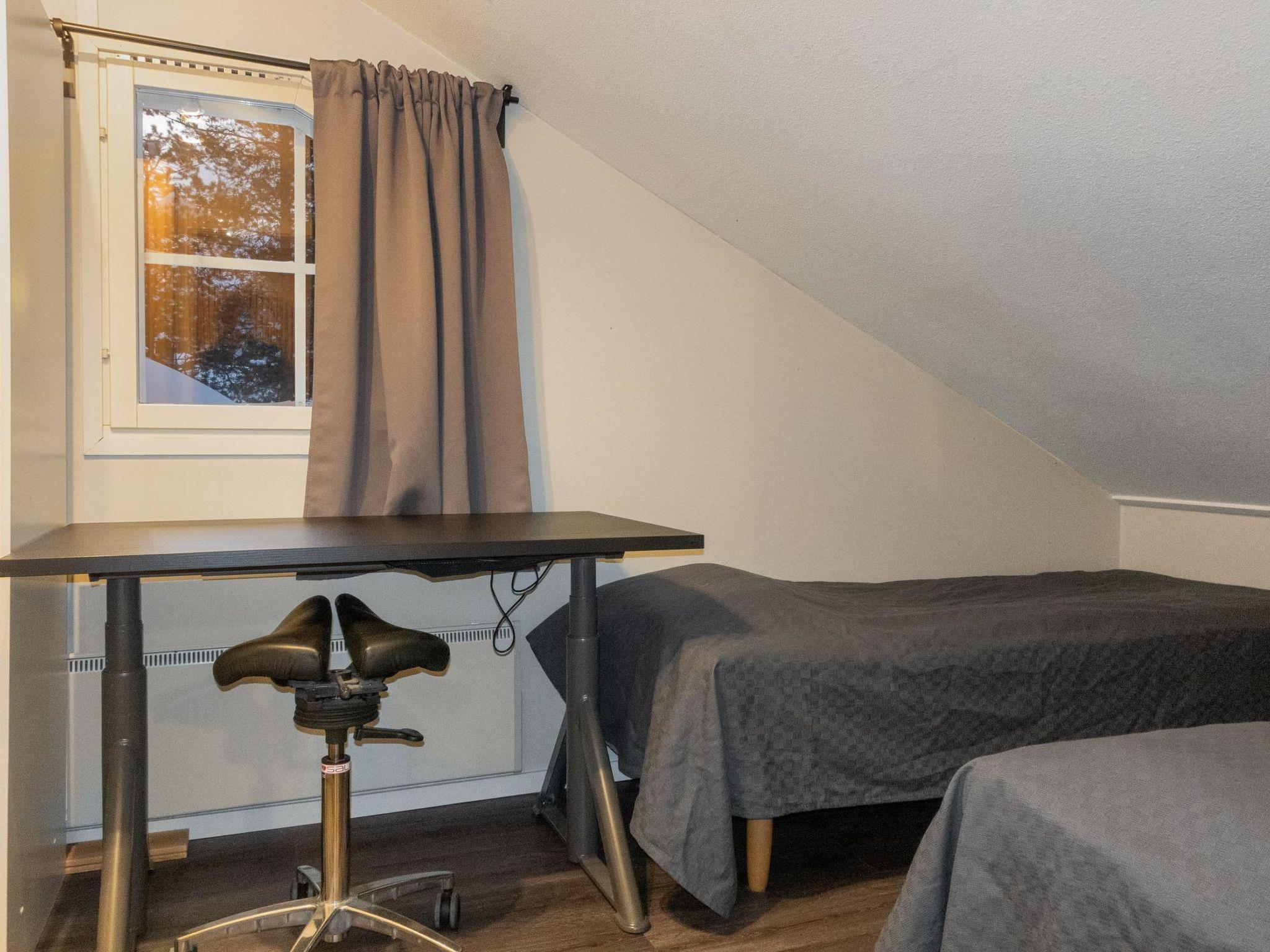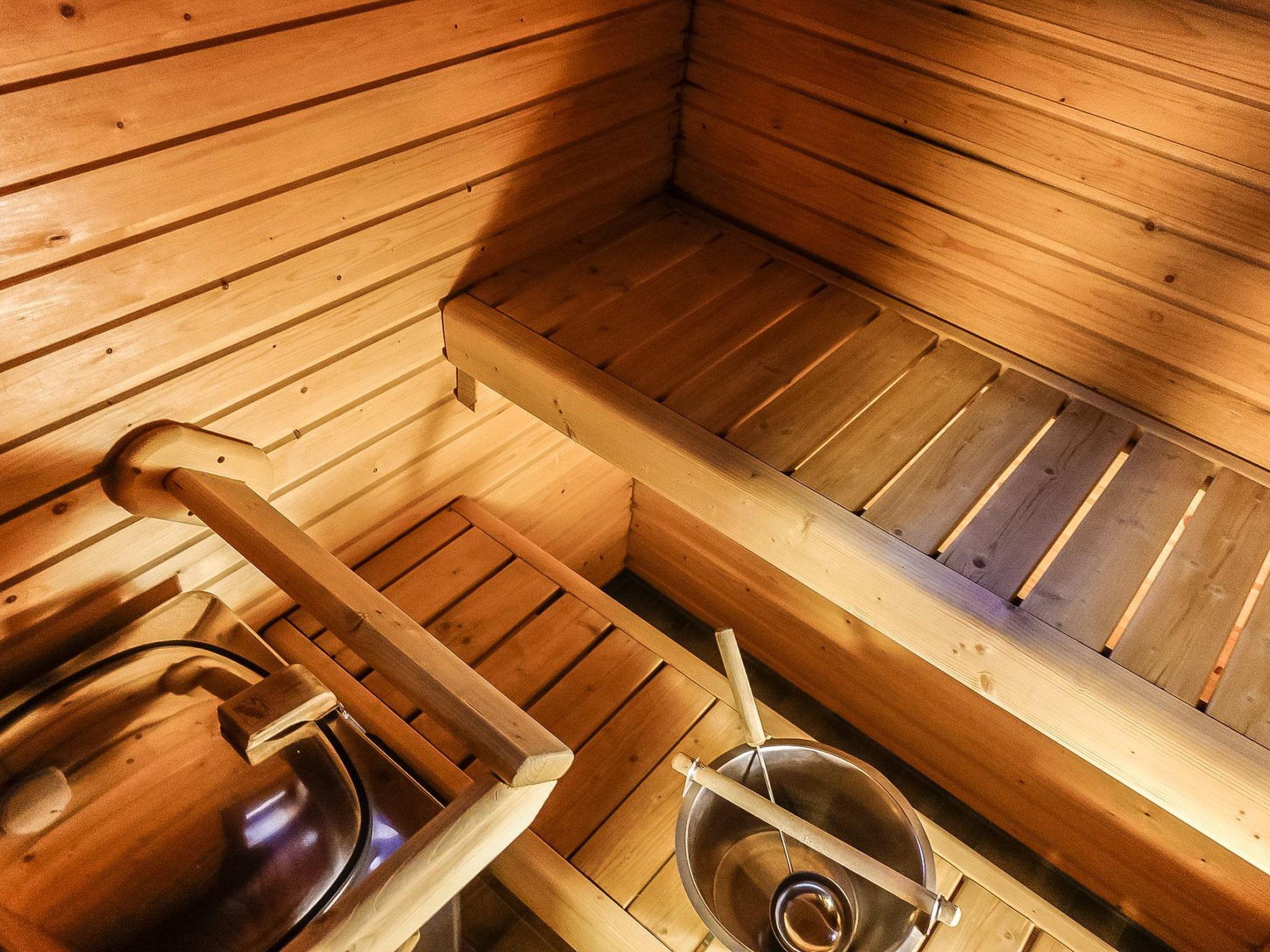 Living room/kitchen, downstairs bedroom with 2 beds, upstairs bedroom with 3 beds, upstairs lobby with 1 bed, sauna, washroom, 2 separate WCs, one upstairs. Balcony.