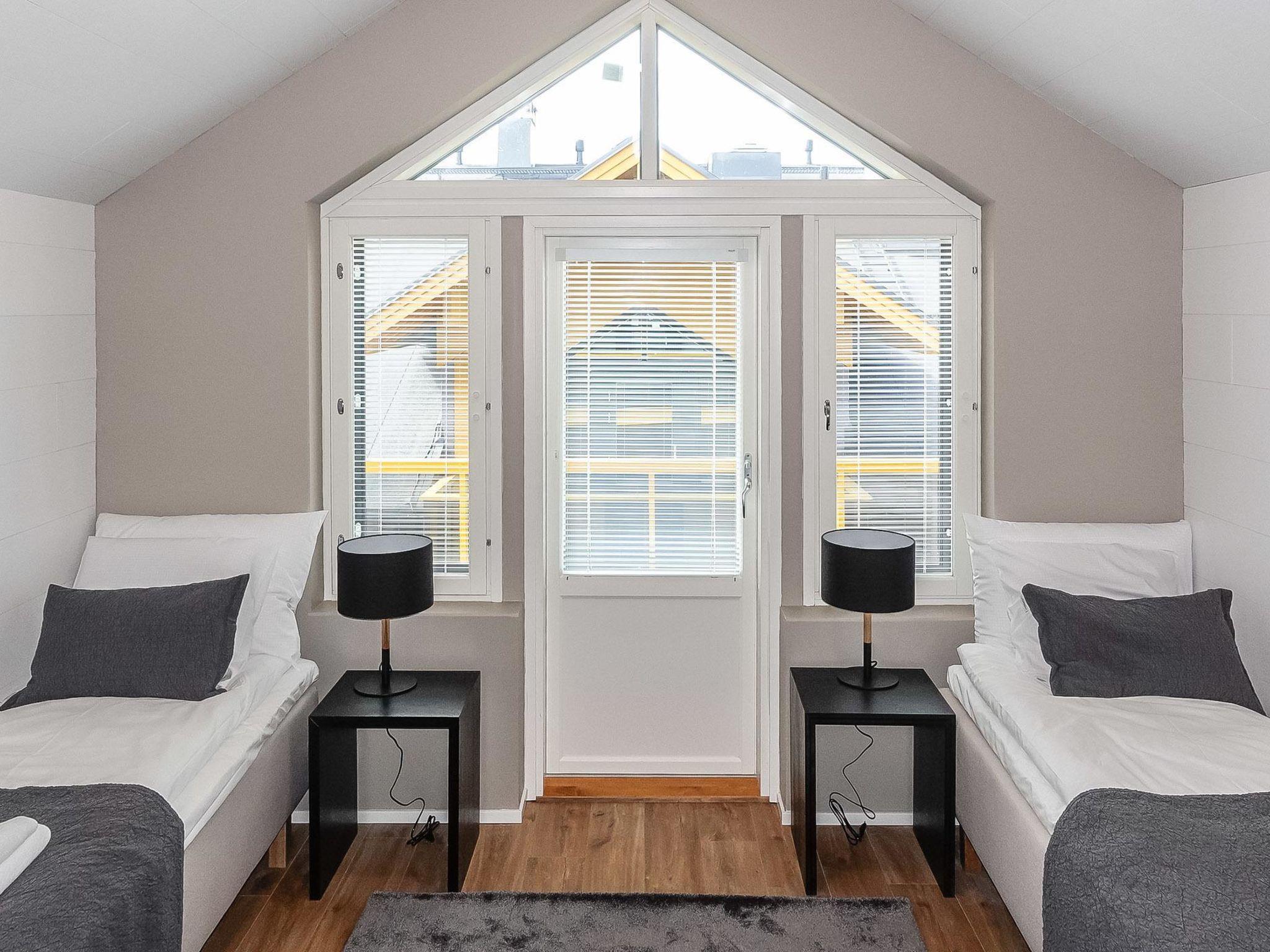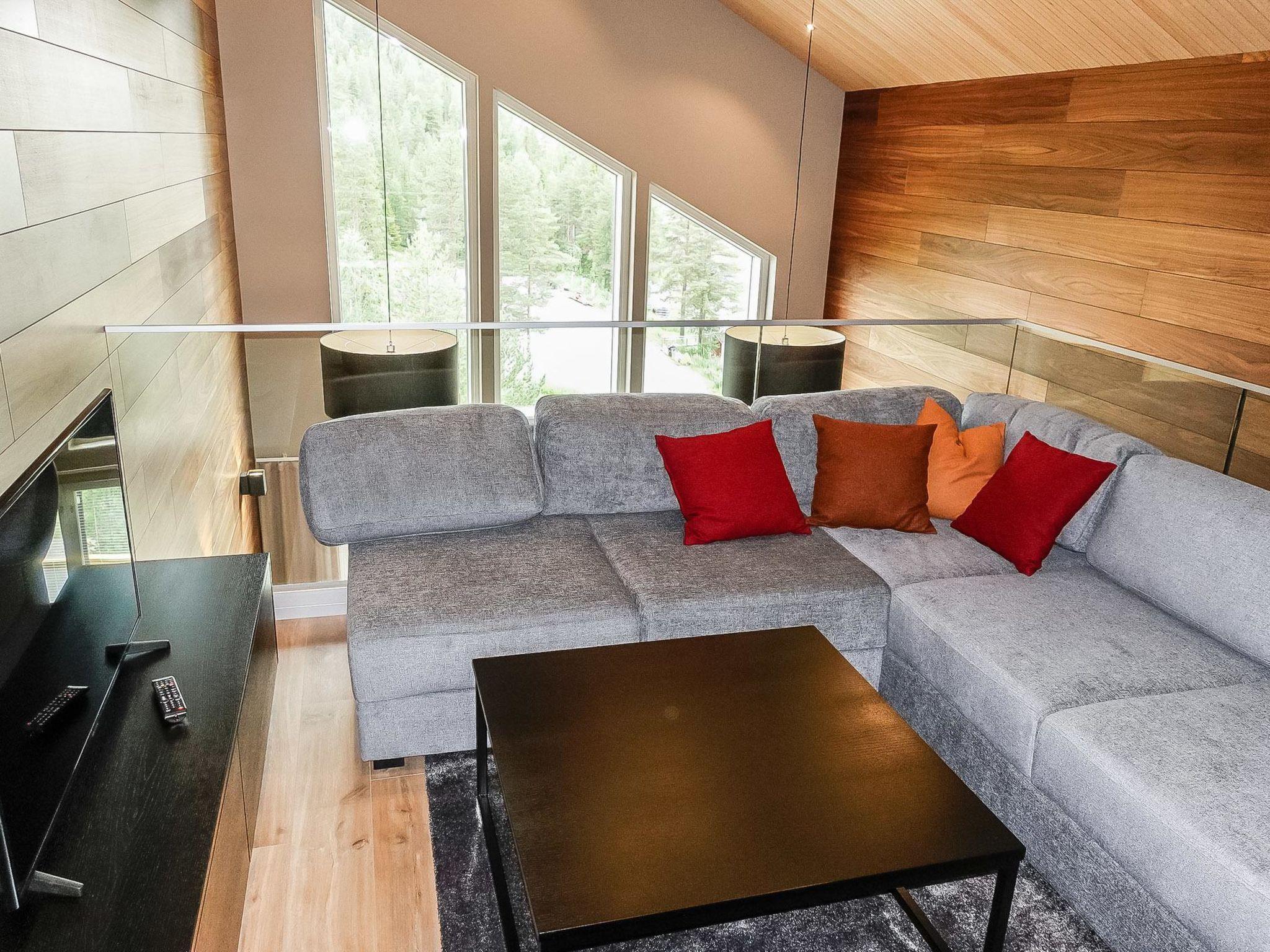 Livingroom / kitchen with aorner sofa, which can be converted into beds for 1-2 people if needed (mainly for children), three bedrooms, one with double bed and others with two single beds. One of the bedrooms is on the upper floor, access to balcony from this room. Sauna and living areas are also located on the upper floor. Upstairs living area is equipped with sofa bed, for 1-2 persons, light fireplace, kitchen with sink, fridge and cupboard. There are two WCs in the apartment, shower also in downstairs within the WC. Another is upstairs in the sauna area.
