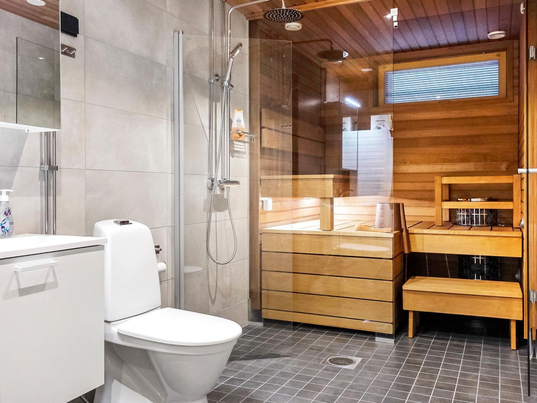 Living room with sofa bed, double bed in bedroom, kitchenette, sauna, washroom/WC and glazed balcony.
