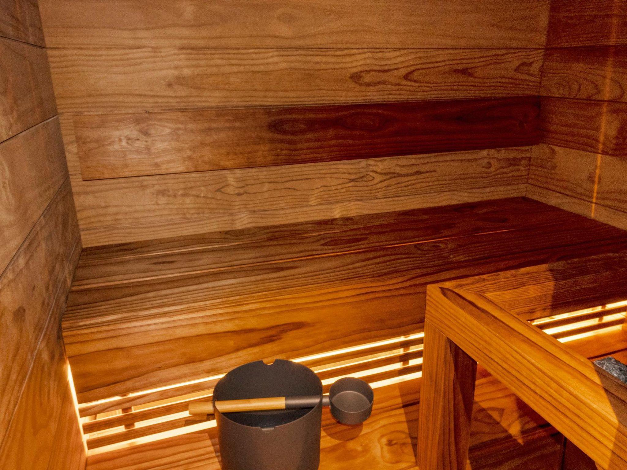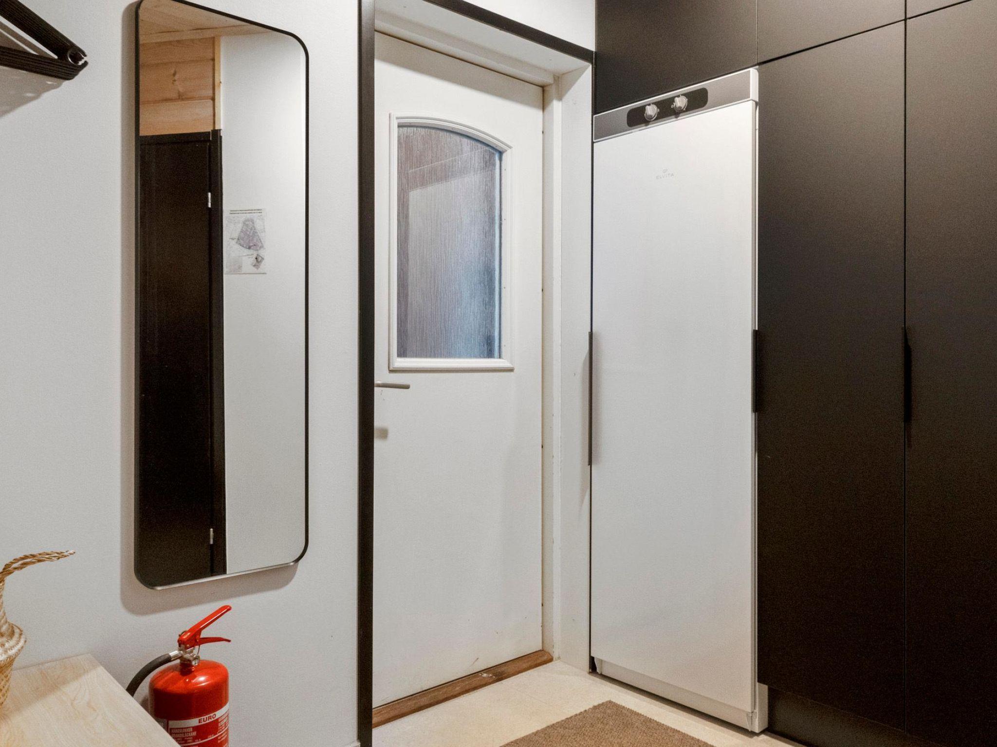 On the ground floor, sauna, washroom, fireplace room, bedroom with double bed, another bedroom with 2 separate beds, WC also downstairs.