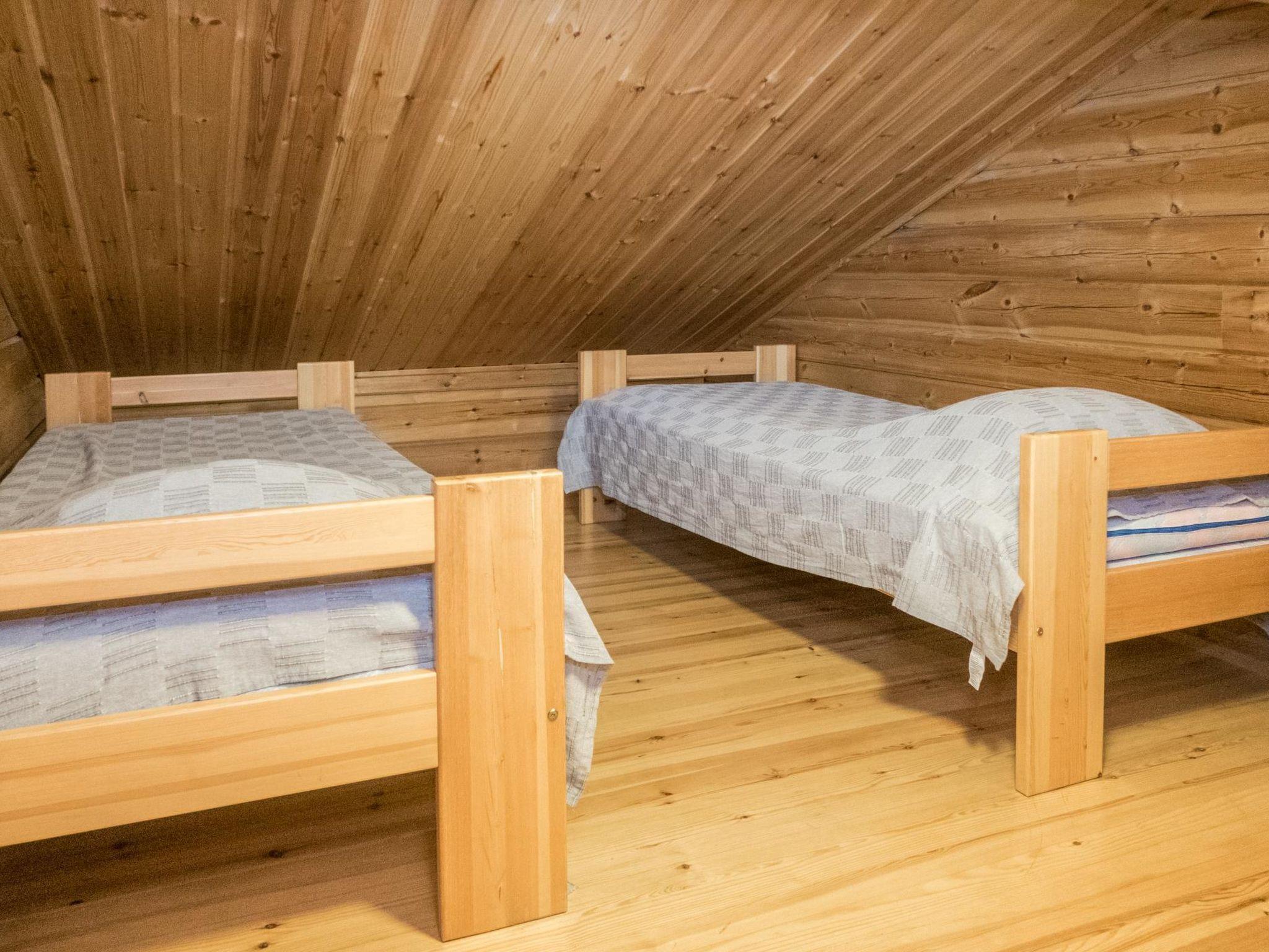 Log terraced house with three apartments, built in 1990, living room/kitchen, 2 bedrooms: 2 beds in each one (width 120 cm), sleeping loft with 4 beds, washroom, sauna (elec. stove), open porch.