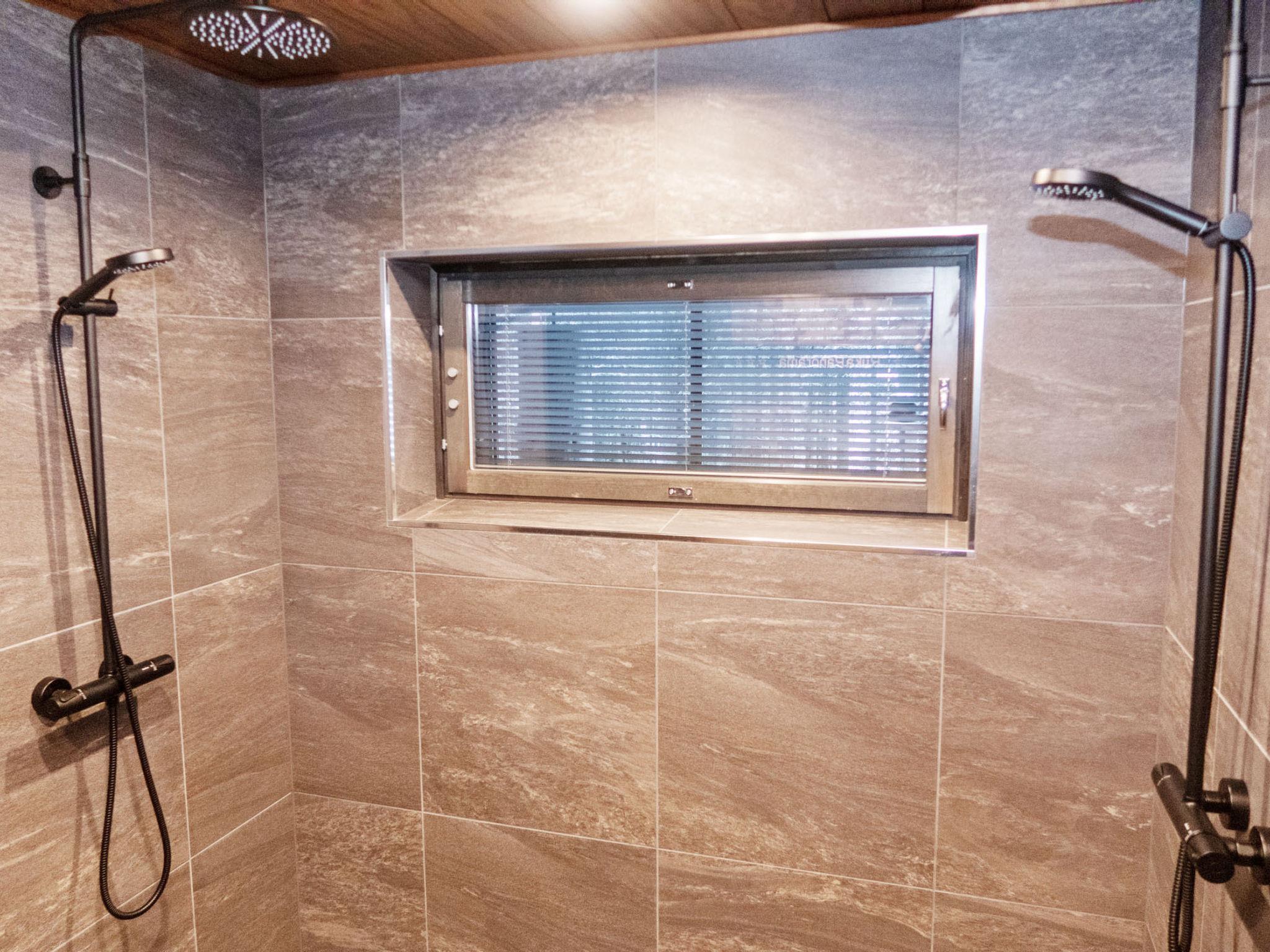 Living room/kitchen, wood-heated sauna, and electric sauna.