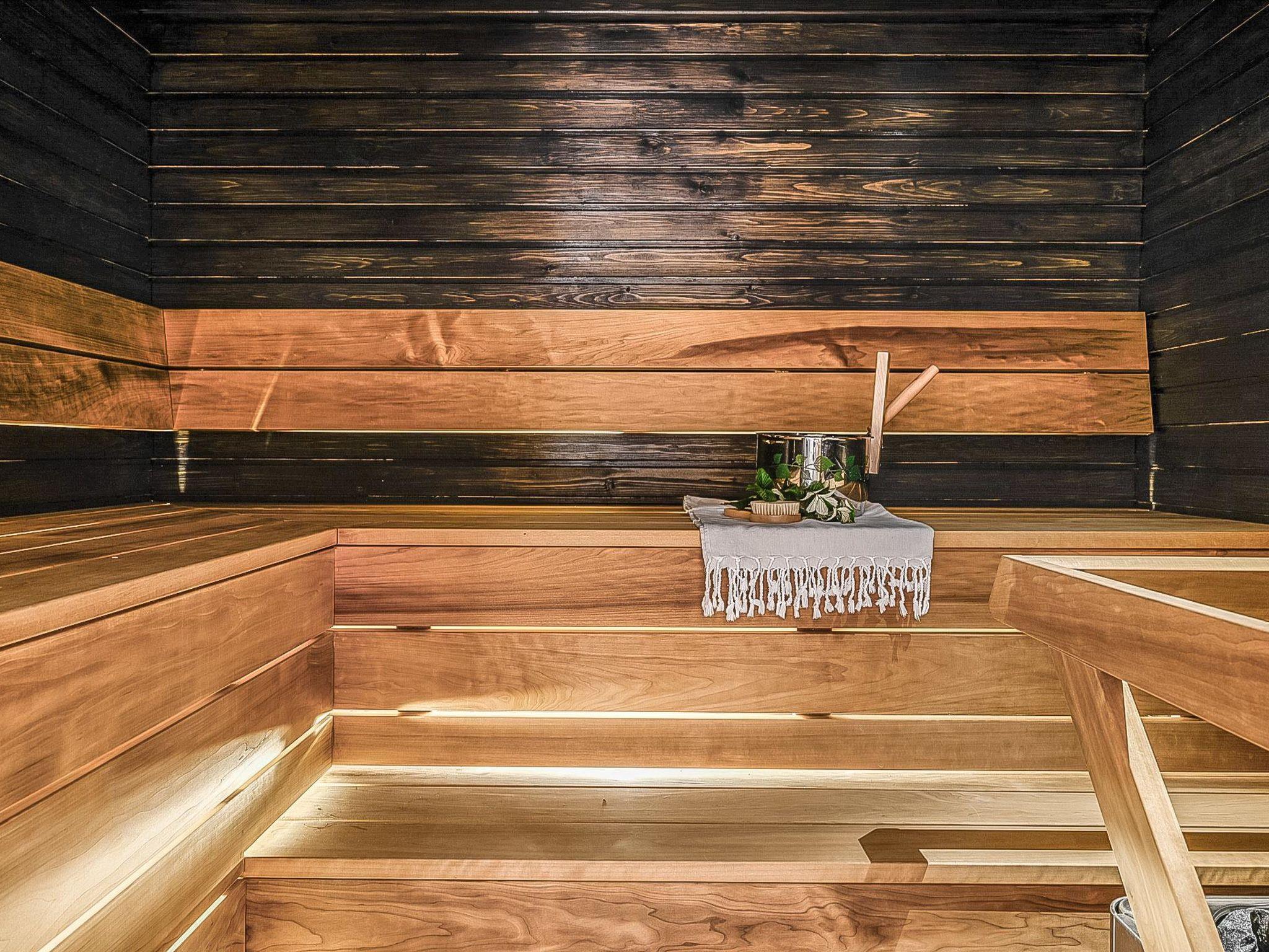 Upstairs: two bedrooms with 2 beds/bedroom. Downstairs: two bedrooms with 2 beds/bedroom, also a room with 120cm-wide bed (this room is without window, but there is a door), and a room with 3 beds (this room is also without window, but there is a door). Beds can be combined together. Combined living room/kitchen, electric sauna. Totally 3 toilets and showers. Bed linen and final cleaning are included in the price.
