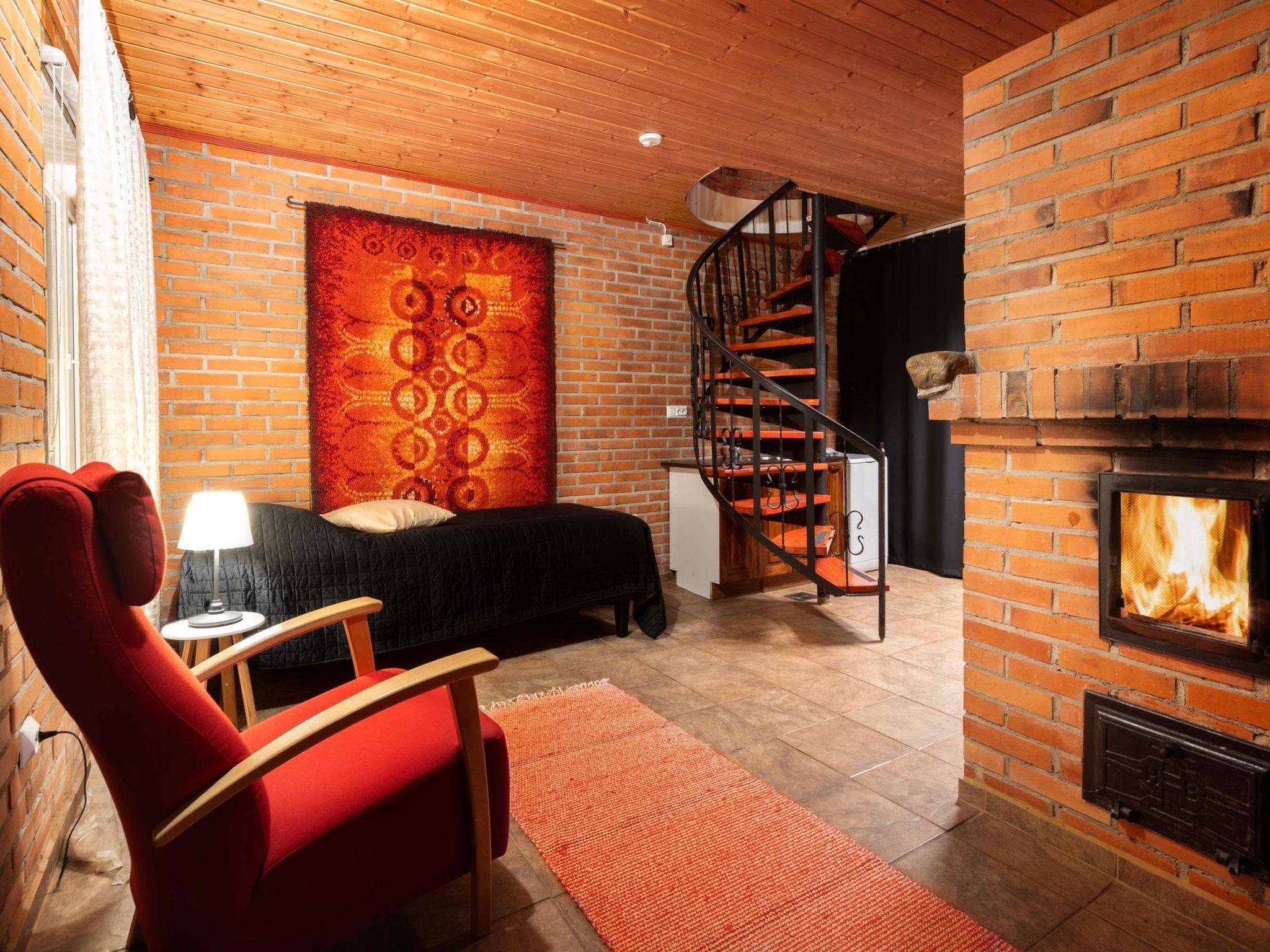 Downstairs bedroom with a separate beds that can also be made into a double bed with a single mattress pad, a sitting area, patio.