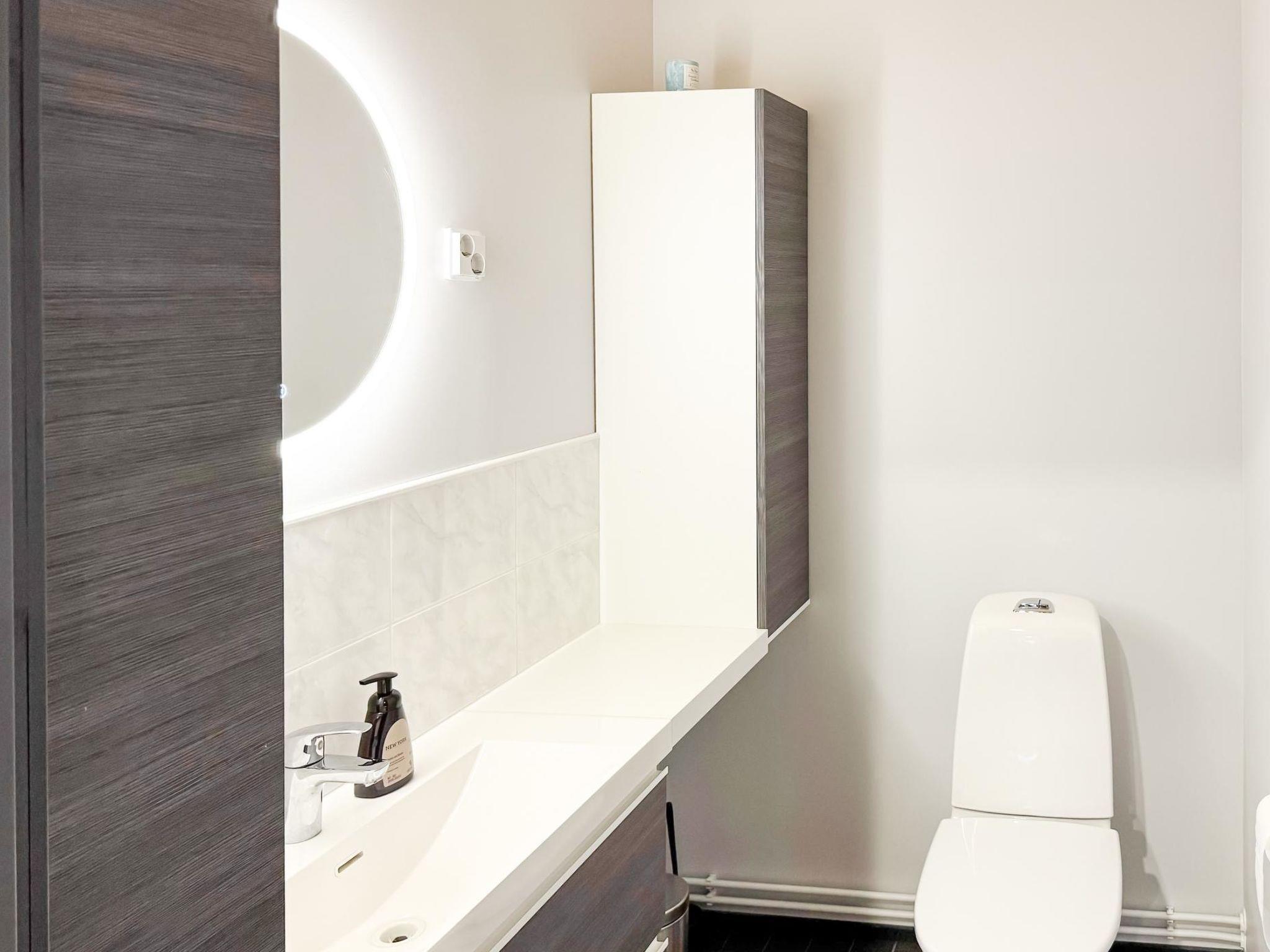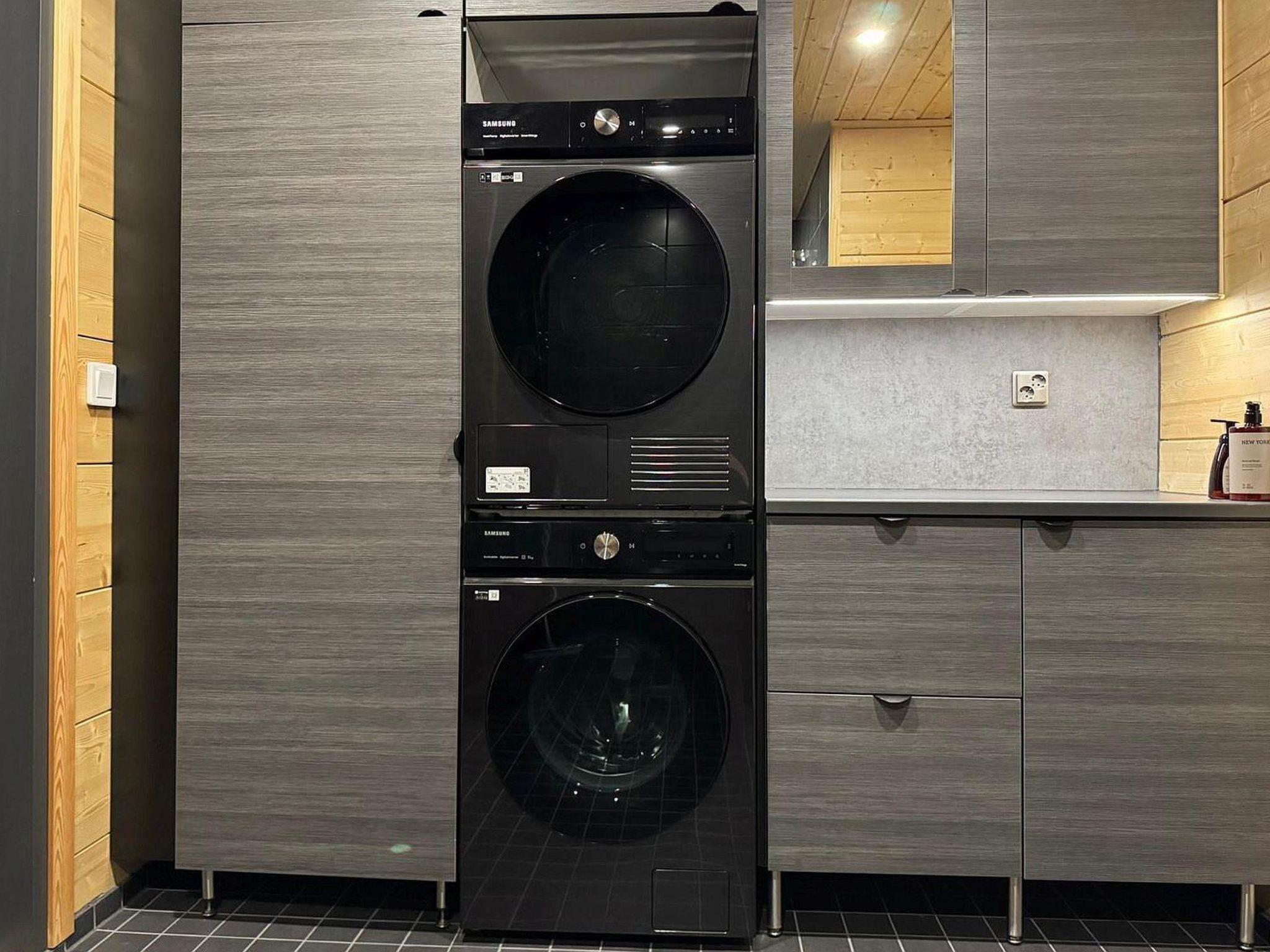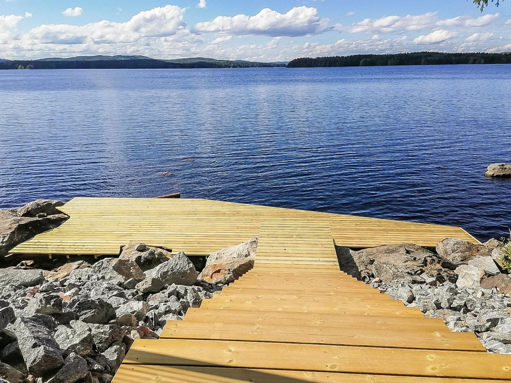 Completed in 2024, this laminated log cabin features a living room/kitchen, a bedroom with a double bed, a loft with four beds, and a remote working station with a scenic view. The wood-heated sauna has a large panoramic window facing the lake. There is also a washroom with a laundry area, a separate WC, and a spacious terrace on three sides of the house with garden furniture and a gas grill available in summer.