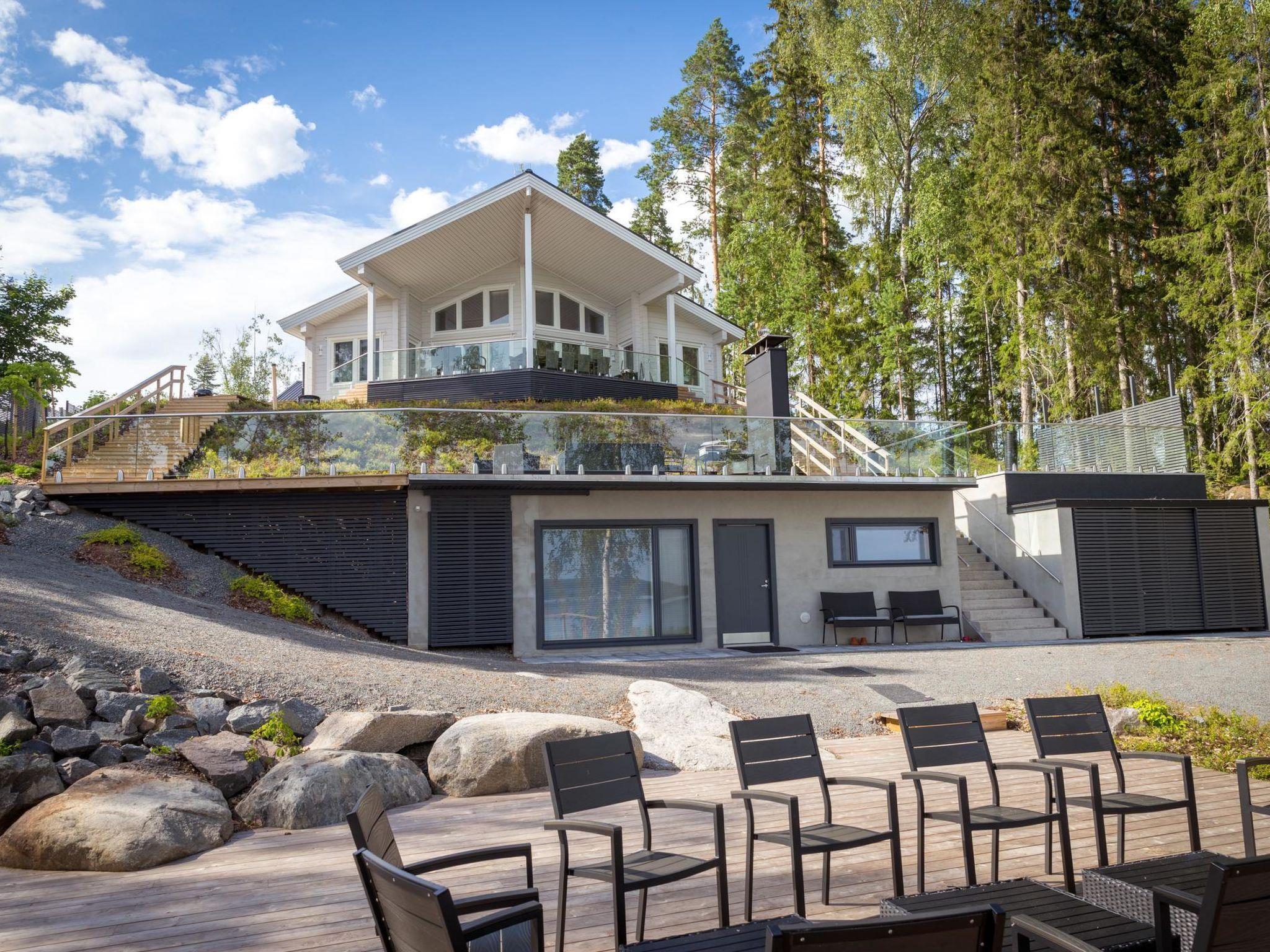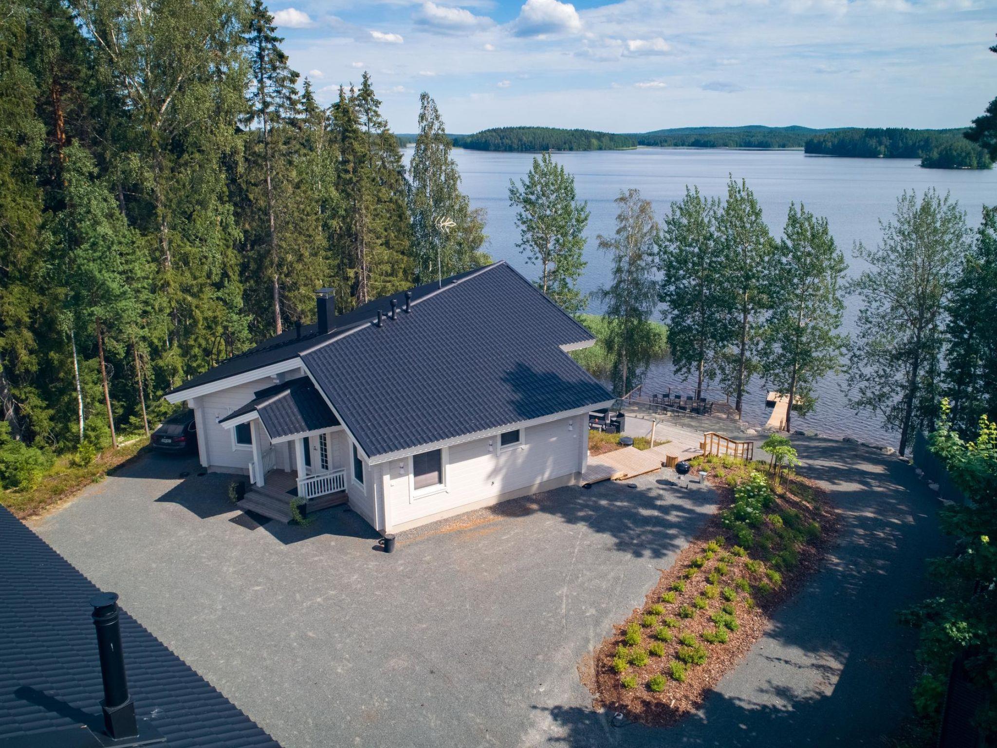 Magnificent complex of year-round leisure buildings, completed in 2020. Main building 85 m2 log villa, outbuilding 110 m2 (of which 25 m2 is in accommodation use), lakeside sauna 25 m2, car shelter 59 m2. Low stairs make easier access for people with reduced mobility to the main building, outbuilding, lakeside sauna and terraces.