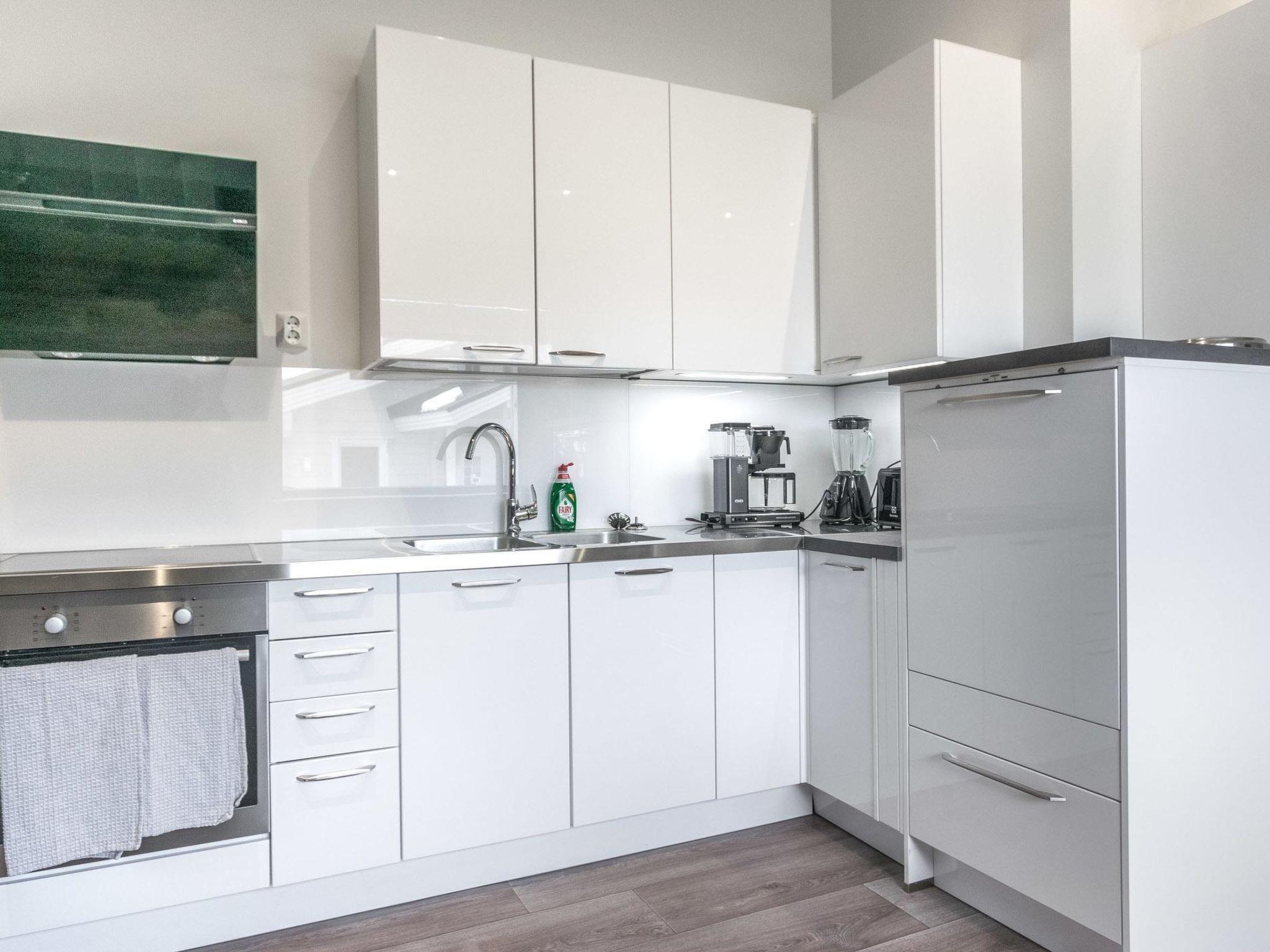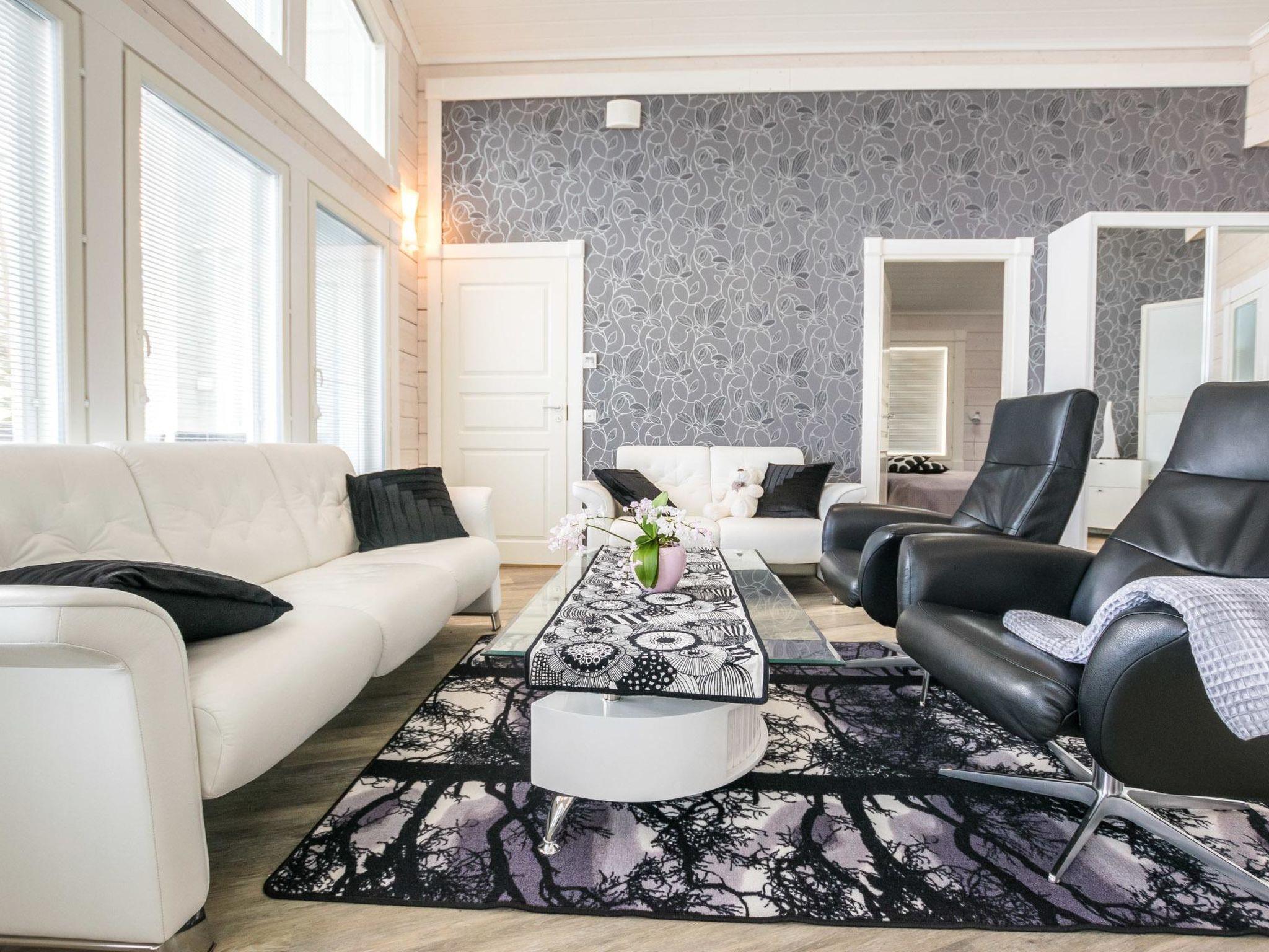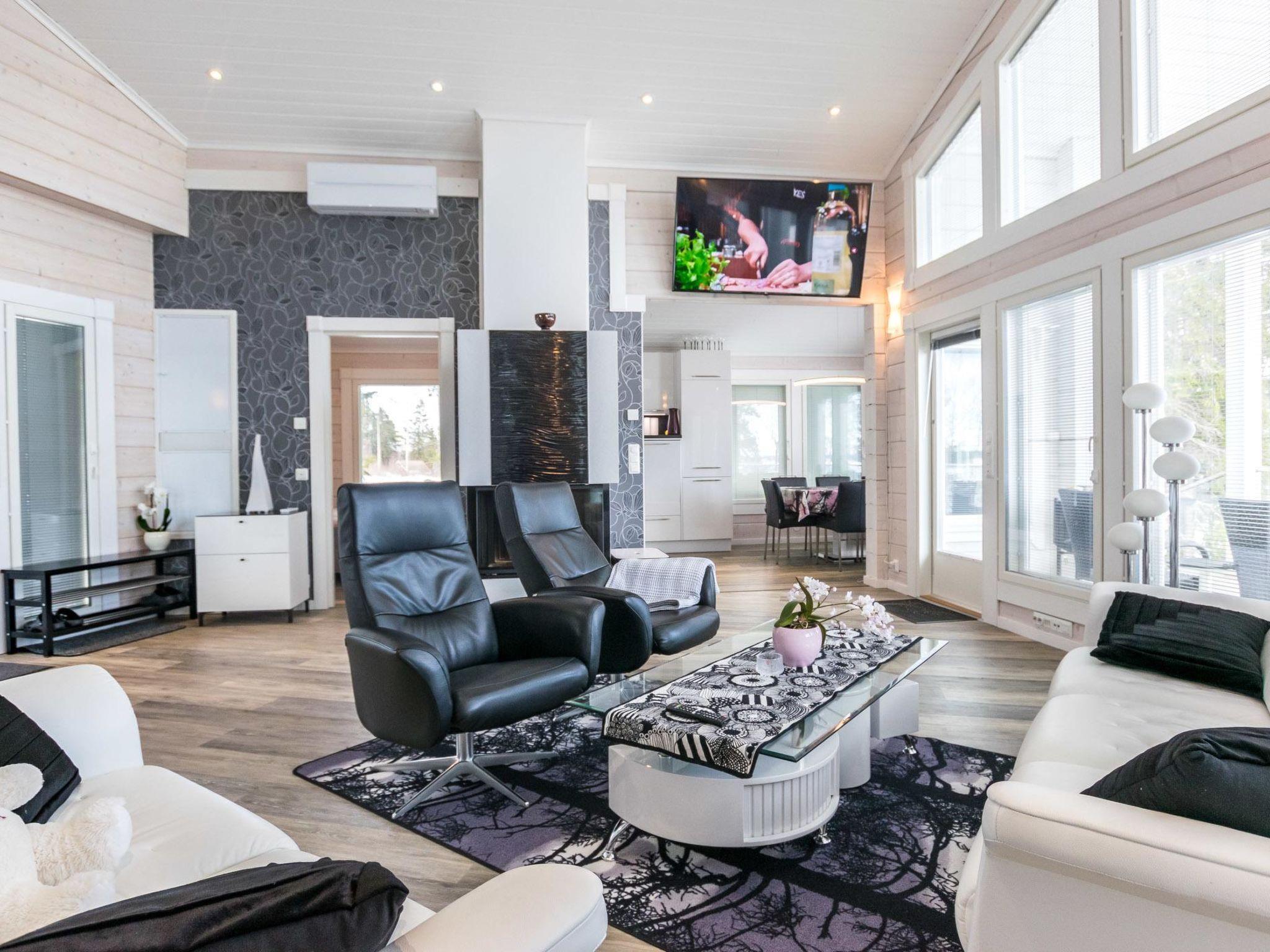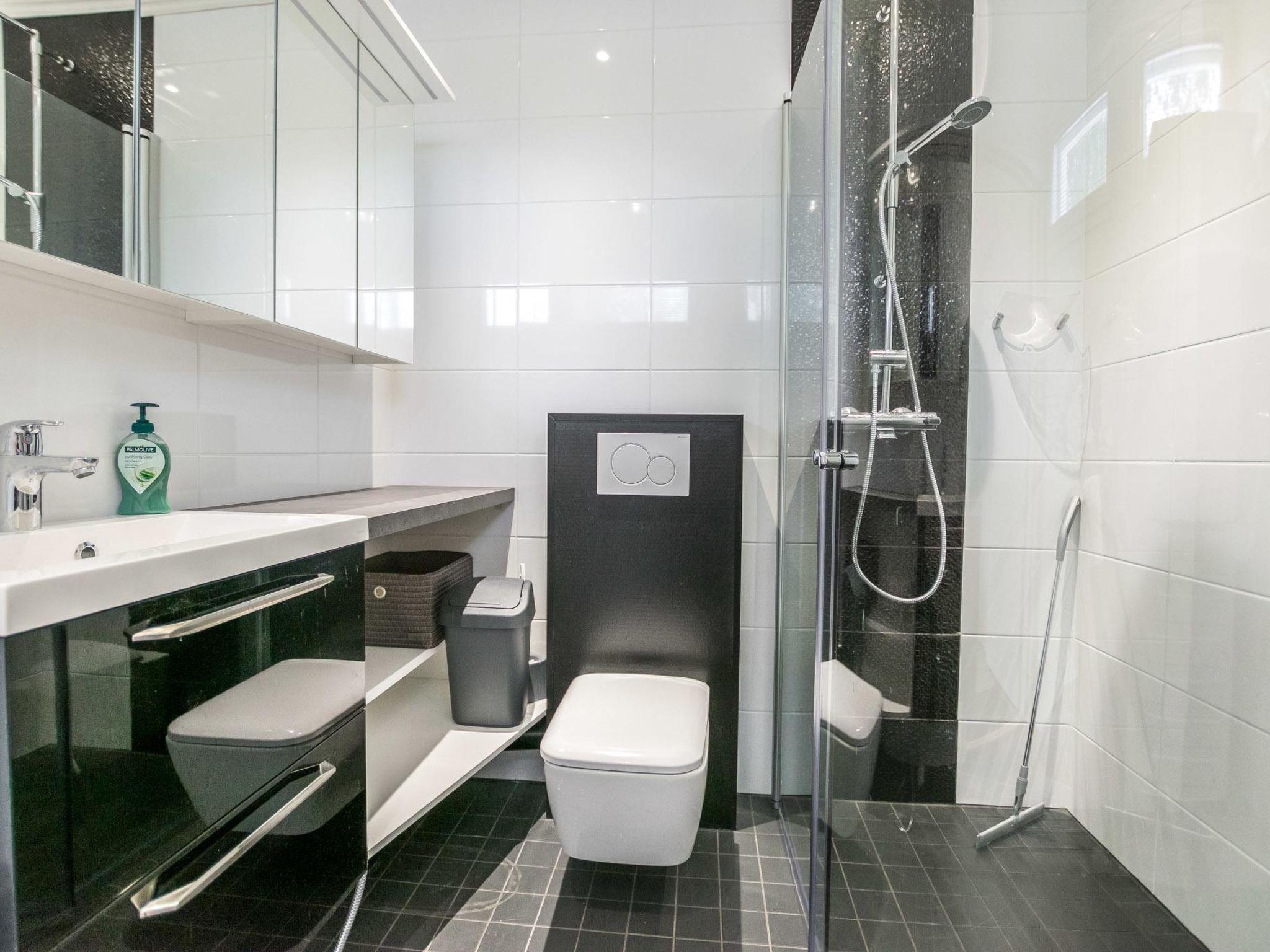 Main building with well-equipped kitchen, living room, 2 bedrooms, both with double beds. WC, washroom (2 showers), sauna (electric sauna stove), fireplace, air source heat pump, mechanical ventilation, large terrace (access to the cabin with wheelchair). Kitchen with induction stove/oven, wood stove/oven, hood, fridge-freezer and dishwasher.