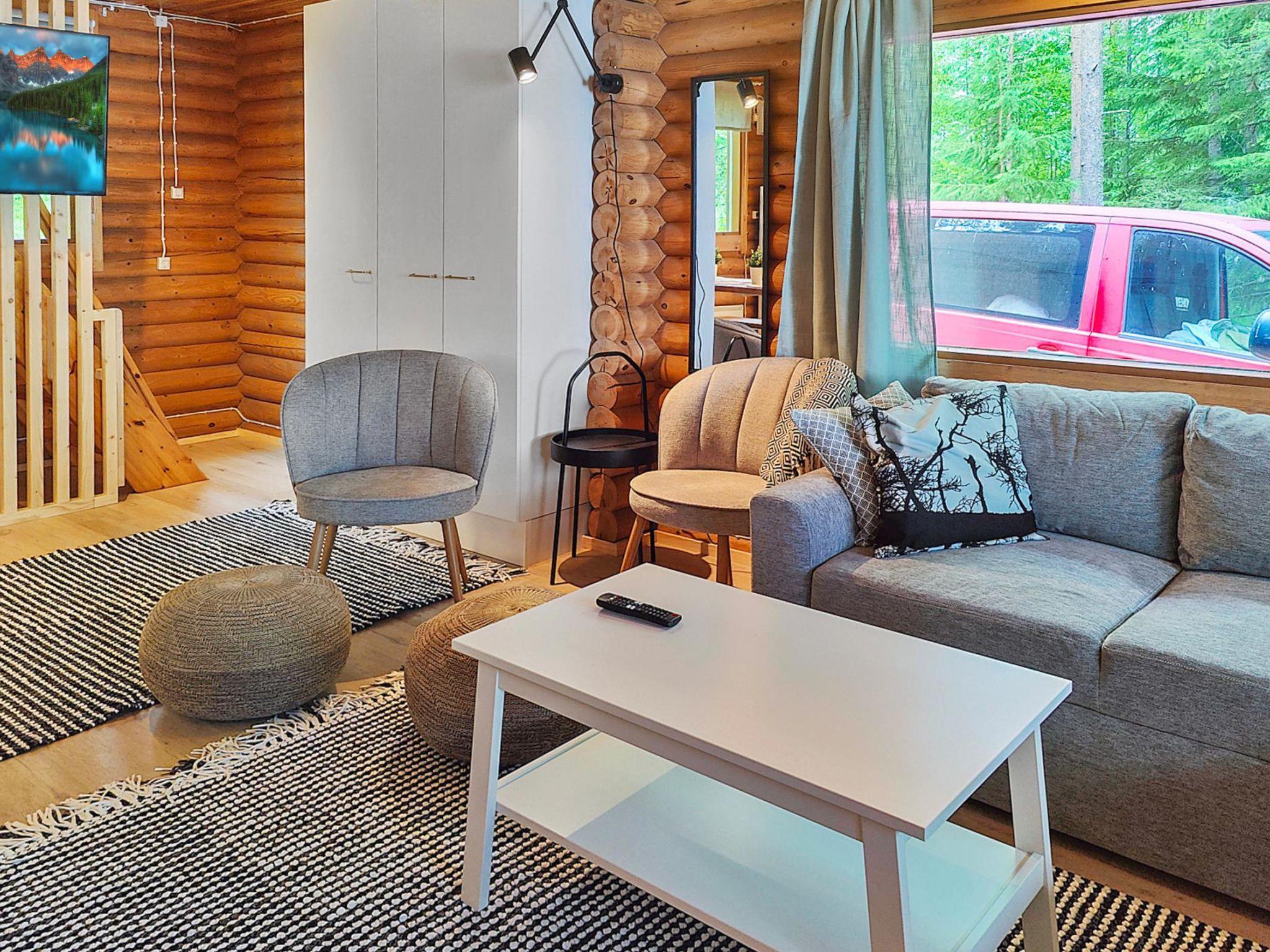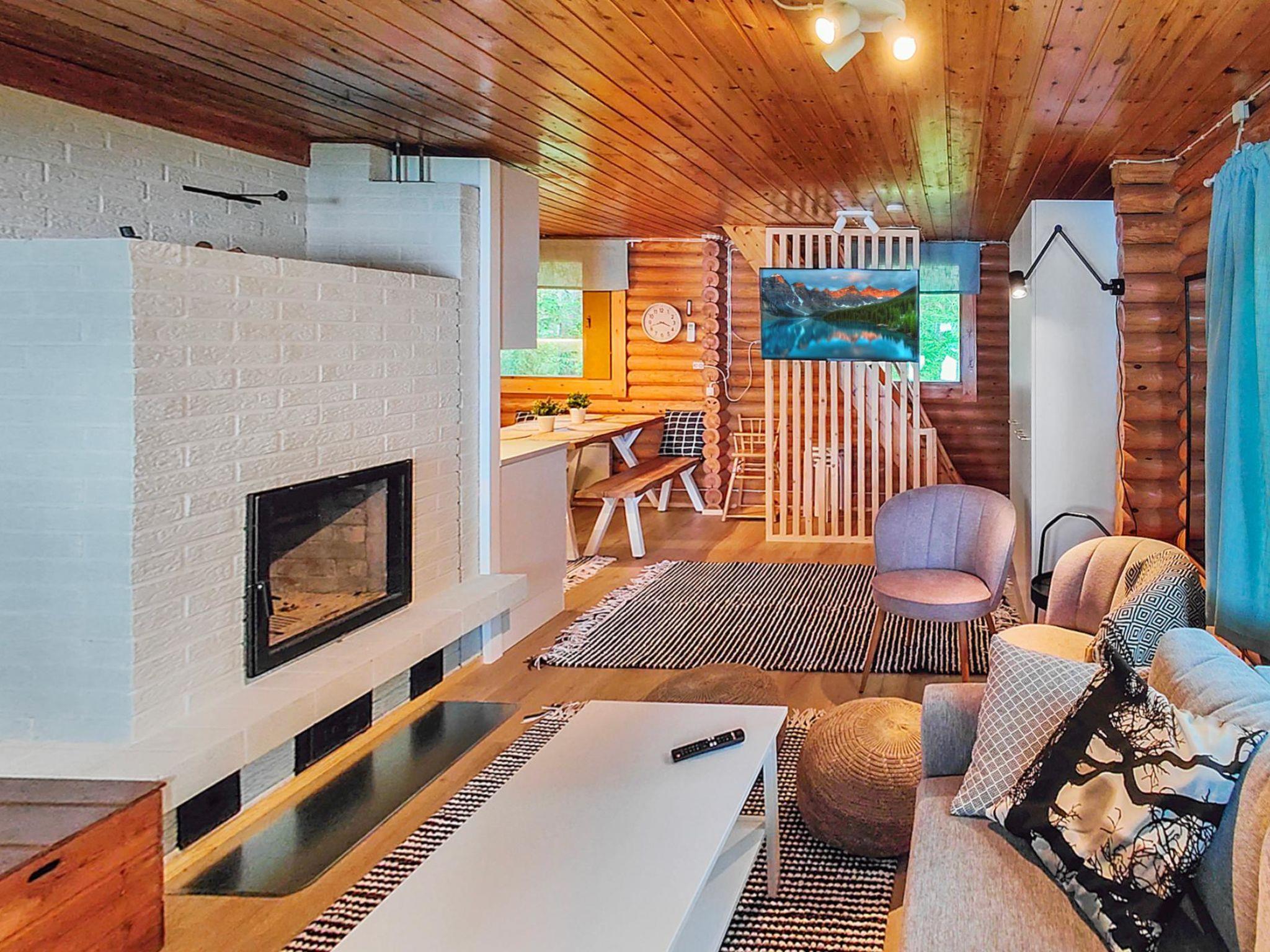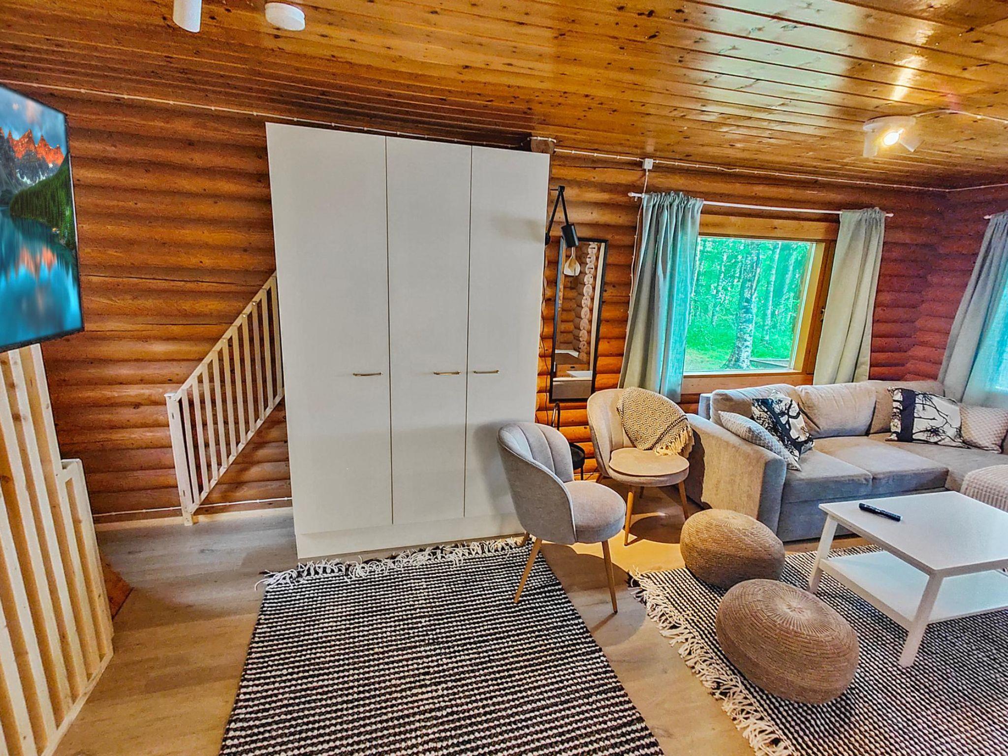 Downstairs: living room/kitchen with sofa bed, dressing room, sauna, open veranda.