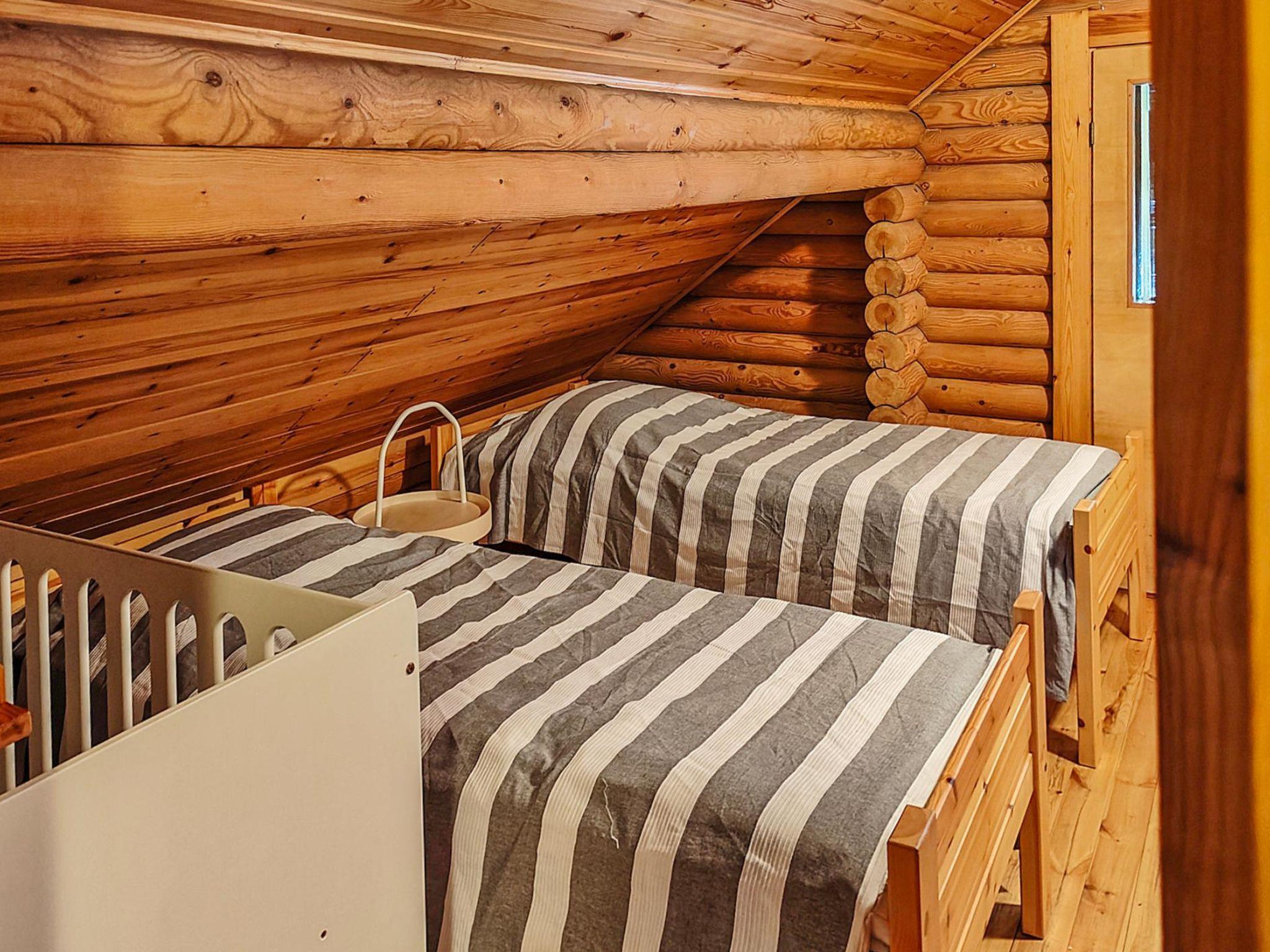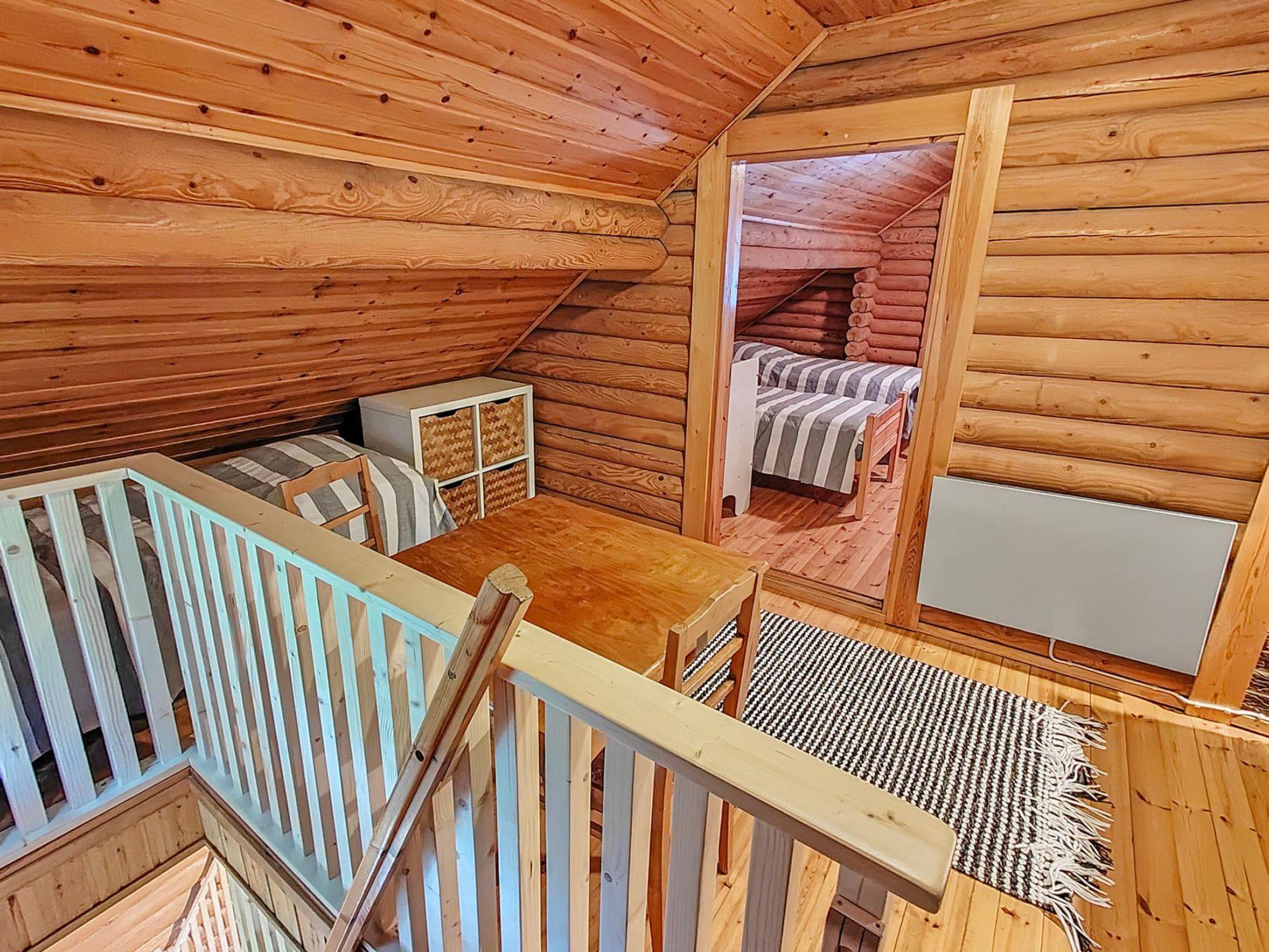Upstairs: bedroom with one double bed and 2 single beds and crib, lobby with 3 beds, balcony.