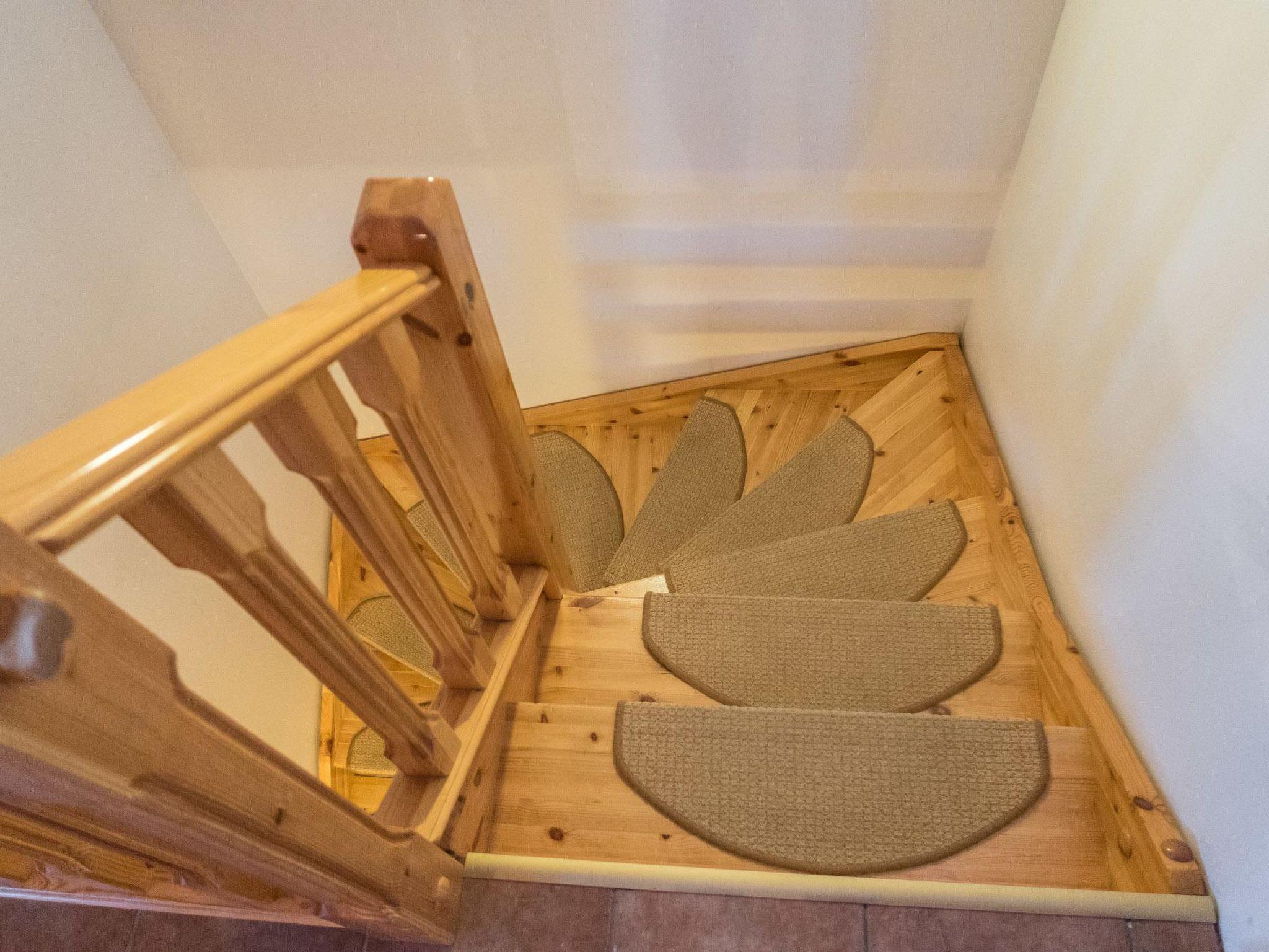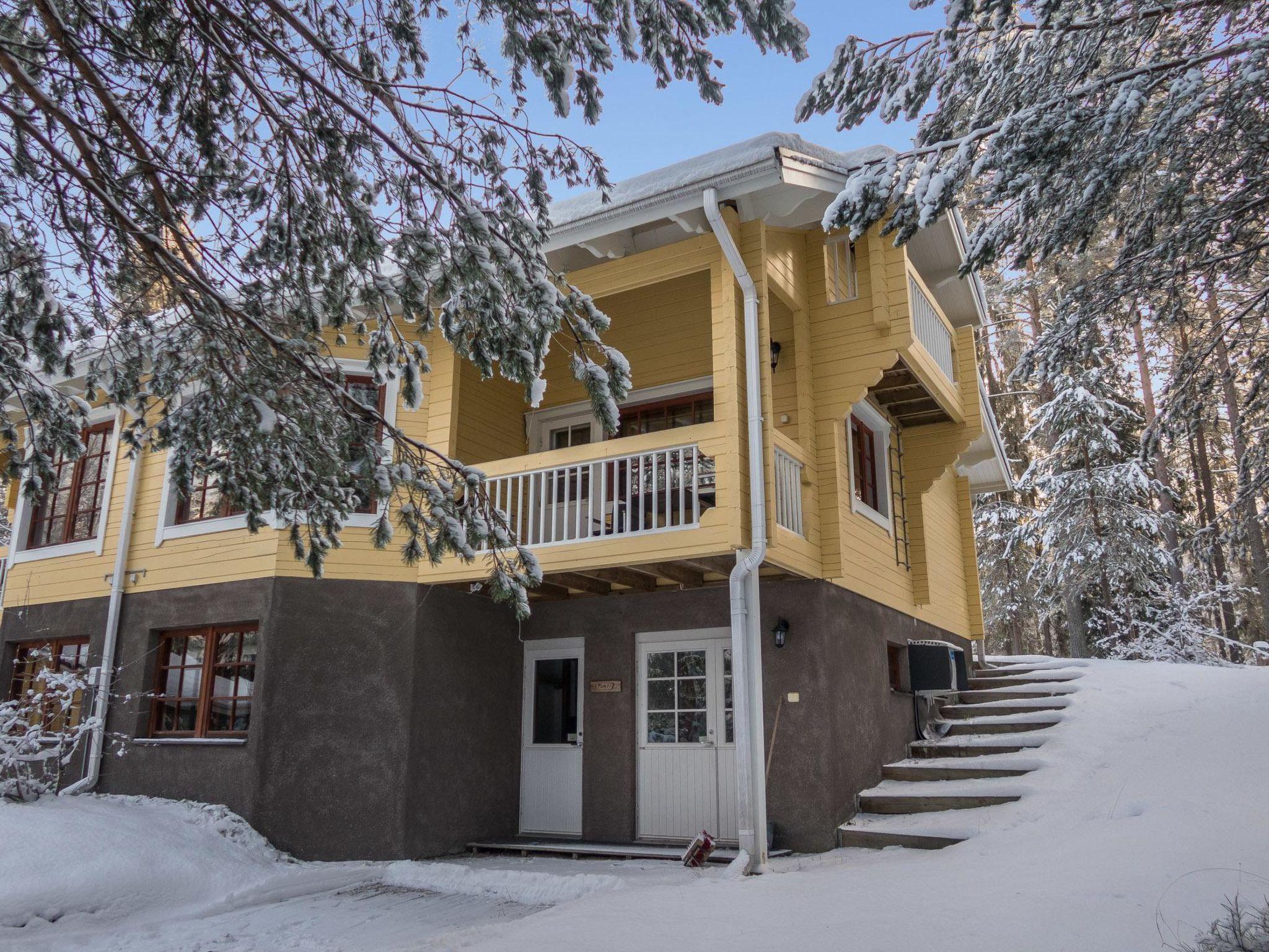 This apartment in log-made semi-detached house in Vuokatti ski slope area was completed in 1999. Floor area 90 m², loft 20 m². On the ground floor there is fireroom with sofa bed for 1-2 persons and bedroom for three persons with bunkbed (lower bed can be enlarged for two). Sauna (electric heating), washroom, toilet. Upstairs there is kitchen, living room, one bedroom with twin bed and shower/toilet. Loft with separate beds for three. Balcony. Wifi.