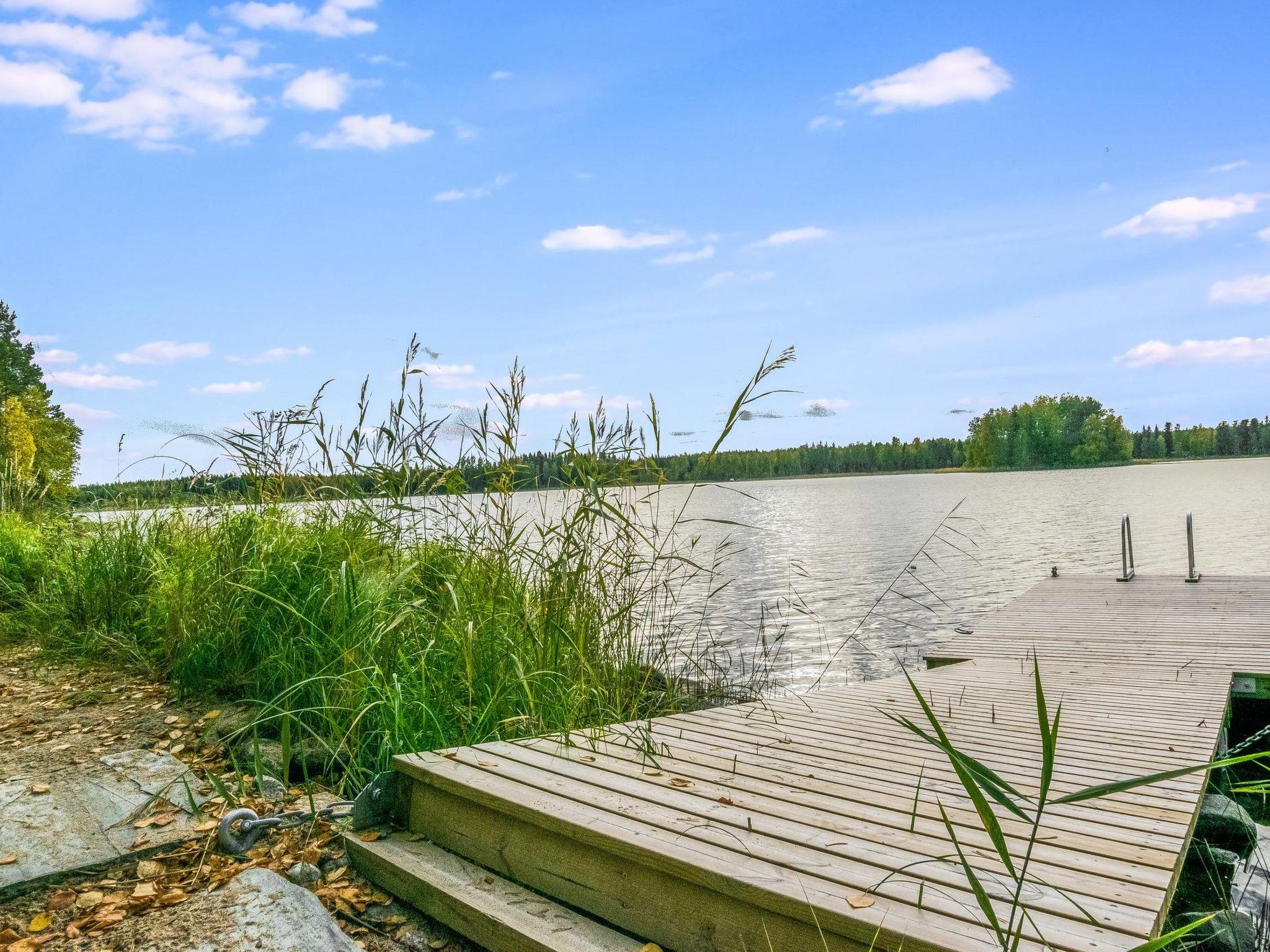 122 km to the north from Jyväskylä, lake Keitele 30 m, shallow sand-bottomed beach with some stones and gravel, 2 own piers and rowing boat. Kelo-log cabin (2021). On the ground floor, living room / sauna facilities (electric sauna stove), shower, hydro massage bath, WC and washing machine with drying functionality. In the living room, there is sofa, fireplace, 70" TV.