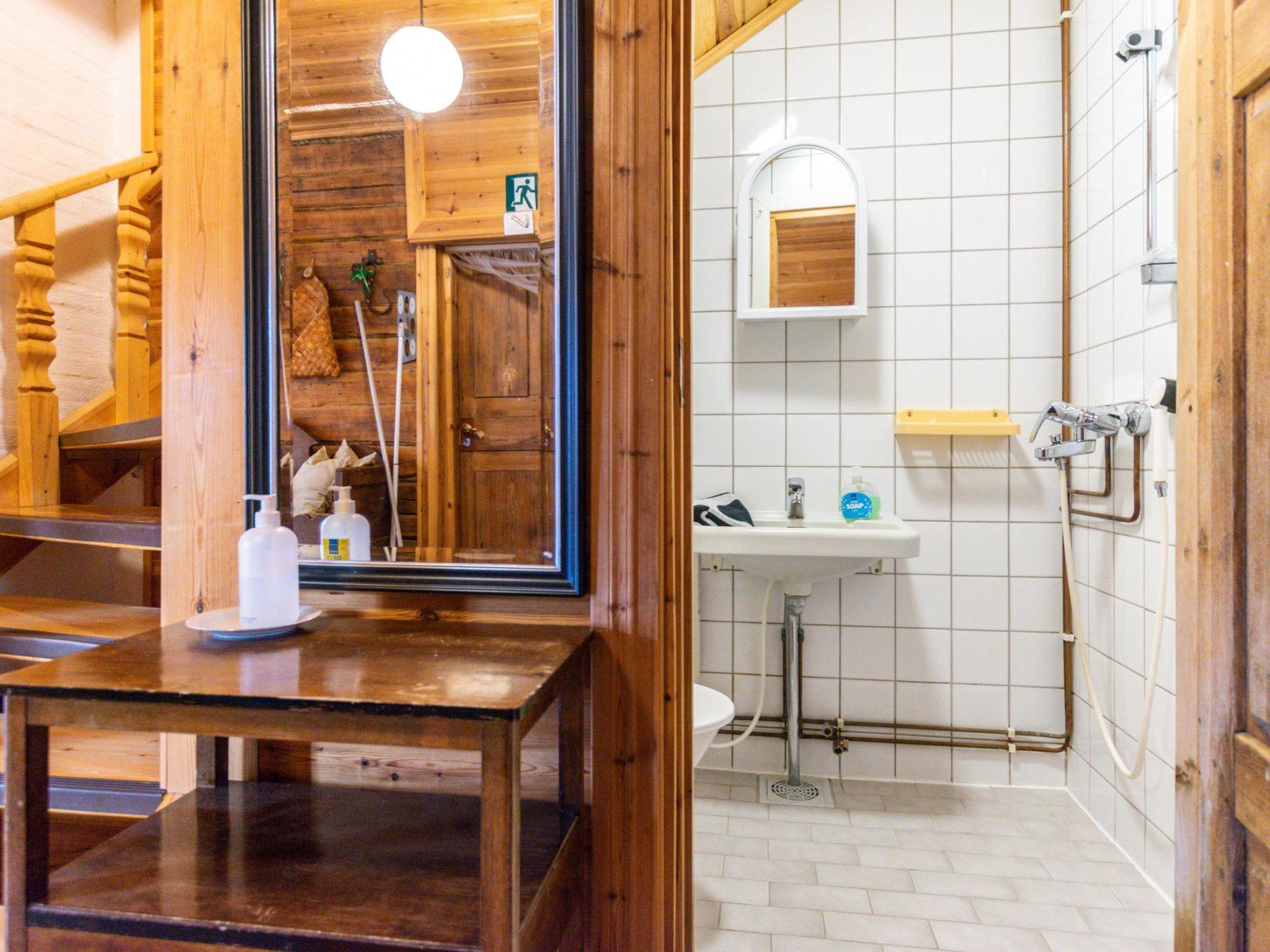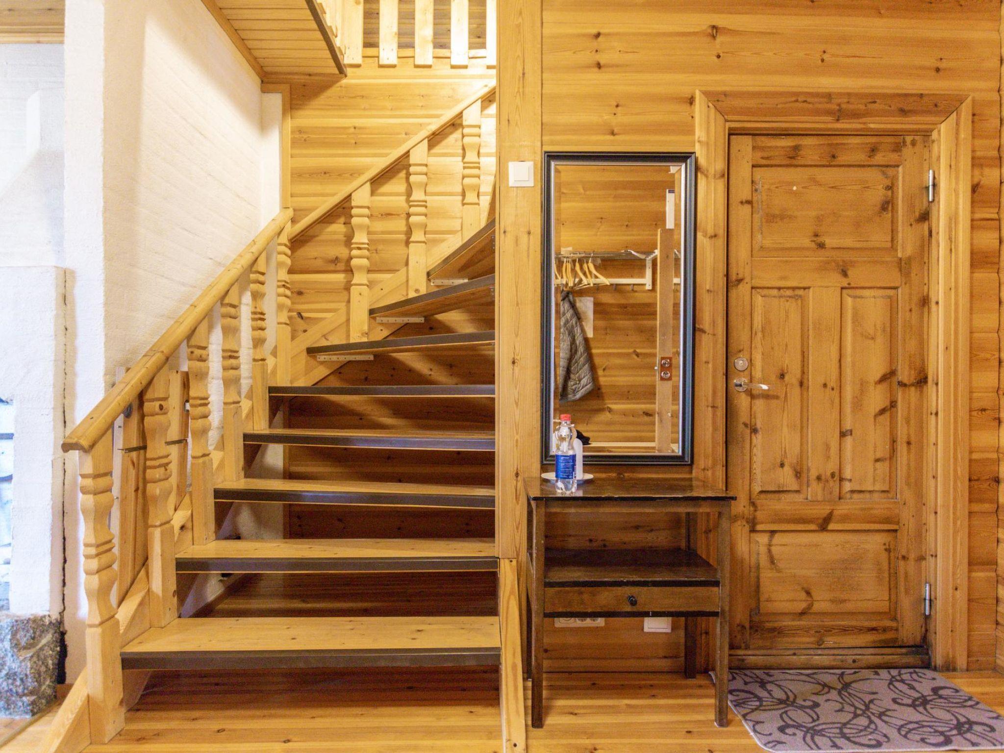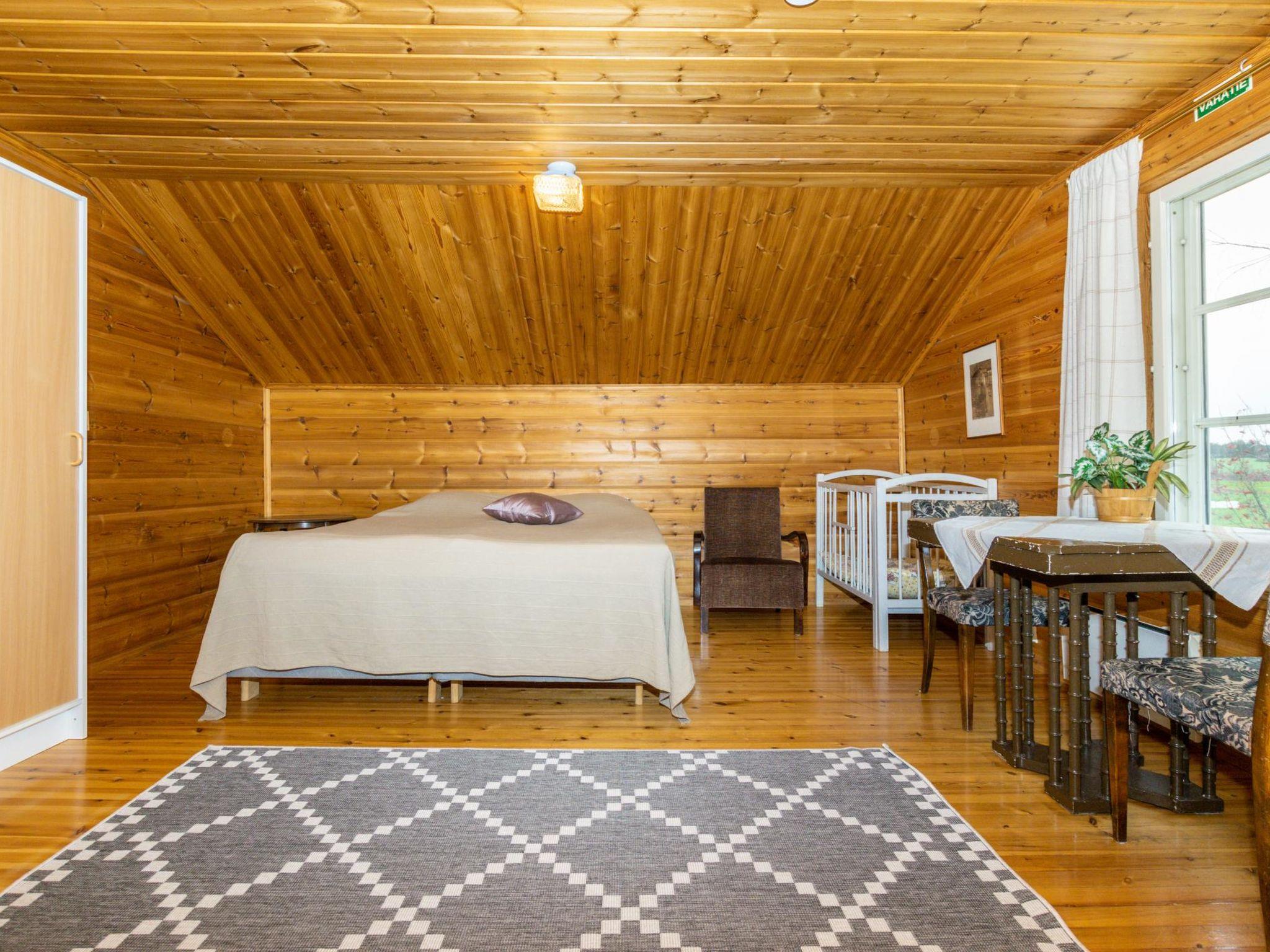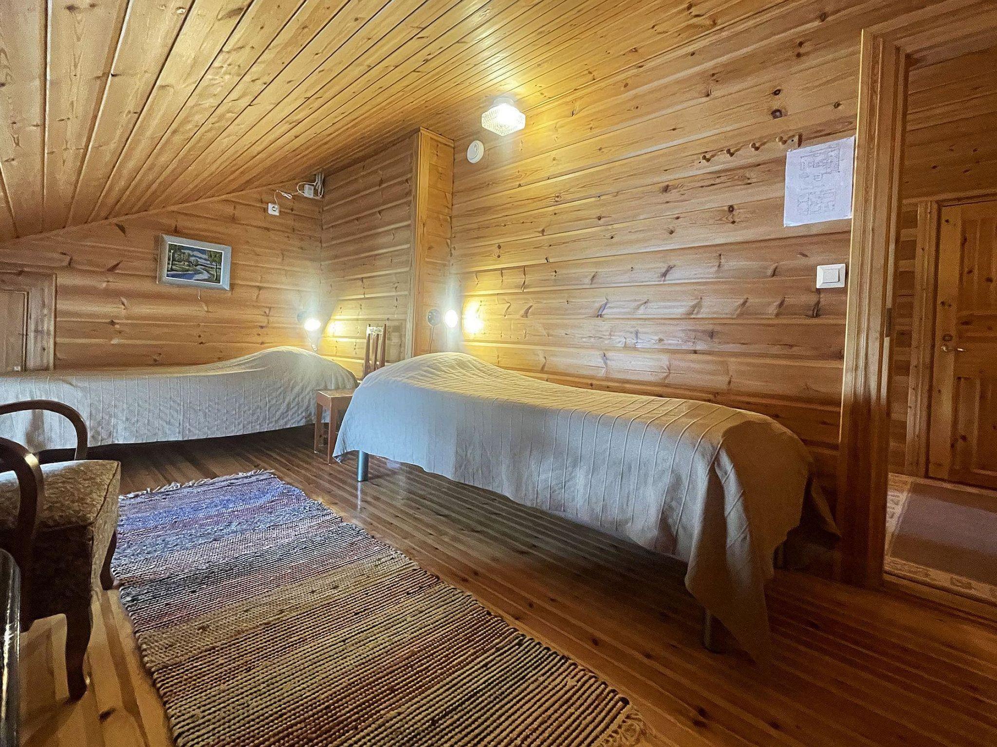 Log-built cabin. On the ground floor, spacious living room, kitchen, 2 bedrooms (both with two beds), WC with shower. On the upper floor, two bedrooms, one with two beds and another with double bed and two single beds, sauna (electric sauna stove), WC / washroom and dressing room. In the backyard, there is a covered cooking area with solid masonry grill.