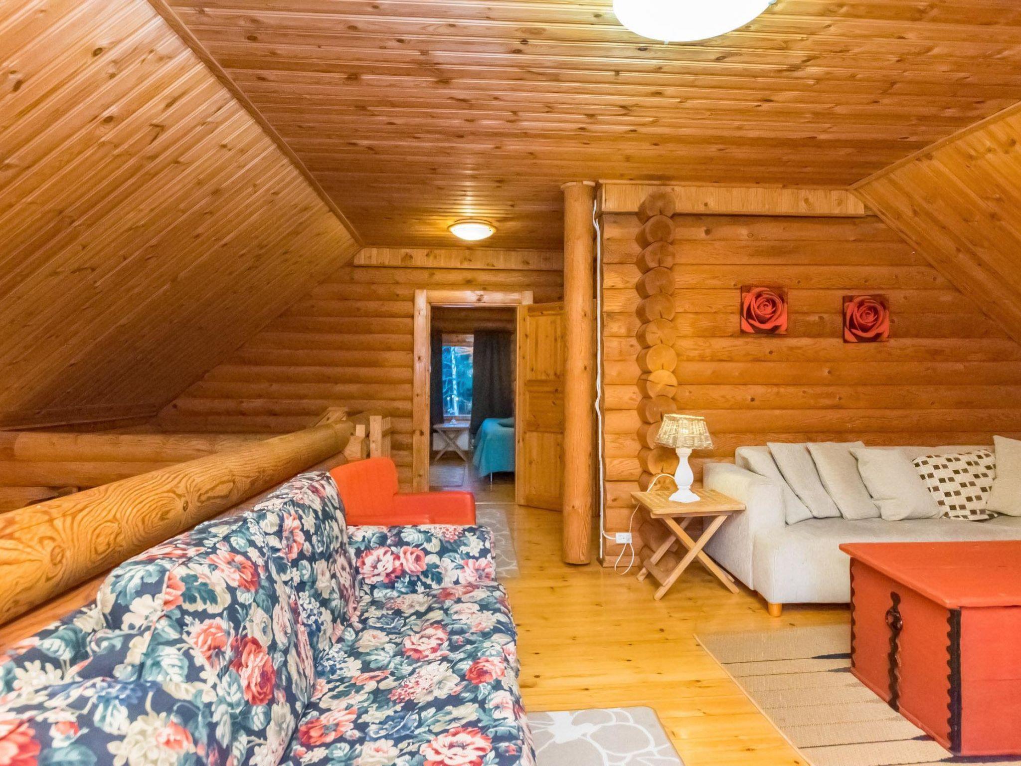 The ground floor features a living area, kitchen (renovated in 2018), a bedroom with two beds, a dressing room, a washroom with a shower and WC, and a sauna with a wood-burning stove (the sauna and washroom were renovated in 2024). There is also a covered porch. The dining table can be extended and there are totally 8 chairs.