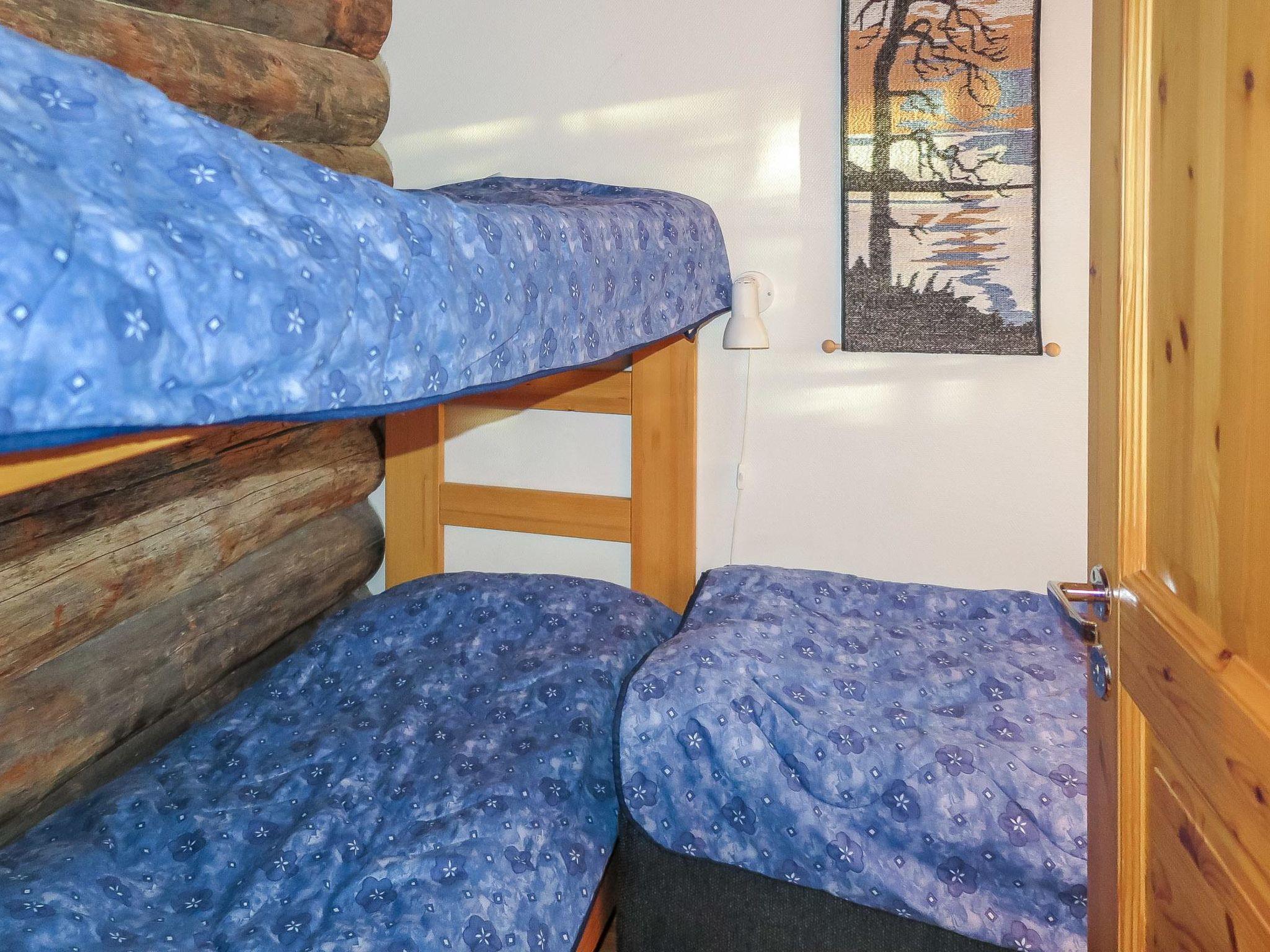 40 km North-East of Kolari, lake Ylläsjärvi 2,5 km, swimming beach 4 km. Log duplex apartment 1988. Livingroom/kitchen, two bedrooms, on with a double bed and on with a bunk bed, loft (17 m², sloping ceilings, highest point 2 m) with 4 mattresses. Electric sauna, shower, separate toilet. Open porch.