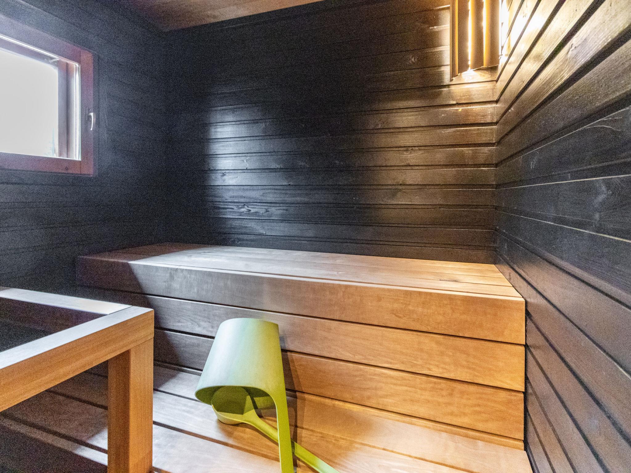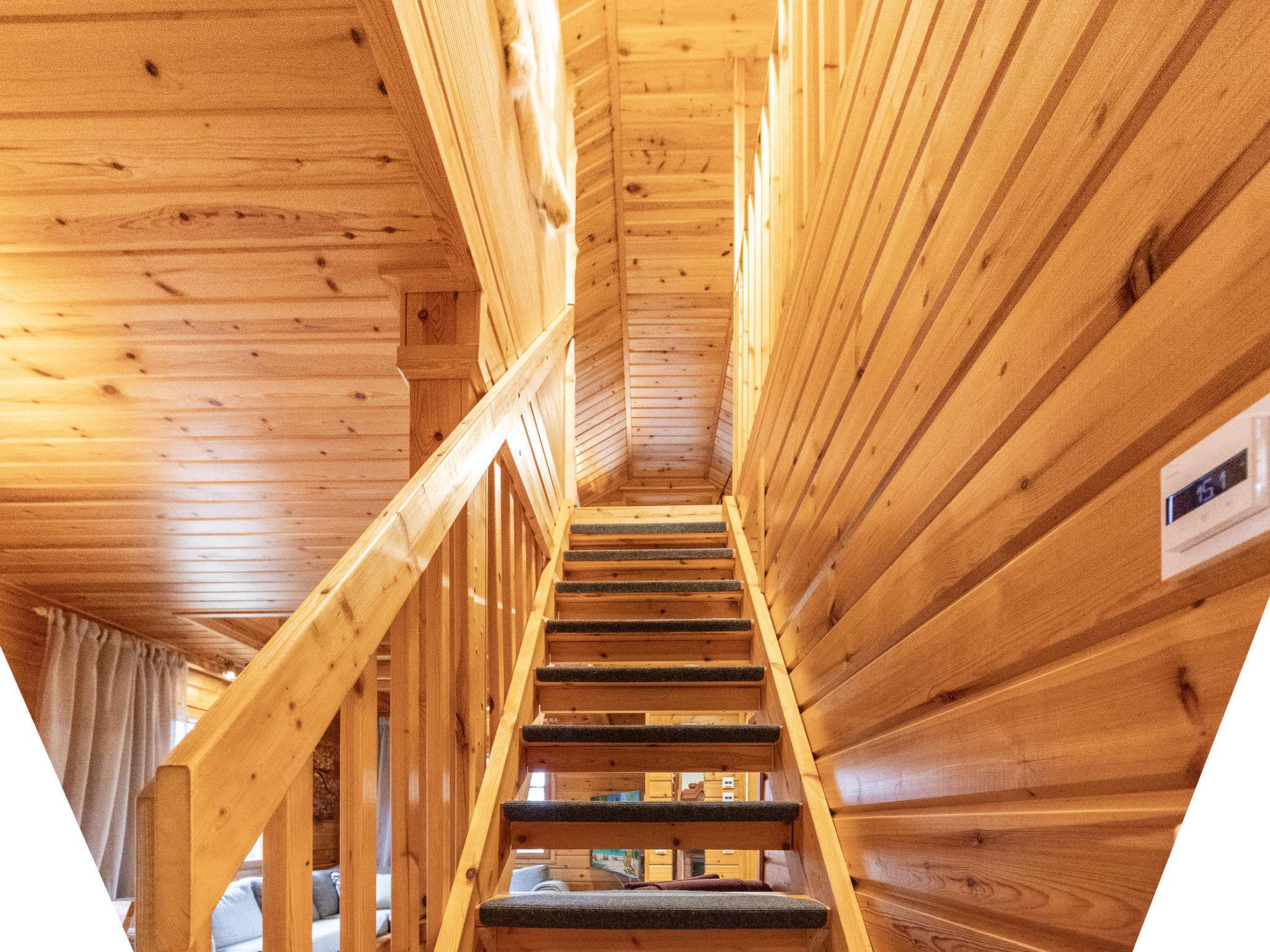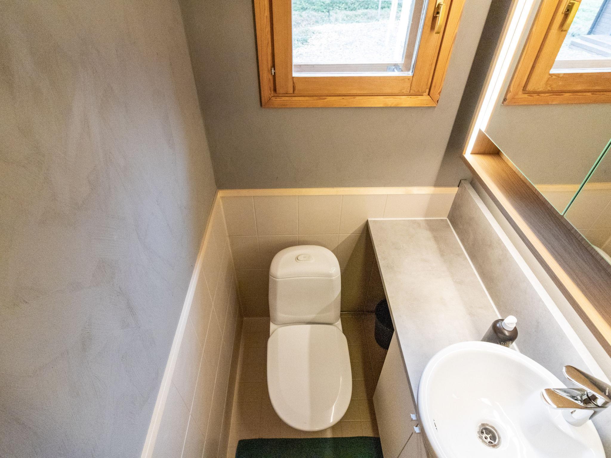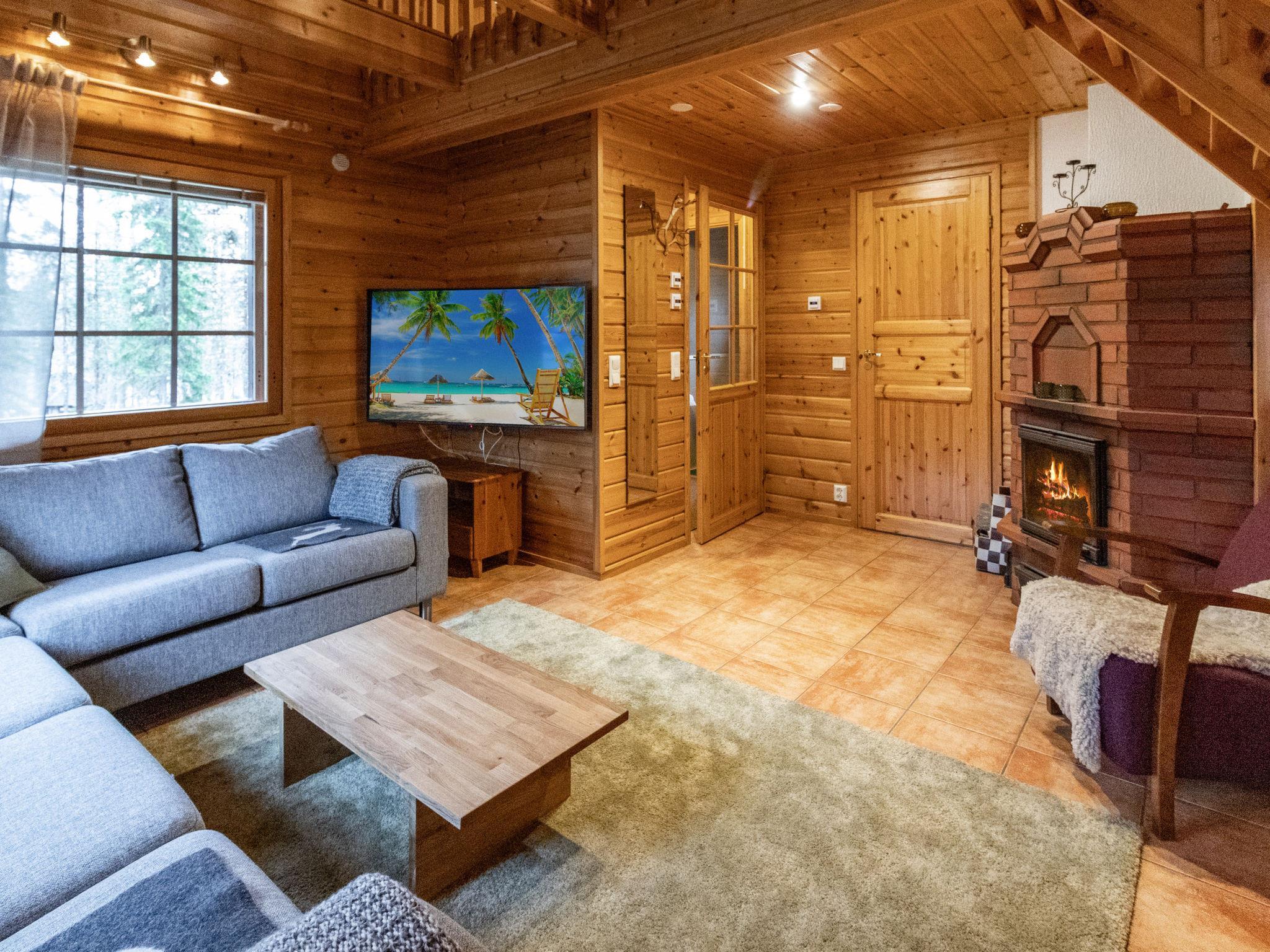 The cabin has a warm and inviting atmosphere, making it ideal for both families and groups of friends. The ground floor features a living area with a cozy fireplace, an open-plan kitchen, and a dining table that seats six. The bathroom and WC are also located on the ground floor, along with an electric sauna.