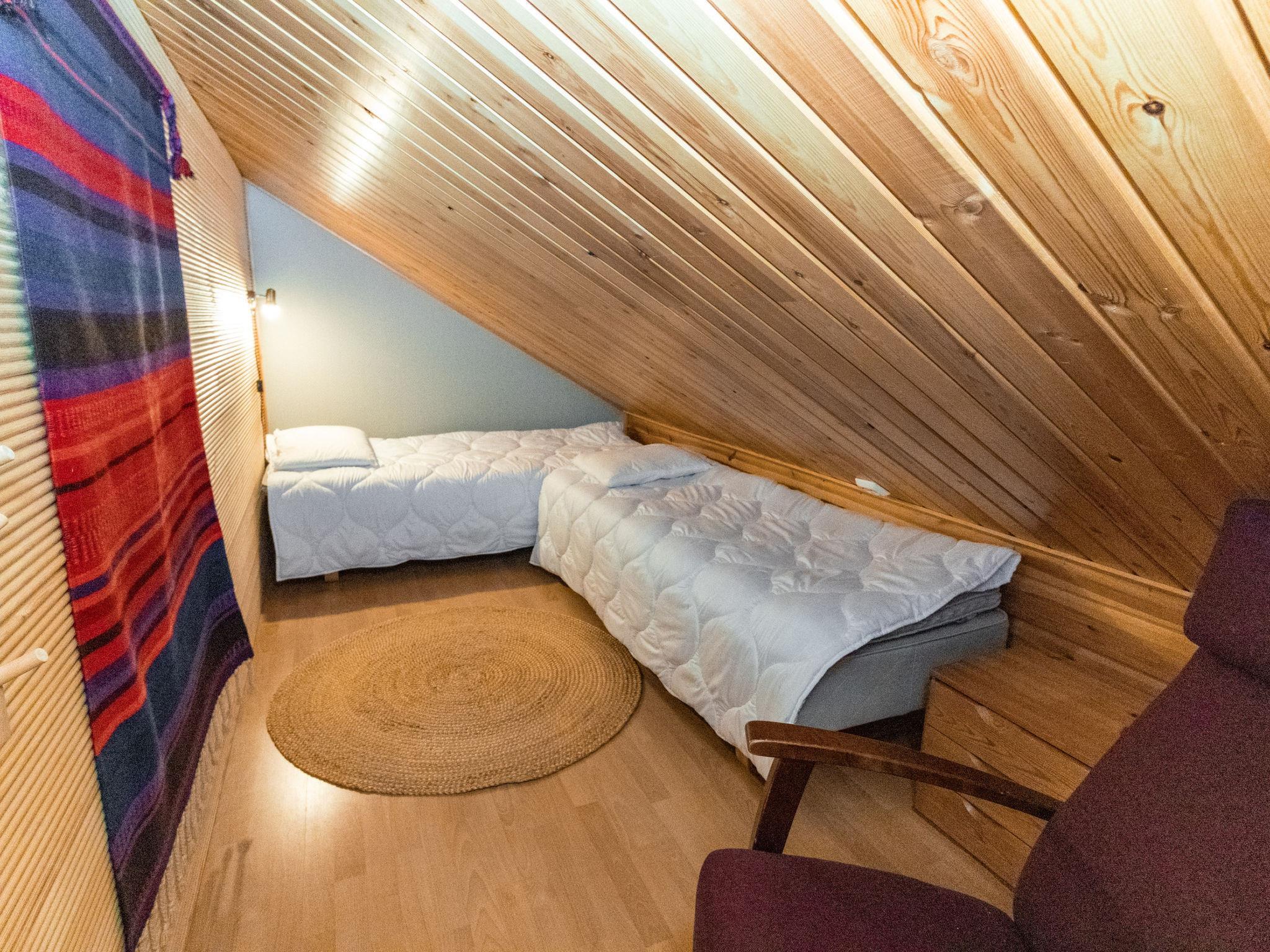 One bedroom is located downstairs, furnished with a 160 cm double bed. The loft offers four 80 cm wide beds as well as an additional lounge area.