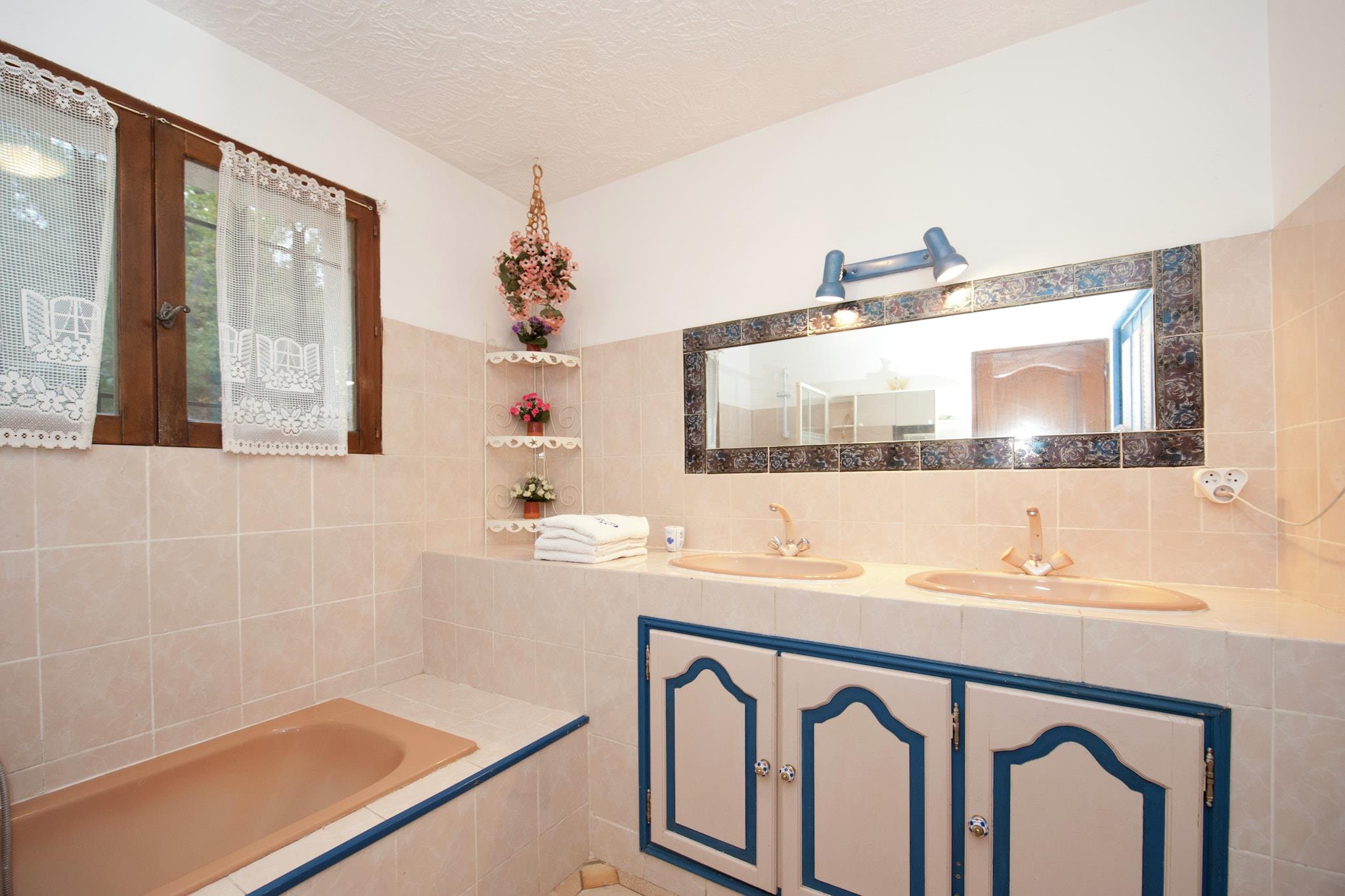 Ground floor: (Living room(TV(satellite), seating area, DVD player), dining room(dining table, air conditioning), Kitchen(electric kettle, toaster, cooker(4 ring stoves, induction), coffee machine, oven, microwave, dishwasher, fridge-freezer, washing machine), bedroom(double bed or 2 single beds(90 x 200 cm), air conditioning), bedroom(double bed(160 x 200 cm), air conditioning), bathroom(bathtub with shower, 2x washbasin, toilet), toilet, mezzanine(2x bunk bed)) On the 1st floor: (bedroom(double bed(140 x 200 cm), balcony, air conditioning), bathroom(shower(walk-in shower), washbasin, washbasin, toilet)) heating(electric), air conditioning, terrace(private), garden(fenced, 1200 m2), garden furniture, sun loungers, BBQ(charcoal), swimming pool(private, heated, water alarm, 11 x 5 m.), boules court, table tennis table, children's bed, high chair, playpen, plancha grill