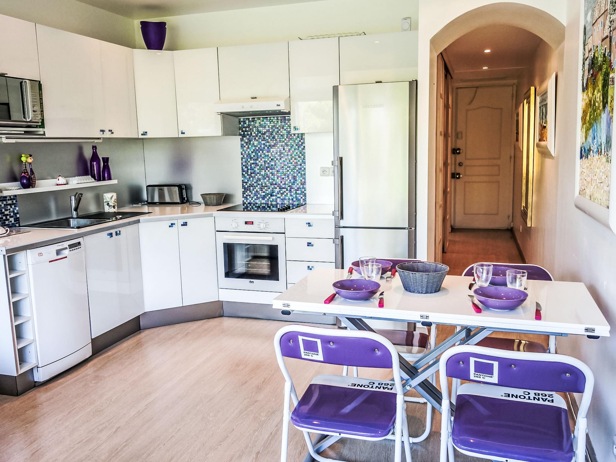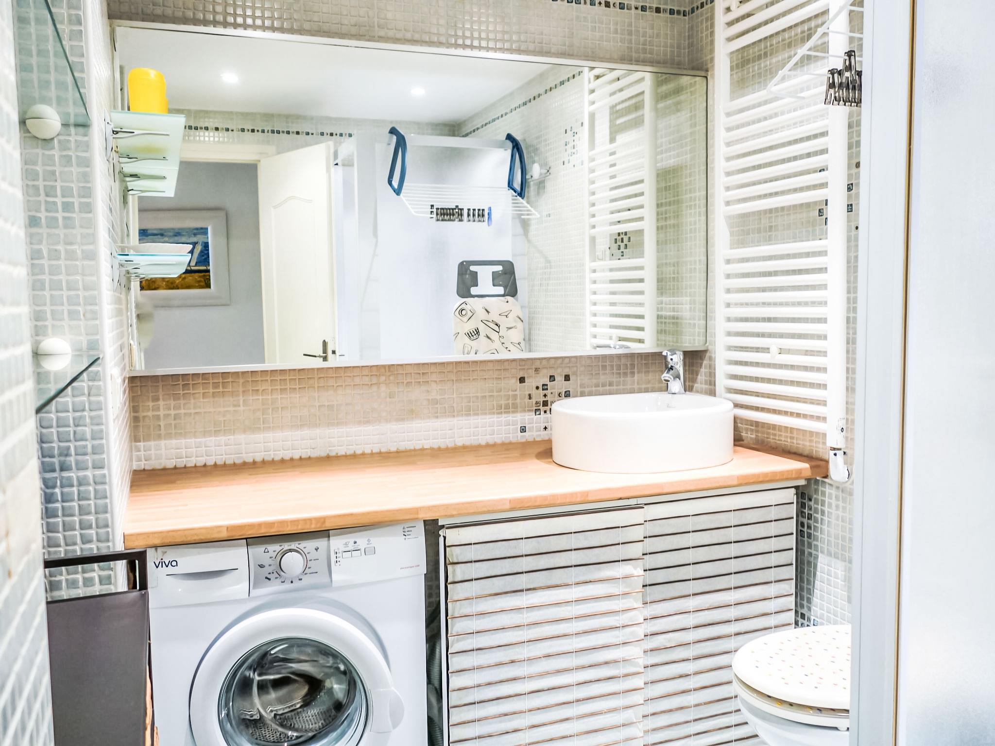 2-room apartment 37 m2 on 1st floor, west facing position. Beautiful furnishings: living/dining room with 1 double sofabed (140 cm, length 180 cm), TV (flat screen). 1 room, without window with 1 french bed (160 cm, length 200 cm). Open kitchen (oven, dishwasher, 4 ceramic glass hob hotplates, toaster, kettle, microwave, freezer, electric coffee machine). Shower/WC. Air-conditioning, forced-air heating. View of the forest. Facilities: washing machine, iron, baby cot for up to 2 year olds. Internet (WiFi, free). Please note: non-smokers only. TV only FR. Smoke alarm. 83009 000143 FO