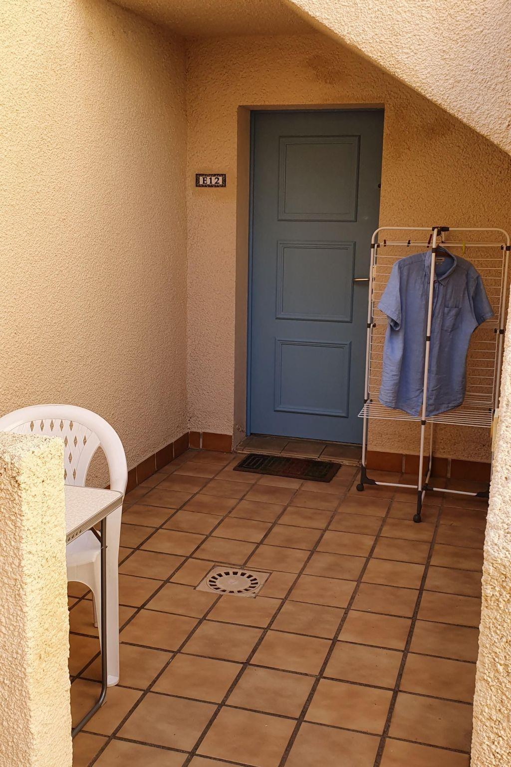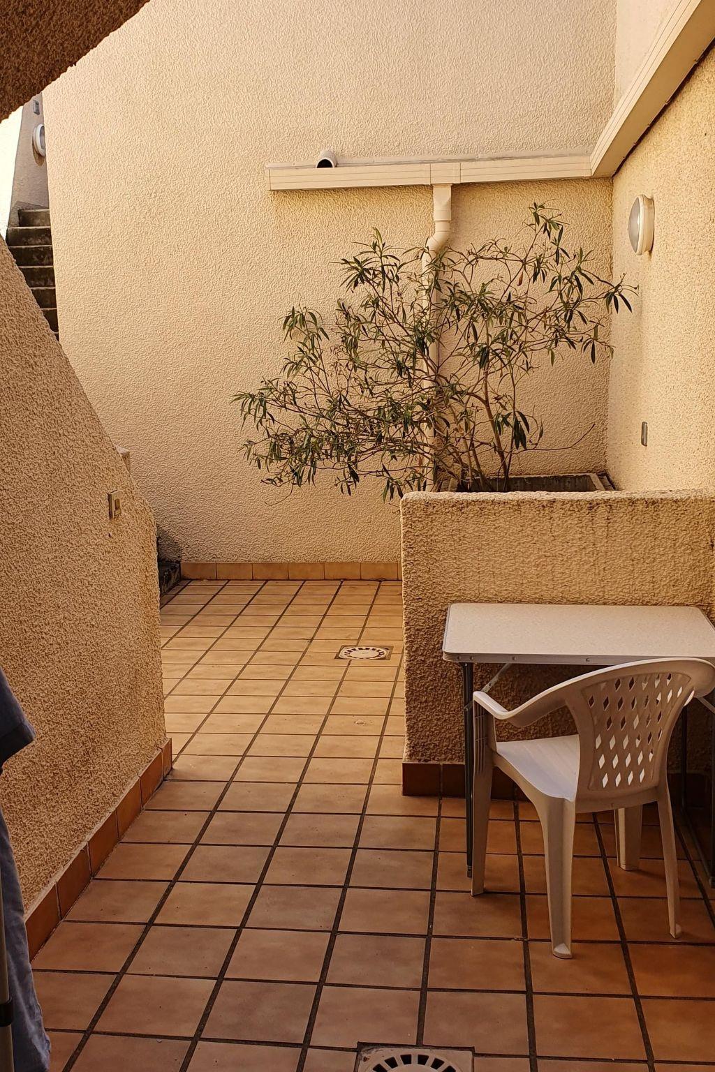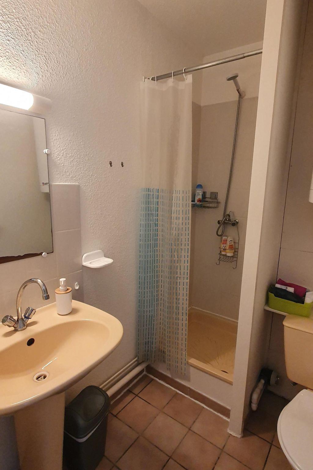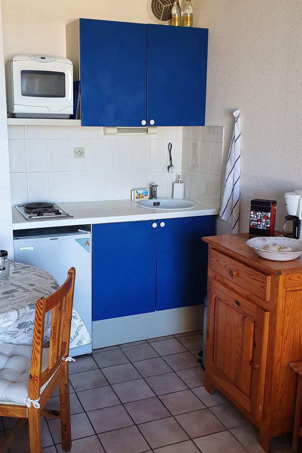 The studio with 31m² of living space is on a slope in a big and imaginatively-built apartment complex, Les Hauts du Fontaule, which was built in 1992, with stairs and archways throughout. The apartment is white, with brown tiled floors, and consists of a room with a cooking niche, a bathroom and a big terrace. The bathroom has a toilet, shower and washbasin. The kitchen is conveniently equipped with two cooking rings, a microwave, a coffee machine and a sink. There is ample crockery and some herbs, tea, pasta and rice are provided in the pantry. There is also a fridge with a freezer compartment.