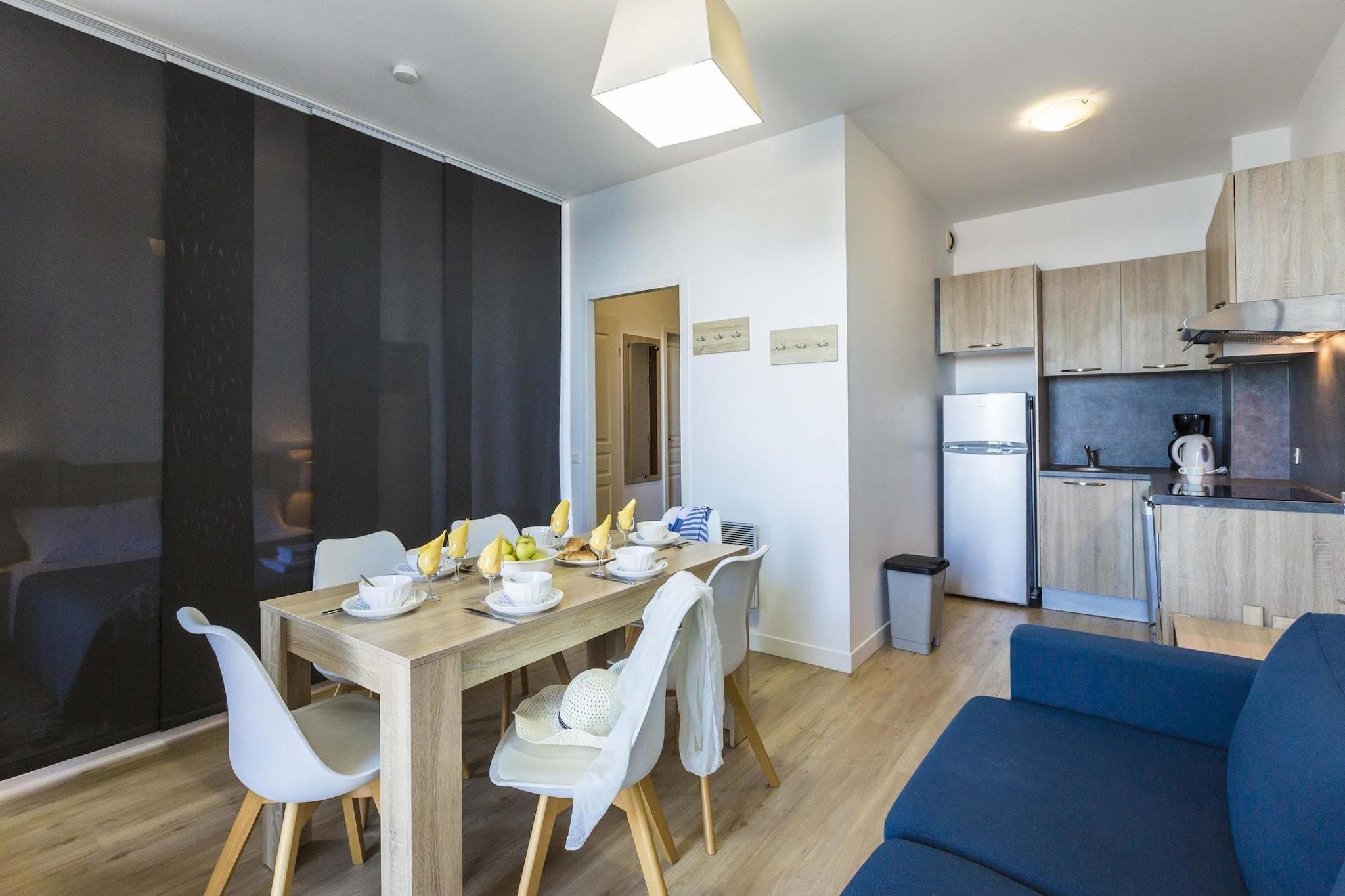 Located in the Valentin Plage residence, this apartment is an ideal location for a successful summer holiday in the so-called ''Côte Sauvage'' near the bay of La Baule. The small, enclosed and green domain (2 ha) consists of a monumental main building and three annexes (without lift). The apartment is located on the ground floor or first floor (park side) and furnished in a pleasant way. The living room features a double sofa bed and a TV. The kitchenette is fully equipped and includes a dishwasher. The apartment also features a mezzanine with a double bed or a bunk bed and a bathroom with bathtub and toilet. Outside, you will find a terrace or balcony with garden furniture. There is parking for your car in the general car park. At Résidence Valentin Plage, you can book various nice apartments for four to eight people.