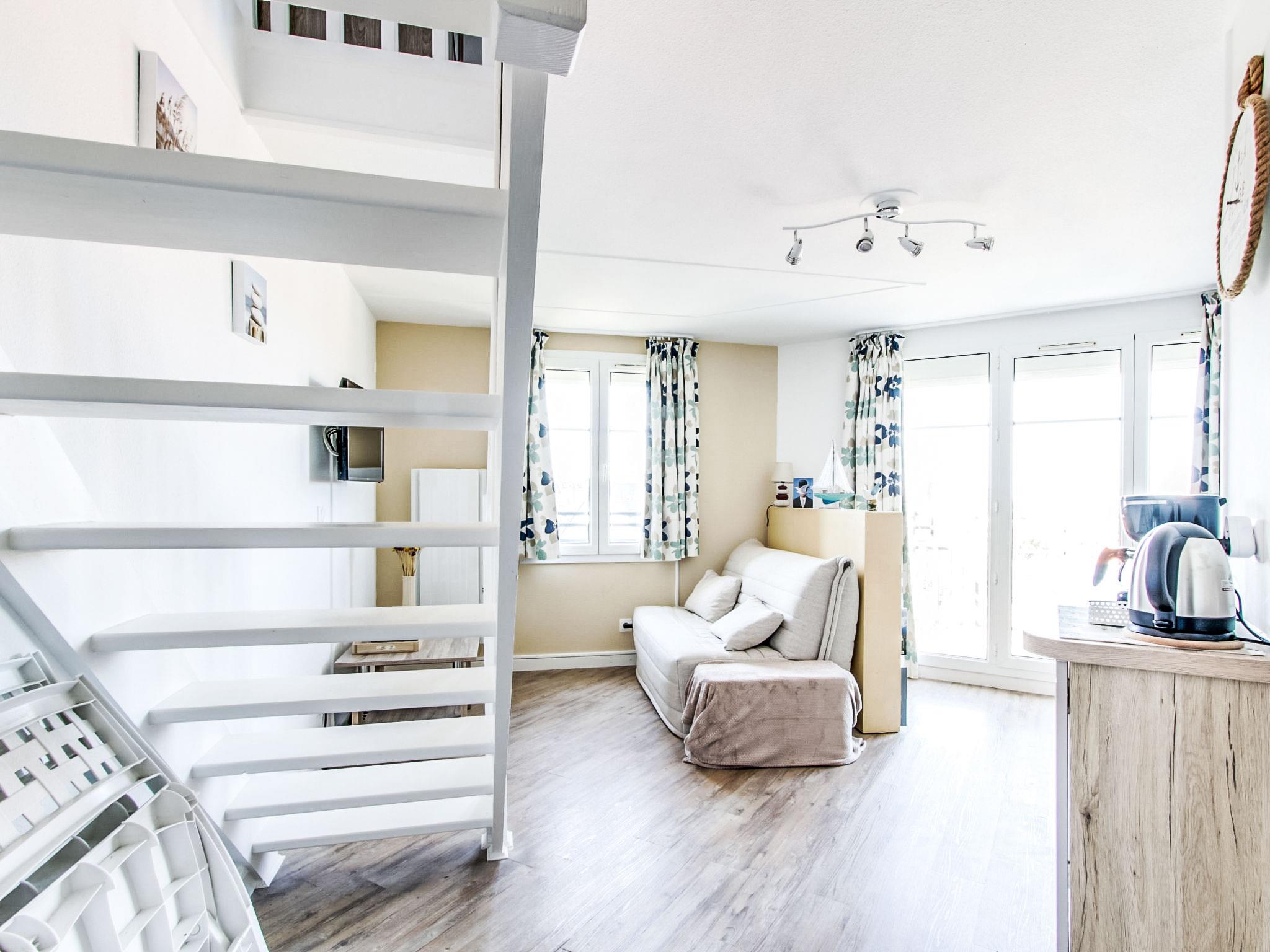 2-room apartment 35 m2 on 2 levels on 2nd floor, north-west facing position. Living/dining room with TV (flat screen), electric shutters. Exit to the balcony. Kitchenette (dishwasher, 3 induction hot plates, toaster, kettle, microwave, freezer, electric coffee machine) with bar. Sep. WC. Electric heating. Upper floor: 1 room with 1 french bed (140 cm, length 190 cm). Shower/WC. Parquet floors. Balcony 5 m2. Balcony furniture. Beautiful distant view of the sea and the river. Facilities: hair dryer. Internet (WiFi, extra). Parking space n 2831. Please note: smoke alarm.
