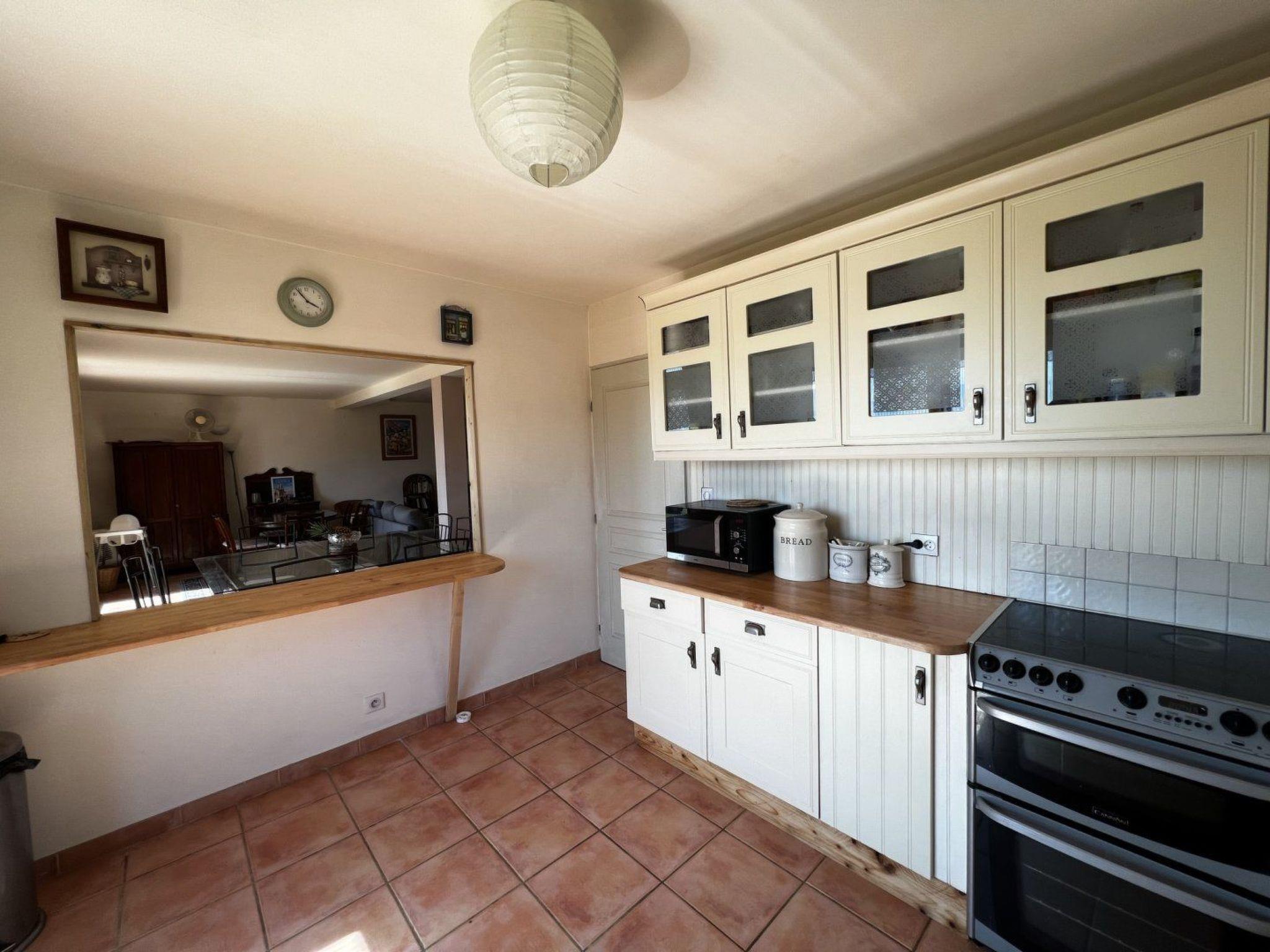Très grand salon et cuisine ouverte au passe - plat, coin salle à manger. Portes fenêtres donnant sur la terrasse avec magnifique vue sur la mer. Table à manger et chaises, TV, tables d'. Two sofas, sofa bed, book shelves. Well-equipped country-style kitchen with fridge/freezer, dishwasher, cooker, microwave, toaster, 2 coffee machines, kettle. You can also dine upstairs at'extérieur dans la pergola à côté.