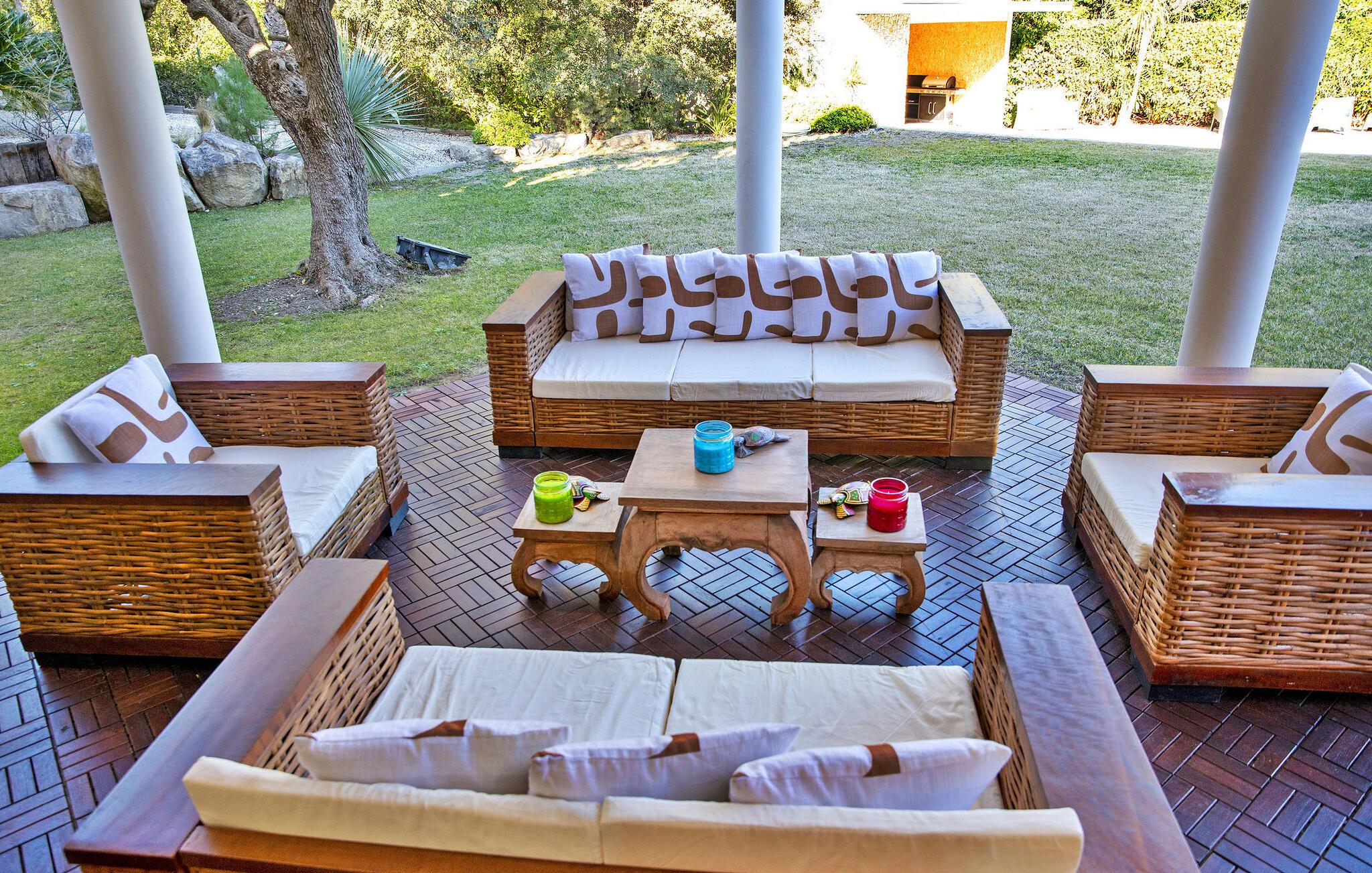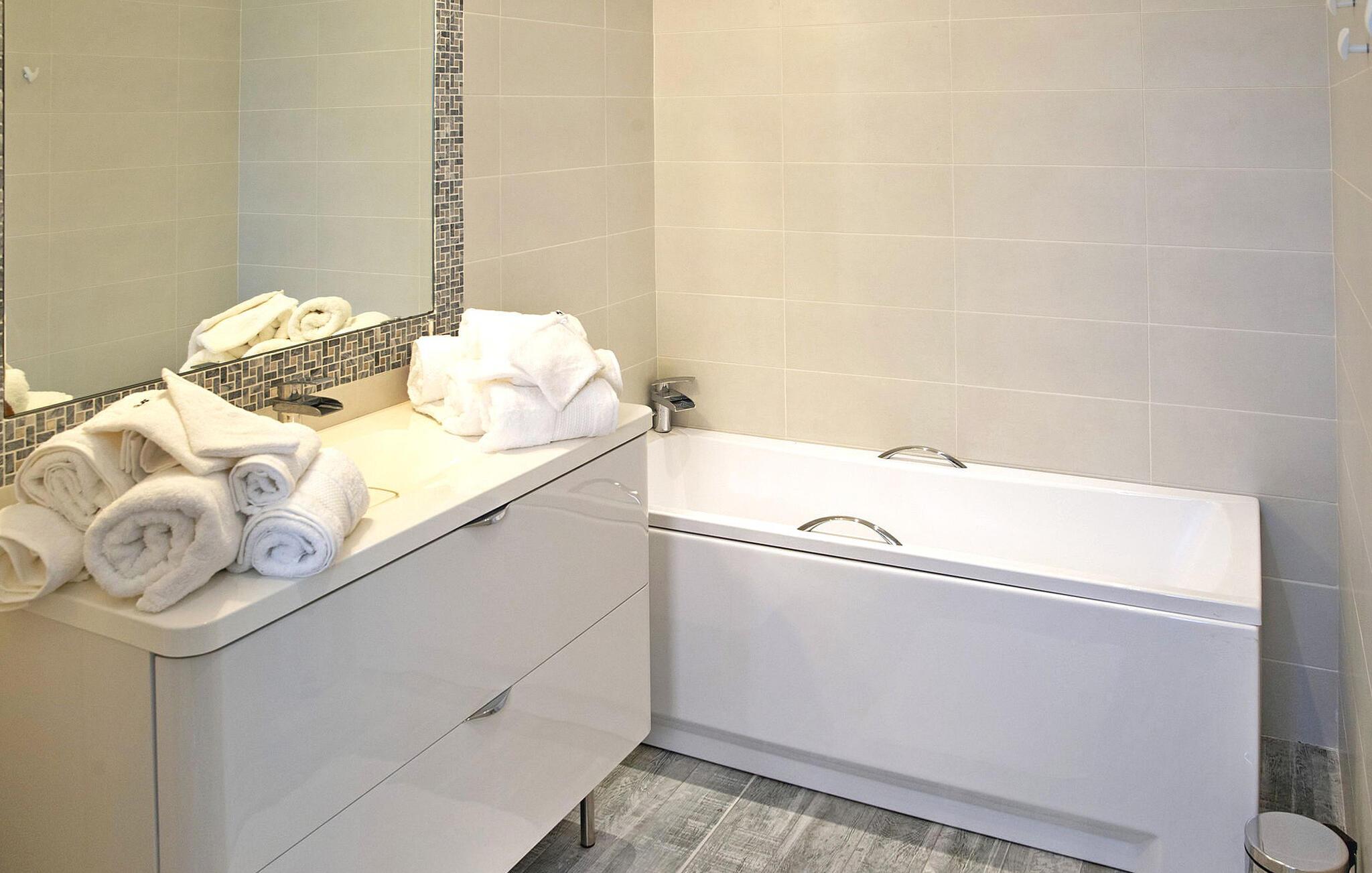 Die Villa bietet Unterkunft auf zwei Ebenen und verfügt über eine erste Etage mit einer gut ausgestatteten Küche, einem Esszimmer und einem Wohnzimmer, die nahtlos ineinander übergehen. Das geräumige Wohnzimmer verfügt über hohe Decken und mehrere französische Fenster, die einen bezaubernden Blick auf den Garten und den Pool bieten. Im Obergeschoss bieten zwei Schlafzimmer, darunter eine Mastersuite, Komfort und moderne Annehmlichkeiten. Draußen lockt der umzäunte Garten mit einem Swimmingpool, Sonnenliegen, Gartenmöbeln und einem Fitnessstudio im Poolhaus, ausgestattet mit vielfältigen Trainingsgeräten. Ein Gasgrill, eine Tischtennisplatte und Brettspiele sorgen für Unterhaltung im Freien.