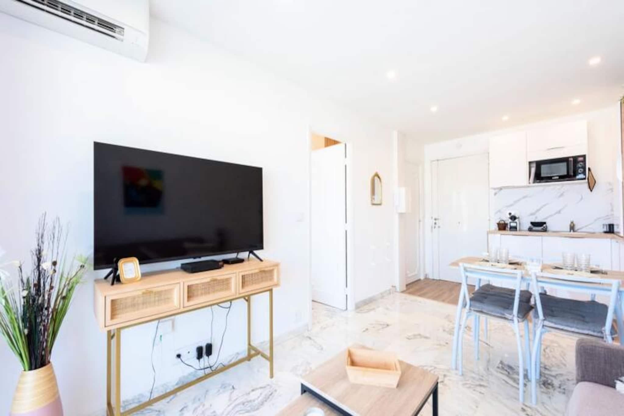 High above the vibrant streets of Cannes, this newly renovated one-bedroom apartment offers a serene escape with a touch of luxury. Bathed in natural light, the west-facing terrace invites you to unwind with a glass of wine as you take in the unobstructed views over the city rooftops. Whether you're here for the glamour of the Croisette or the charm of the old town, this apartment is the perfect base for exploring everything Cannes has to offer. \n\nStep inside and discover a modern haven designed for comfort and style. The open-plan living area features a cozy lounge with a Smart TV, a dining space for four, and a sleek kitchen equipped with all the essentials. The double bedroom, complete with its own Smart TV and wardrobe, ensures restful nights, while the walk-in shower with an illuminated vanity adds a touch of spa-like indulgence. Reversible air conditioning and double-glazed windows guarantee a peaceful and comfortable stay, no matter the season.\n\nJust a short stroll down Rue Lacour, you'll find yourself on the iconic Rue d'Antibes, perfect for shopping, or the famous Croisette, where luxury boutiques, sandy beaches, and the Palais des Festivals await. Explore the historic charm of Le Suquet and enjoy panoramic views from the Notre-Dame d'Espérance church. With restaurants, shops, and cultural landmarks all within easy reach, you'll never run out of things to do.\n\nWhether you're visiting for business or leisure, this apartment offers the ideal combination of convenience and tranquility. With a concierge service at your disposal and thoughtful touches like linens, toiletries, and a welcome kit, every detail has been considered to make your stay unforgettable.