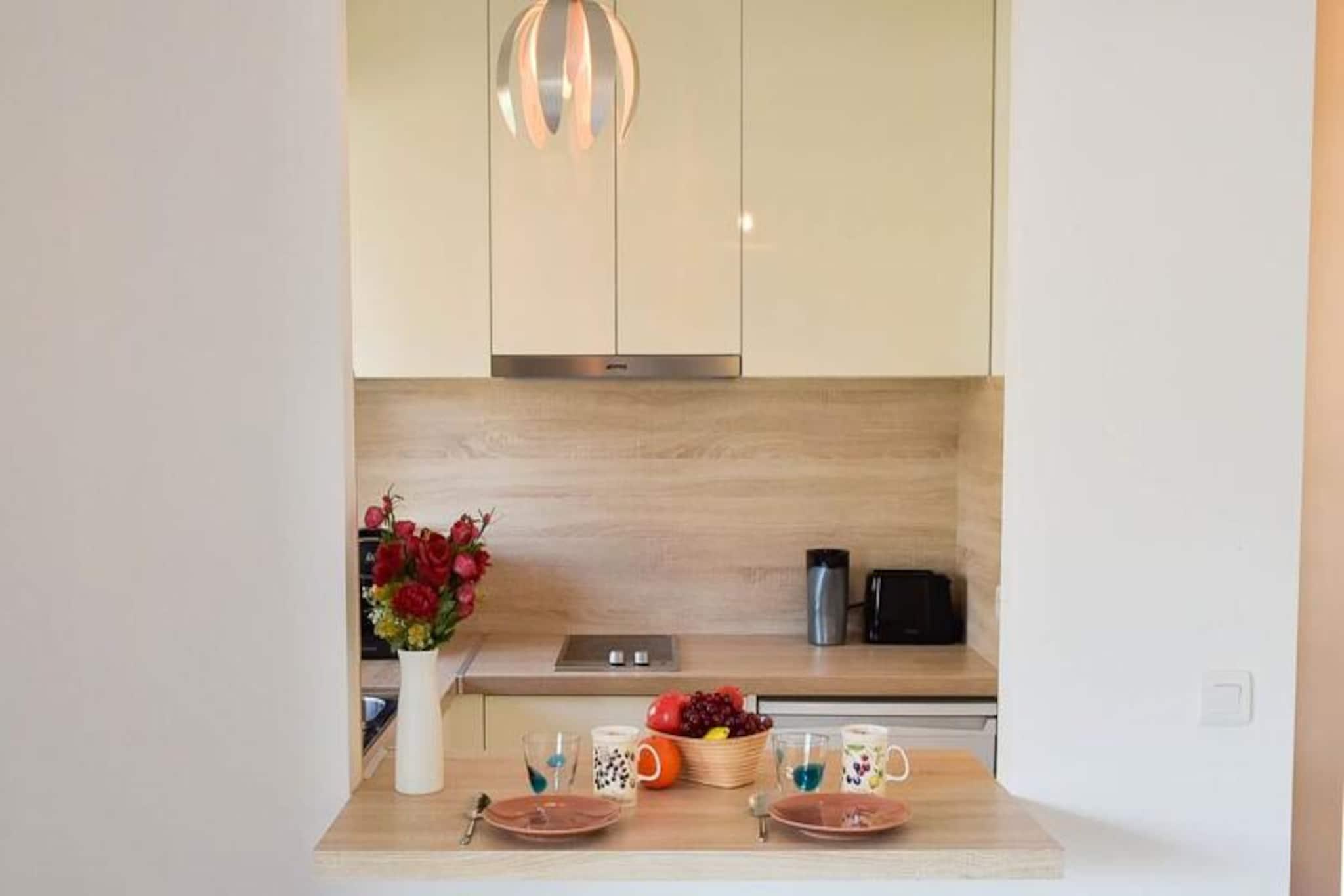 Amid the vibrant charm of Cannes' Palm Beach neighborhood, this elegant 25 m² apartment offers a perfect blend of city convenience and coastal tranquility. Imagine waking up to the gentle Mediterranean breeze, stepping onto your spacious terrace for a leisurely breakfast, and strolling just 300 meters to the sandy shores of Mouré Rouge beach. Whether you're seeking a romantic getaway or a peaceful retreat, this property provides an idyllic setting for your stay. The lively streets surrounding the apartment are lined with local shops, including a butcher, bakery, fishmonger, and supermarket, ensuring that every essential is just steps away. \n\nInside, the apartment is thoughtfully designed for comfort and style. The living area features a cozy queen-size bed, a sofa, and a TV corner, all bathed in natural light with direct access to the terrace. The open-plan kitchen, complete with a breakfast bar, invites you to prepare meals for two, while the modern bathroom includes a washing machine for added convenience. The terrace itself is a highlight, offering a dining area for four and a cozy lounge space with garden chairs—perfect for unwinding after a day exploring Cannes. Double-glazed windows and reversible air conditioning ensure restful nights and a comfortable atmosphere year-round.\n\nStep outside and immerse yourself in the unique ambiance of Palm Beach. A short walk down Avenue de Lérins leads you to the beach or the iconic Croisette, where luxury boutiques and fine dining await. Within minutes, you can reach the Palais des Festivals or hop on a train to discover nearby gems like Antibes, Nice, and Monaco. With free street parking, included linens, and a concierge service to cater to your every need, this apartment is your gateway to the best of the French Riviera. Let the allure of Cannes captivate you and create unforgettable memories in this exceptional holiday home.