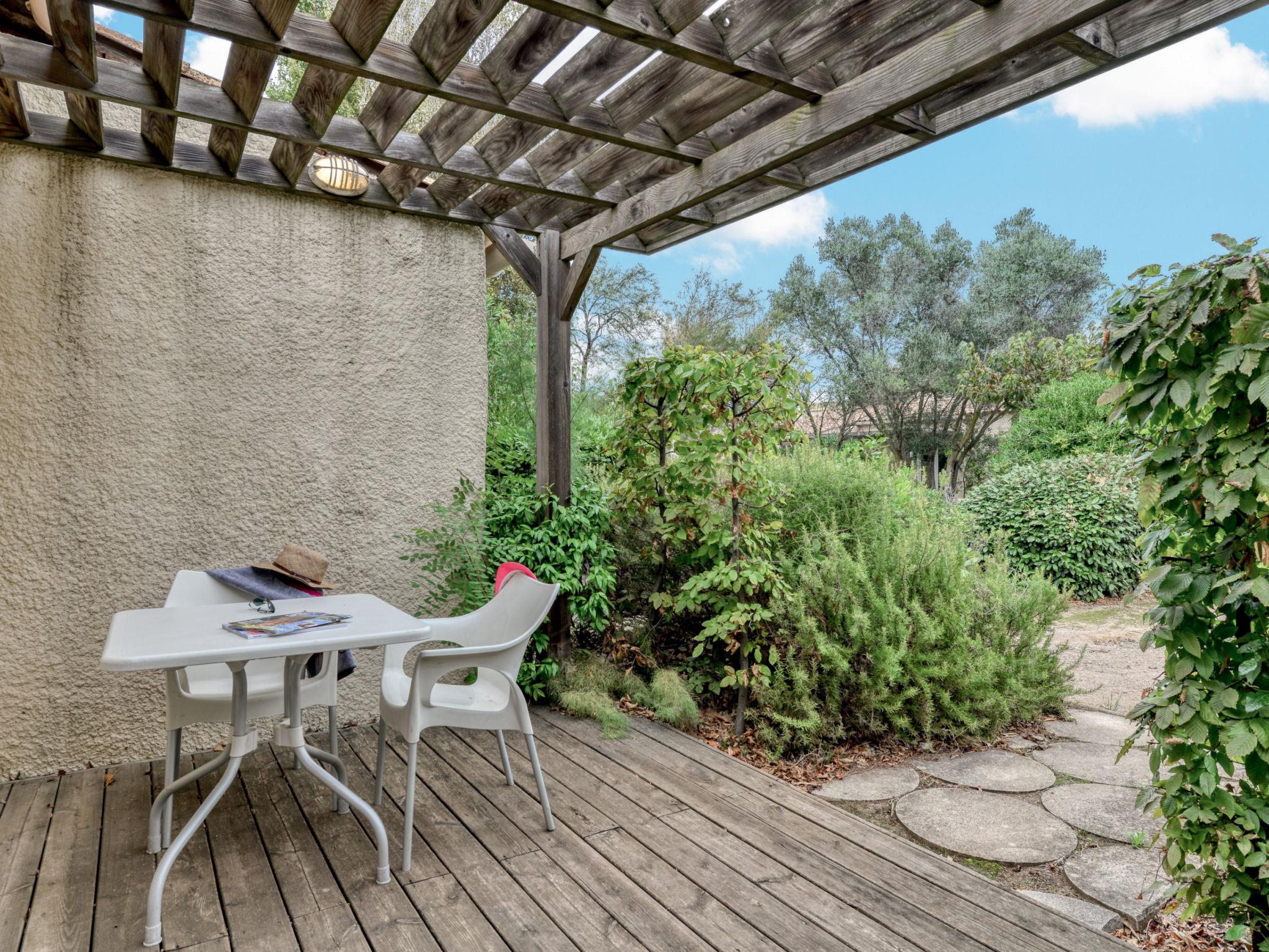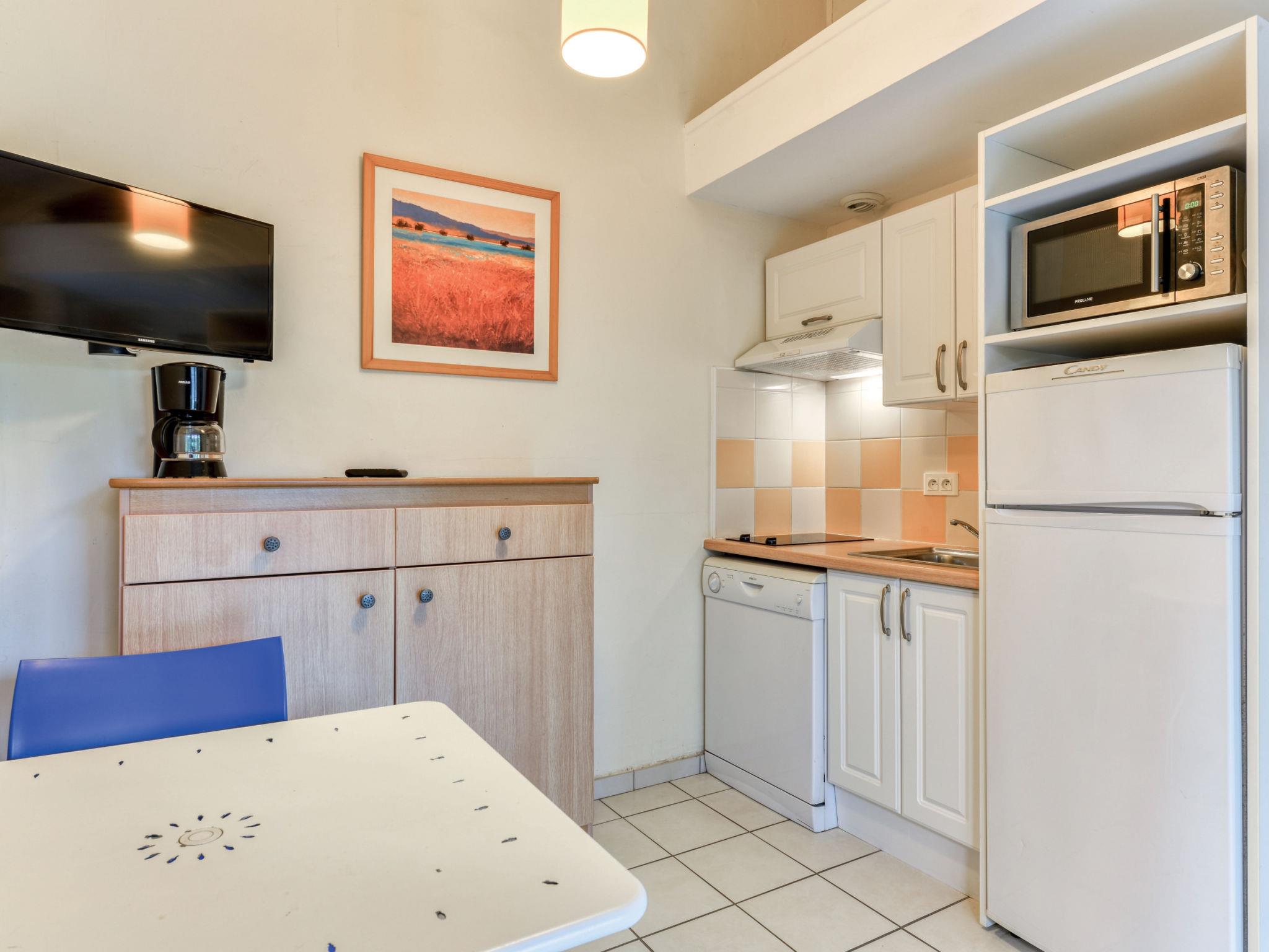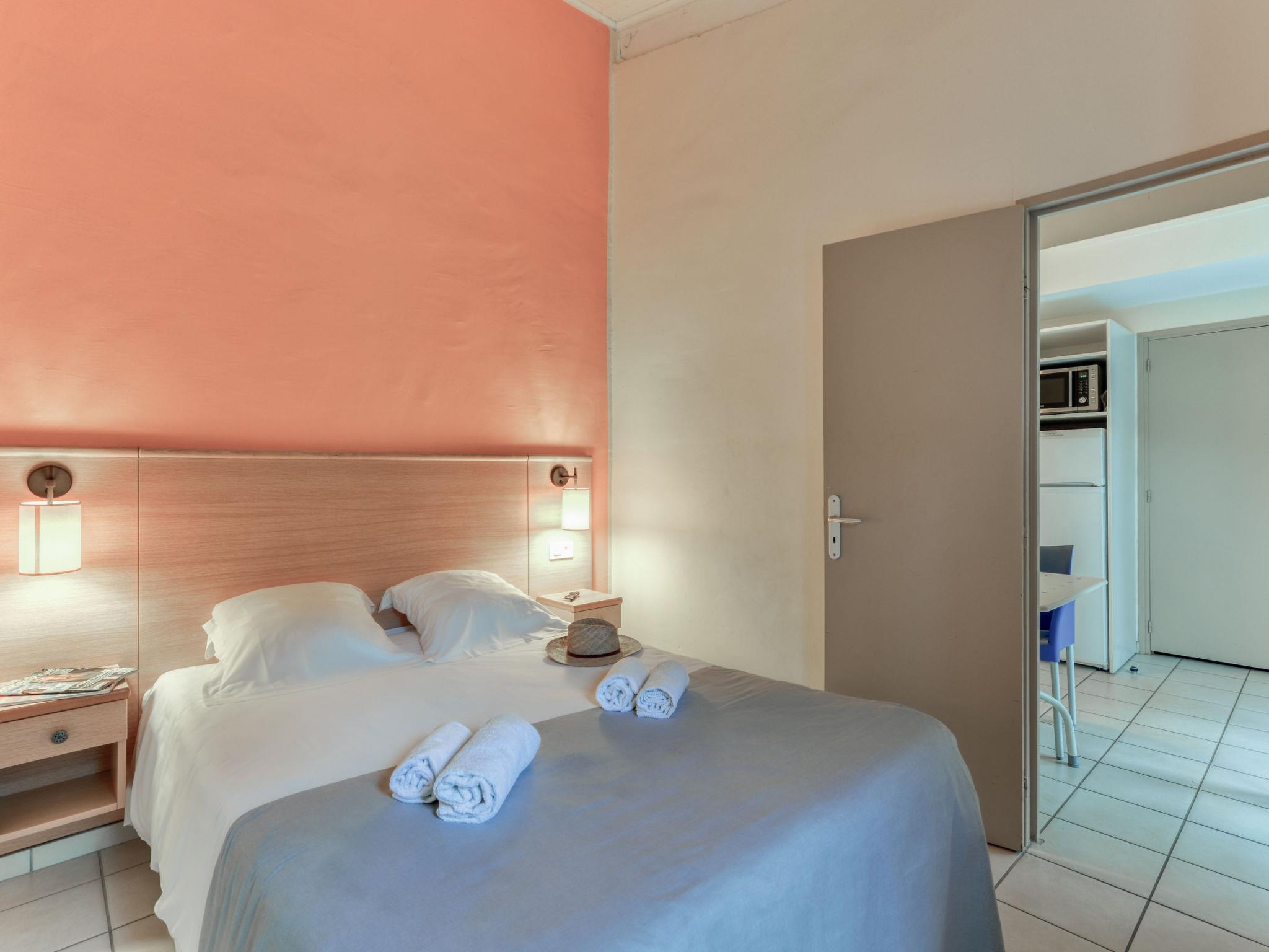 "Sowell Résidence Les Lauriers Roses", 2-room terraced house 20 to 25 m2. Practical furnishings: living/dining room with satellite TV (flat screen), fan. Exit to the terrace. 1 room with 1 french bed (140 cm, length 190 cm). Kitchenette (dishwasher, 2 ceramic glass hob hotplates, toaster, microwave, electric coffee machine). Shower/WC. Electric heating. Terrace 10 m2. Terrace furniture. Facilities: safe. Internet (WiFi, free). Please note: maximum 1 pet/ dog allowed. Smoke alarm. Offer by a commercial proprietor according to Art. 155, IV, CGI