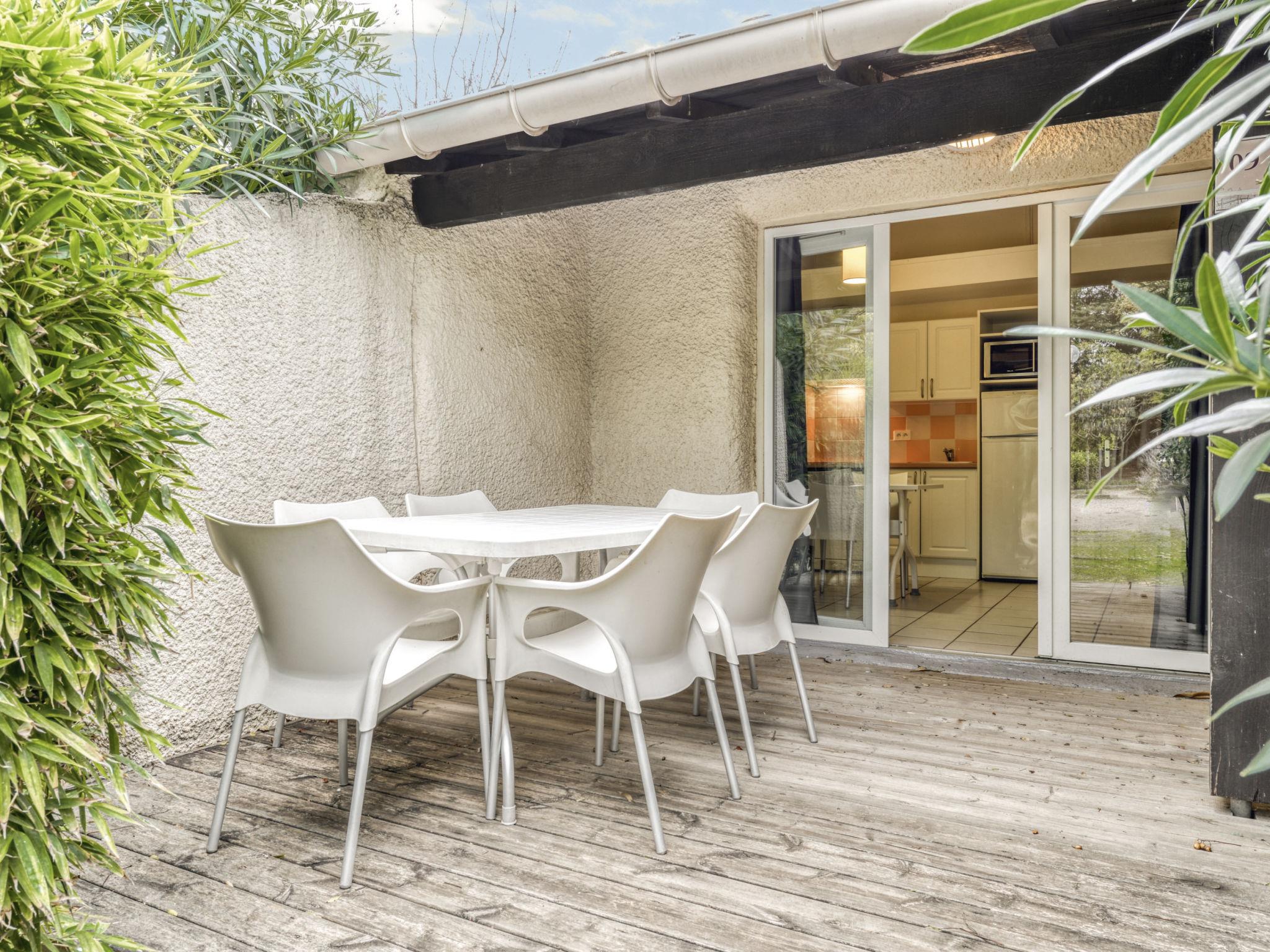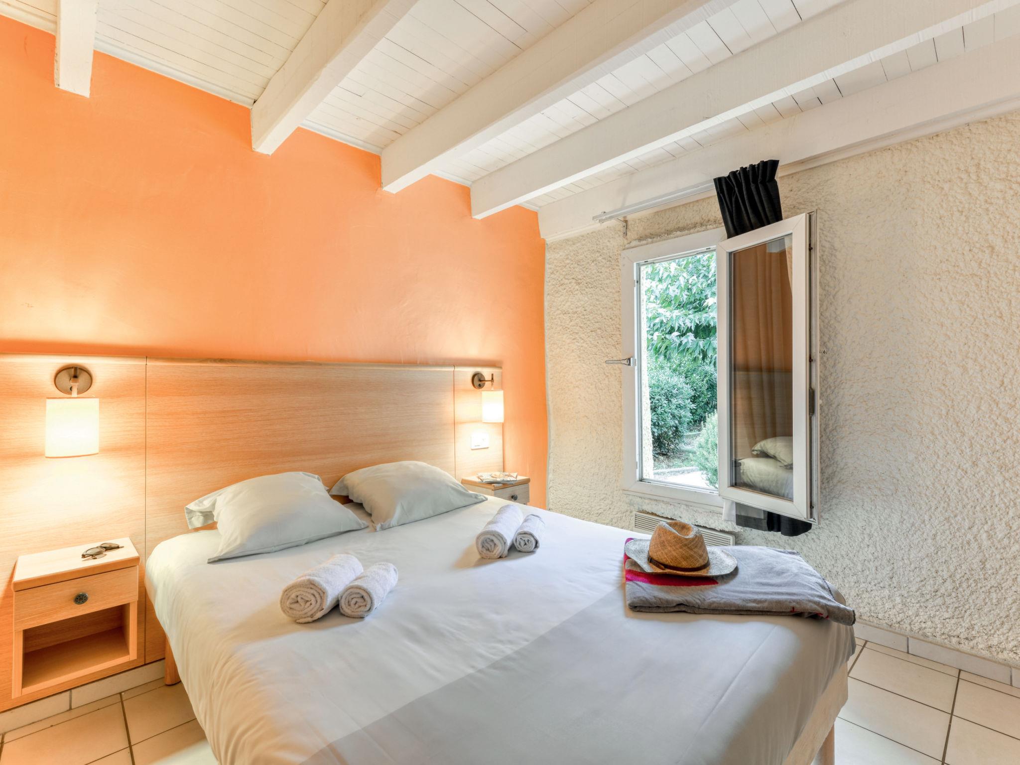 "Sowell Résidence Les Lauriers Roses", 3-room terraced house 40 to 45 m2. Practical furnishings: living/dining room with satellite TV (flat screen), fan. Exit to the terrace. 1 room with 1 french bed (140 cm, length 190 cm). 1 room with 2 x 2 bunk beds (80 cm, length 190 cm). Kitchenette (dishwasher, 4 ceramic glass hob hotplates, toaster, microwave, electric coffee machine). Shower/WC. Electric heating. Terrace 10 m2. Terrace furniture. Facilities: safe. Internet (WiFi, free). Please note: maximum 1 pet/ dog allowed. Smoke alarm. Offer by a commercial proprietor according to Art. 155, IV, CGI
