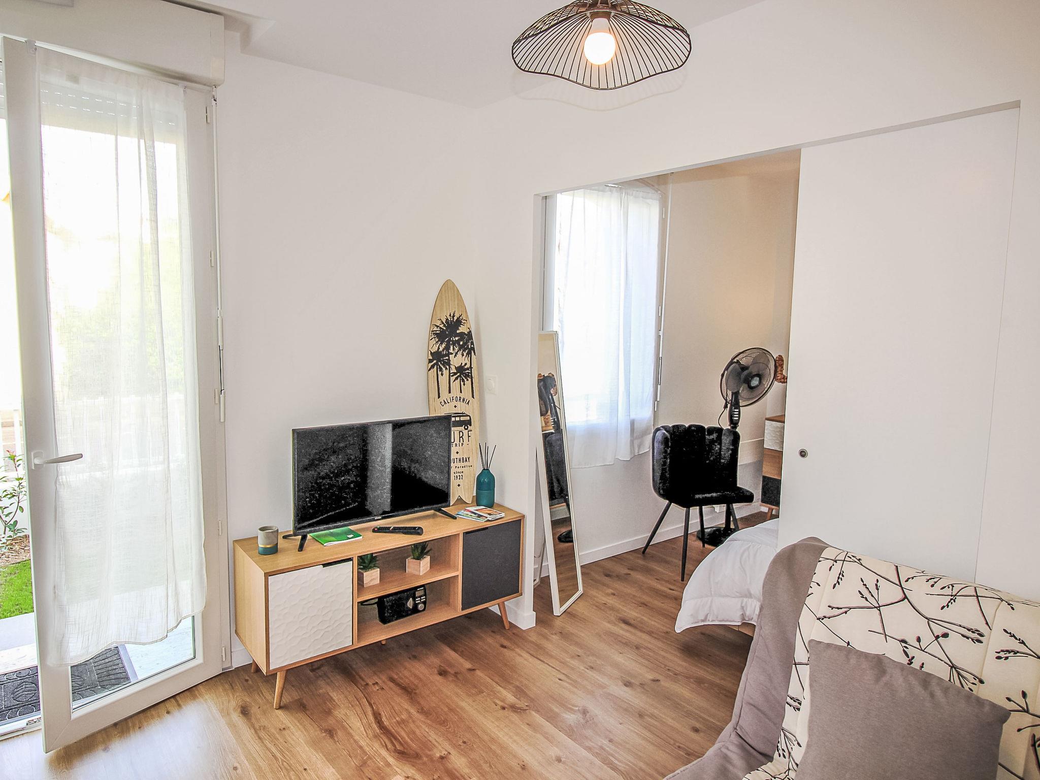 2-room apartment 30 m2, on the ground floor. Modern and cosy furnishings: living/dining room with TV (flat screen). Exit to the terrace, to the patio. 1 room with 1 french bed (160 cm, length 200 cm). Open kitchen (oven, dishwasher, 2 induction hot plates, toaster, kettle, microwave, electric coffee machine). Shower/WC. Electric heating. Terrace 11 m2, small patio 36 m2. Terrace furniture, deck chairs (2). Facilities: hair dryer. Internet (WiFi, free). Please note: non-smokers only. Offer by a private individual according to Art. 155, IV of CGI. 40065001449WR