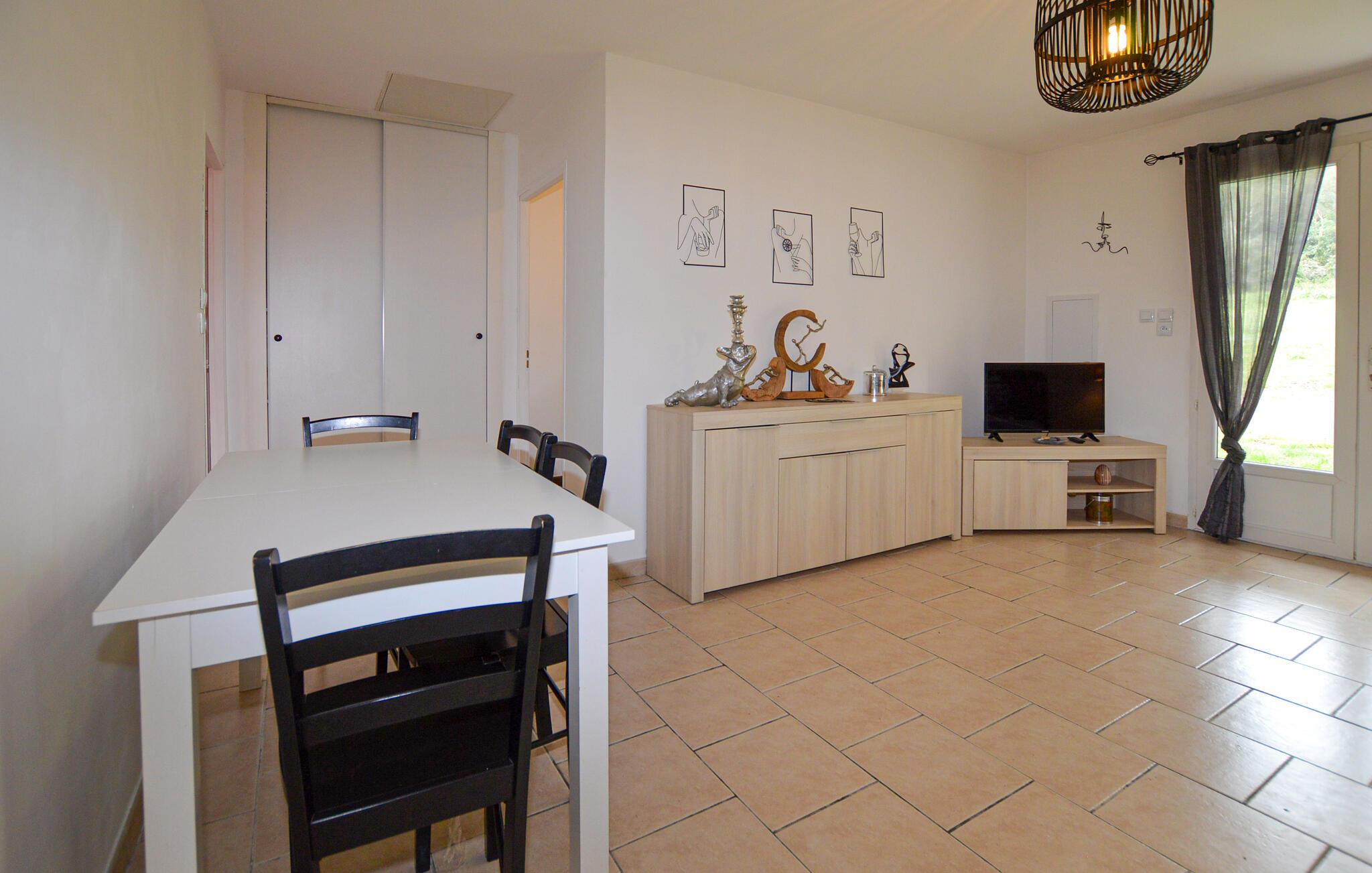 Verbringen Sie eine unbeschwerte Auszeit in diesem ruhig gelegenen Haus auf Korsika, nur wenige Autominuten vom Flughafen in Bastia entfernt. Die Doppelhaushälfte bietet Ihnen viel Privatsphäre, ideal für Paare oder kleine Familien. Entspannen Sie sich im einfach gestalteten Wohnbereich mit praktischer Möblierung, bequemer Couch und Fernseher. Bereiten Sie Ihre Mahlzeiten in der offenen Küche mit großzügiger Arbeitsfläche zu. Genießen Sie den Blick ins Grüne durch die Fenster oder nutzen Sie die helle Essecke für ein gemeinsames Frühstück.