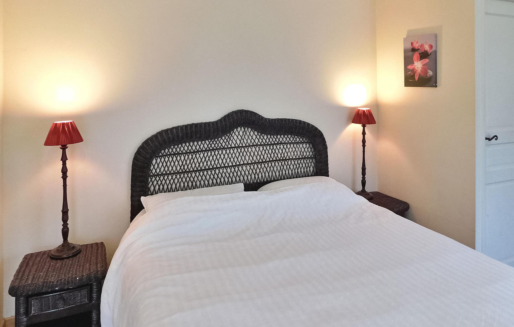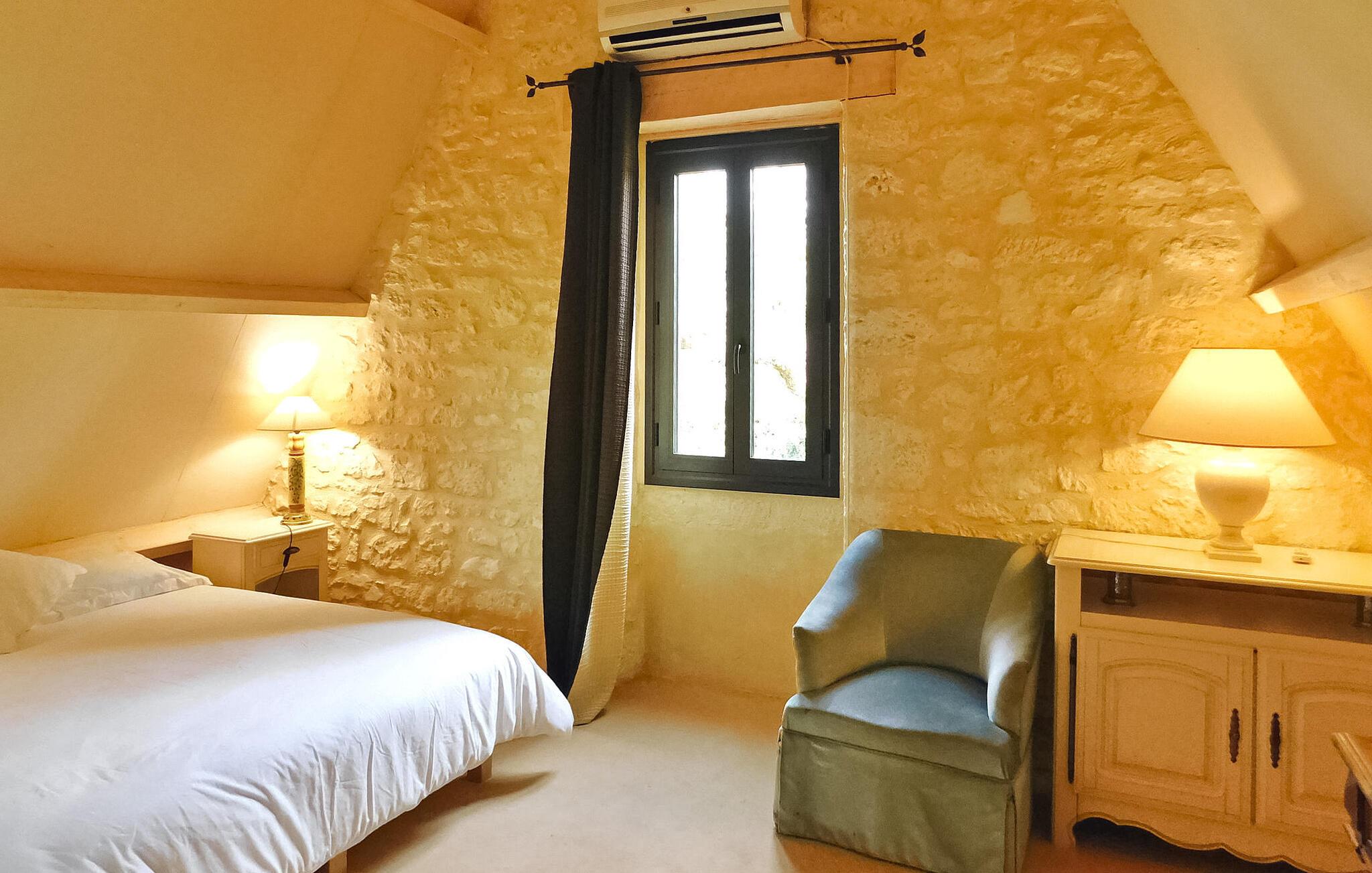 Dieses charakteristische Landhaus liegt zwischen La Roque Gageac und Domme und ist ein idealer Ausgangspunkt, um die wichtigsten Sehenswürdigkeiten der Dordogne zu besuchen. Im Erdgeschoss befinden sich eine gut ausgestattete Küche mit zentraler Kochinsel und ein komfortabler Wohnbereich sowie drei Schlafzimmer, darunter ein Einzelzimmer, das für ein Kind geeignet ist. Im Obergeschoss, erreichbar über eine Holztreppe, befinden sich zwei weitere Schlafzimmer, die über eine Klimaanlage verfügen, und ein Badezimmer. Der Außenbereich verfügt über Rasen- und Blumenflächen an der Vorder- und Rückseite, eine gepflasterte Terrasse mit Gartenmöbeln und Spielgeräten für Kinder, darunter eine Schaukel und eine Rutsche. Zum Anwesen gehört ein privater beheizter Pool (10 x 5 m), der derzeit durch eine Alarmanlage gesichert ist, aber bald durch eine abnehmbare Abdeckung ersetzt werden soll, die sowohl Sicherheit als auch Wärme bietet und zum Schwimmen vollständig geöffnet werden kann, während die Nachttemperatur aufrechterhalten wird. Das Ferienhaus liegt auf dem Land, aber nicht abgelegen, in einer ruhigen Wohngegend unweit der Städte La Roque Gageac, Cenac und Saint-Julien, Domme.