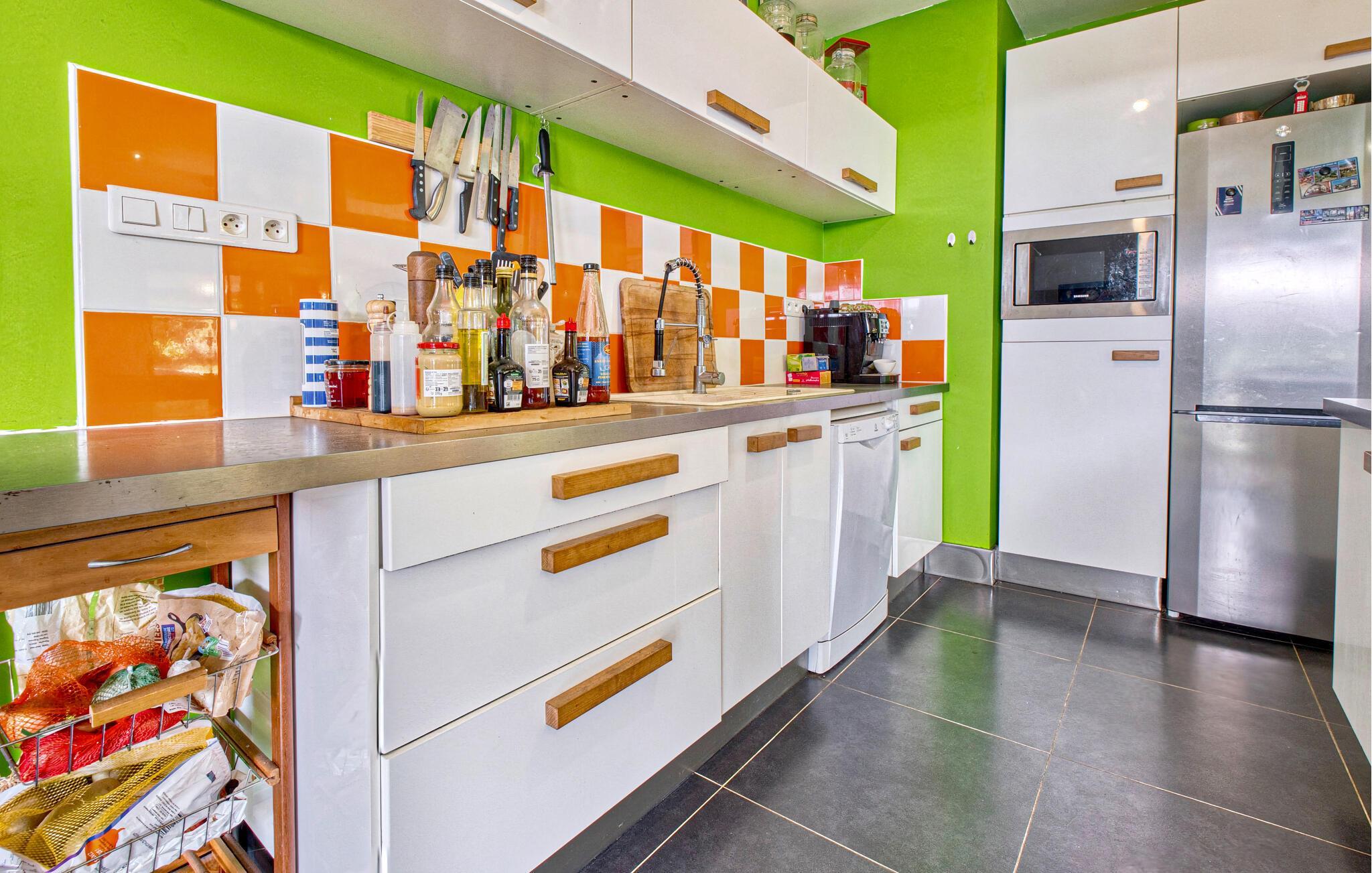 Verbringen Sie Ihren nächsten Frankreich-Urlaub in diesem stilvollen Ferienhaus in der Nähe von Coursac. Freuen Sie sich auf die gemeinsame Zeit mit Ihrer Familie im großzügigen Wohnbereich. Die moderne Einrichtung mit hellen Holzböden, einer offenen Küche und einer gemütlichen Sofalandschaft schafft eine angenehme Atmosphäre. Auch die farbenfrohen Akzente tragen zu der sorglosen Stimmung bei. Nehmen Sie Ihre Mahlzeiten am schönen Esstisch ein und genießen Sie gesellige Stunden. Lassen Sie den Abend entspannt vor dem Kaminofen oder bei einem Film auf dem Großbildfernseher ausklingen.