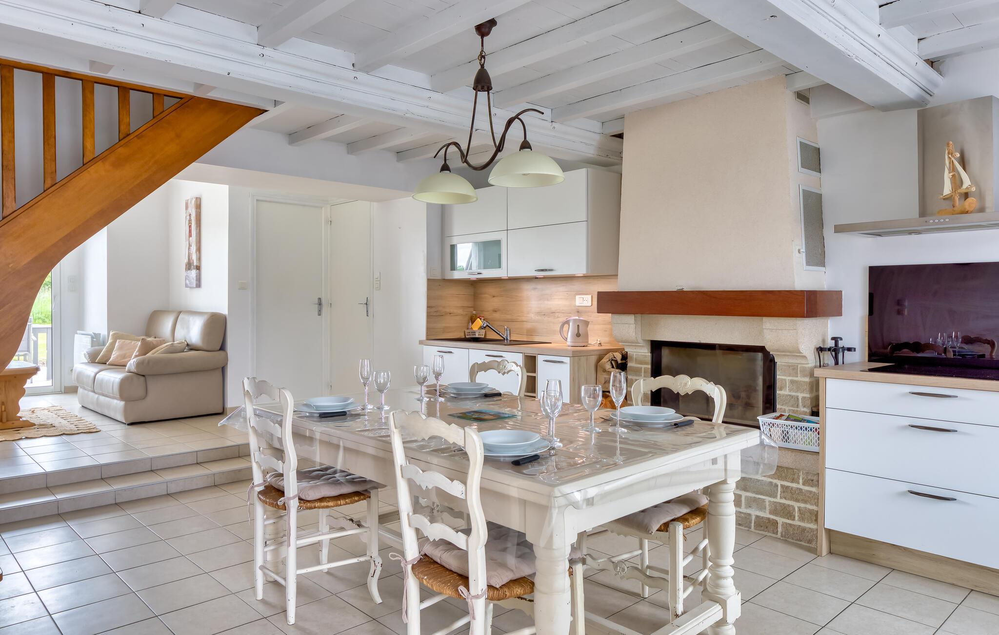 Dieses helle und ruhig gelegene Ferienhaus begrüßt Sie unweit der feinsandigen Strände der Halbinsel Cotentin und bietet Ihnen ein behagliches Zuhause, während Sie die Sehenswürdigkeiten der Normandie entdecken. Servieren Sie sich am stilvollen Esstisch regionale Spezialitäten und machen Sie es sich nach einem erlebnisreichen Tag mit einem guten Buch im gemütlichen Wohnzimmer bequem.
