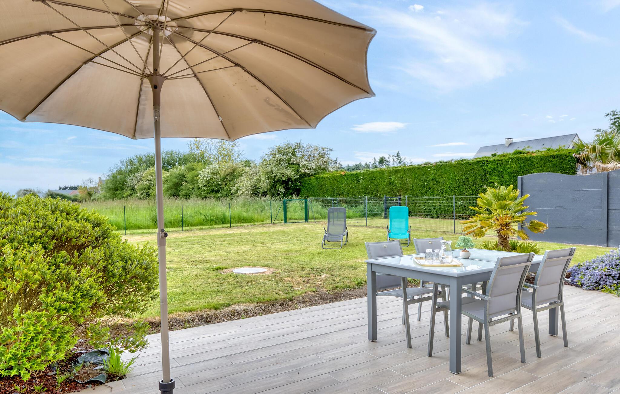 Genießen Sie morgens ein ausgiebiges Frühstück auf der Terrasse, lassen Sie Ihre Kinder mit dem Hund auf der weitläufigen Rasenfläche spielen und decken Sie sich während Ihrer Ausflüge mit leckeren Zutaten für einen stimmungsvollen Grillabend unter freiem Himmel ein.