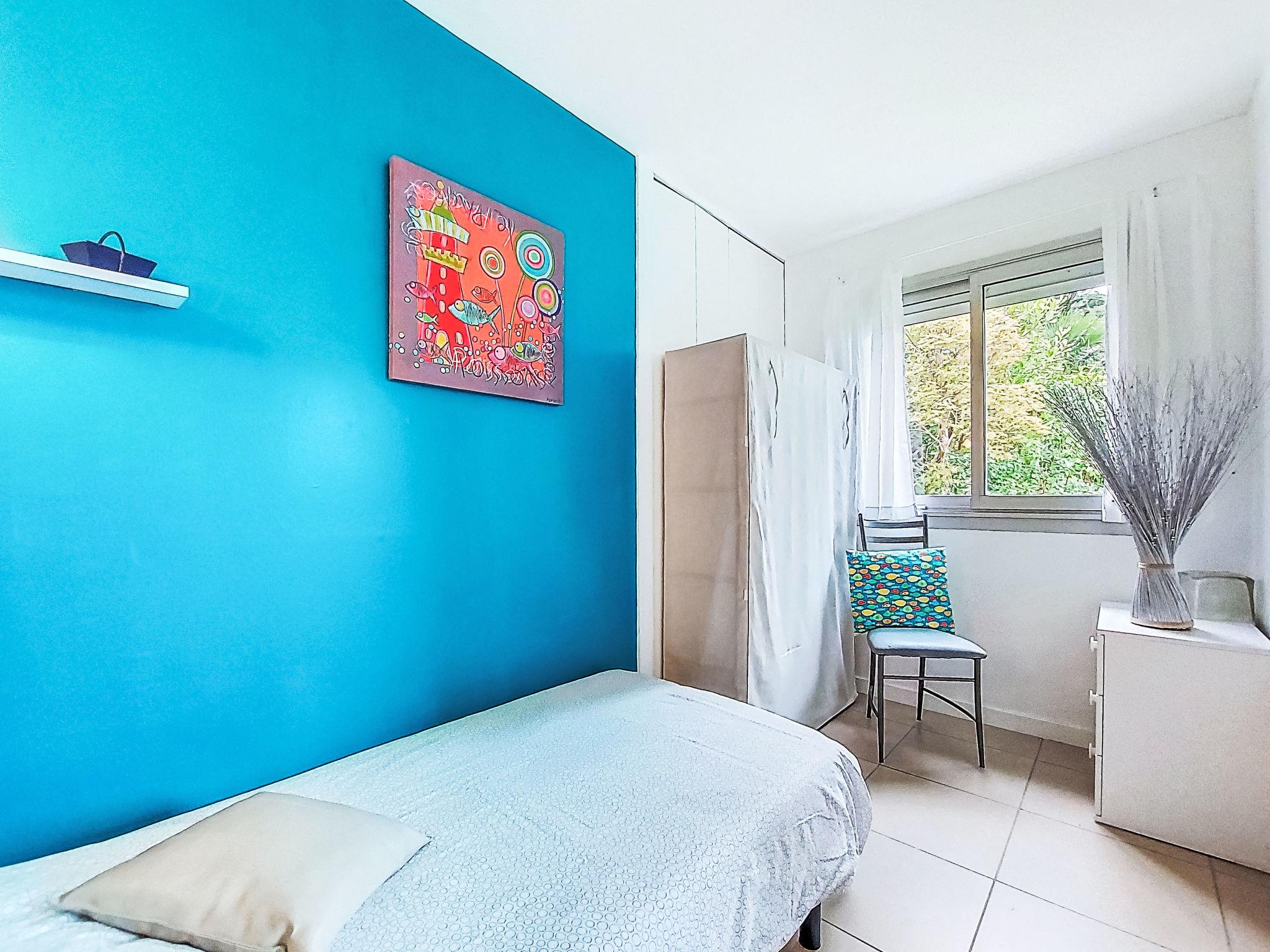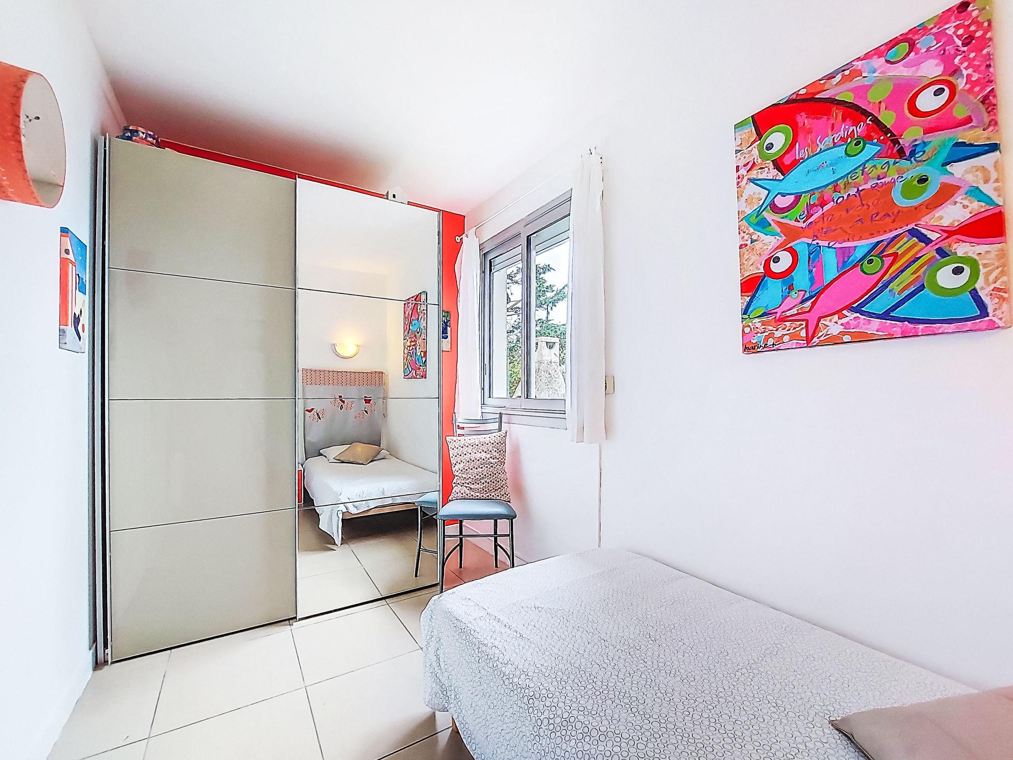 4-room house 60 m2, south facing position. Practical furnishings: living room 25 m2 with panoramic window with TV (flat screen). Exit to the terrace. 1 room 10 m2 with 1 french bed (140 cm, length 190 cm), electric shutters. 2 small children's rooms, each room with 1 bed (90 cm, length 190 cm). Kitchenette (mini-oven, dishwasher, 4 ceramic glass hob hotplates, toaster, kettle, microwave, freezer, electric coffee machine) with bar. Shower, sep. WC. Electric heating. Terrace 20 m2, south facing position. Terrace furniture, barbecue. View of the sea and the bay. Facilities: washing machine, hair dryer. Please note: non-smoking house. Maximum 1 pet/ dog allowed. Smoke alarm.
