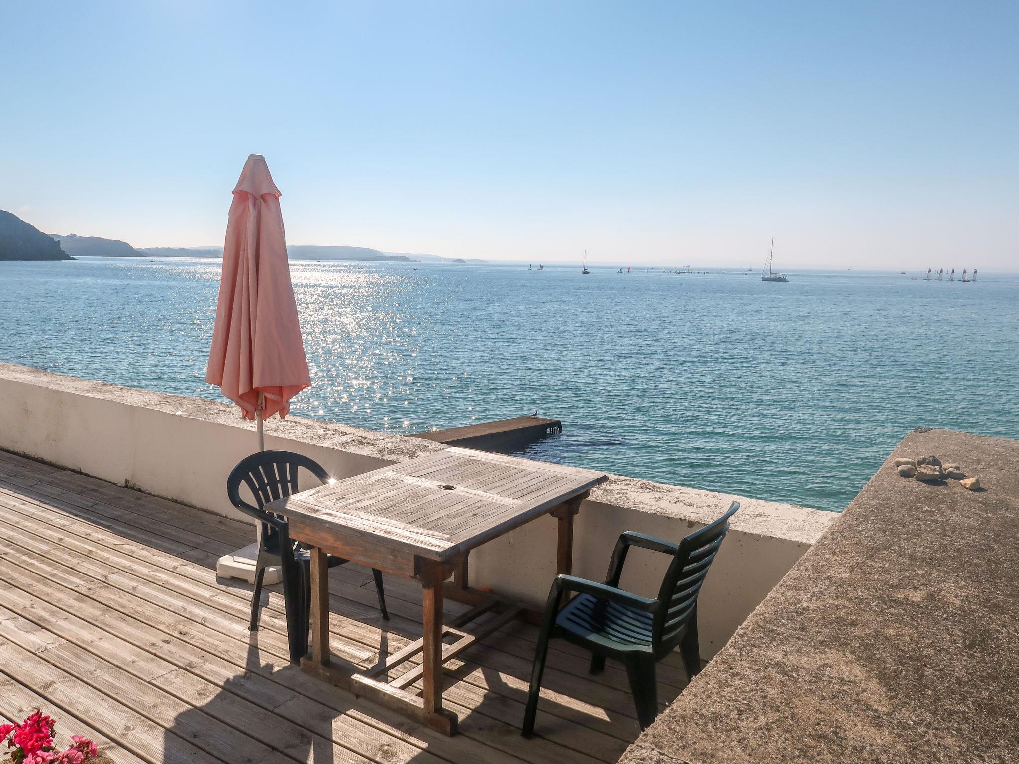 Cosy, rustic single-family house "Les Embruns". 200 m from the centre of Morgat, 2 km from the centre of Crozon, 12 km from the centre of Camaret, 10 m from the sea, direct access to the beach. Public parking on the road. Shop 200 m, supermarket 2 km, restaurant 200 m, bus stop 2 km, sandy beach "Plage de Morgat" 10 m, indoor swimming pool 100 m. Marina 1.2 km, sailing school 1.2 km.