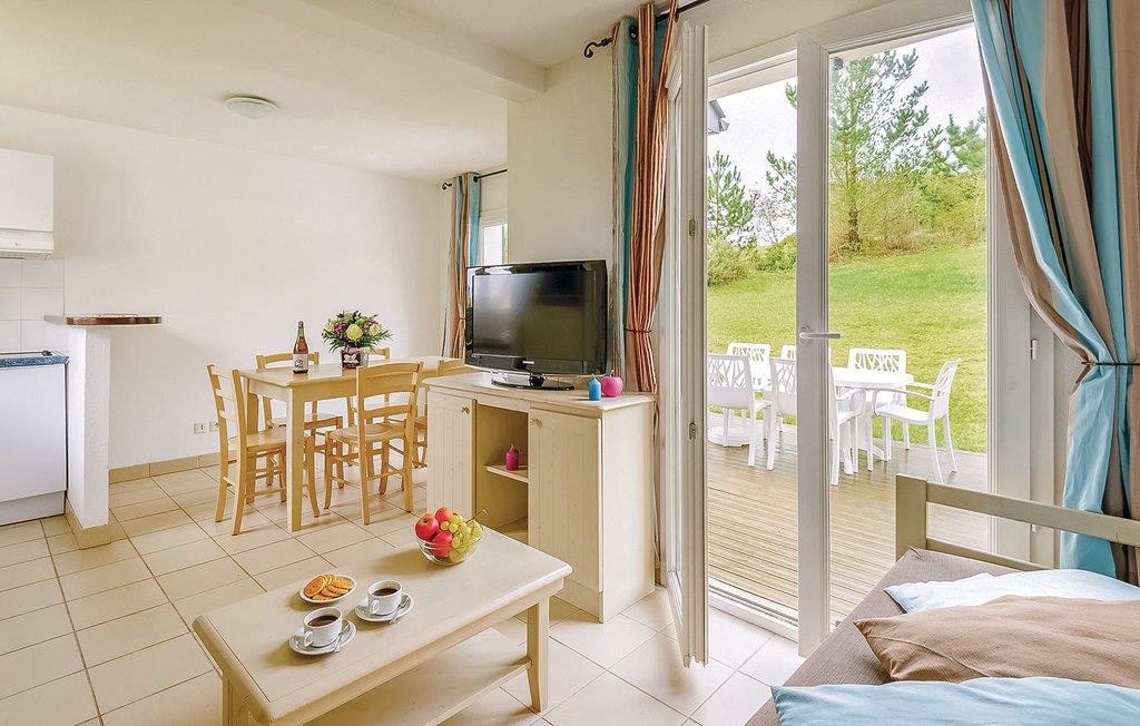 In fußläufiger Entfernung zum Dorfzentrum und dem Strand empfängt Sie dieses Haus in einem Ferienpark im Herzen der Bretagne. Machen Sie es sich in den hellen Räumen bequem, die mit modernen Möbeln und wohnlichem Ambiente zum Entspannen einladen. Genießen Sie die gemeinsamen Mahlzeiten mit schönem Blick ins Freie oder verlegen Sie das Abendessen gleich auf die Terrasse.