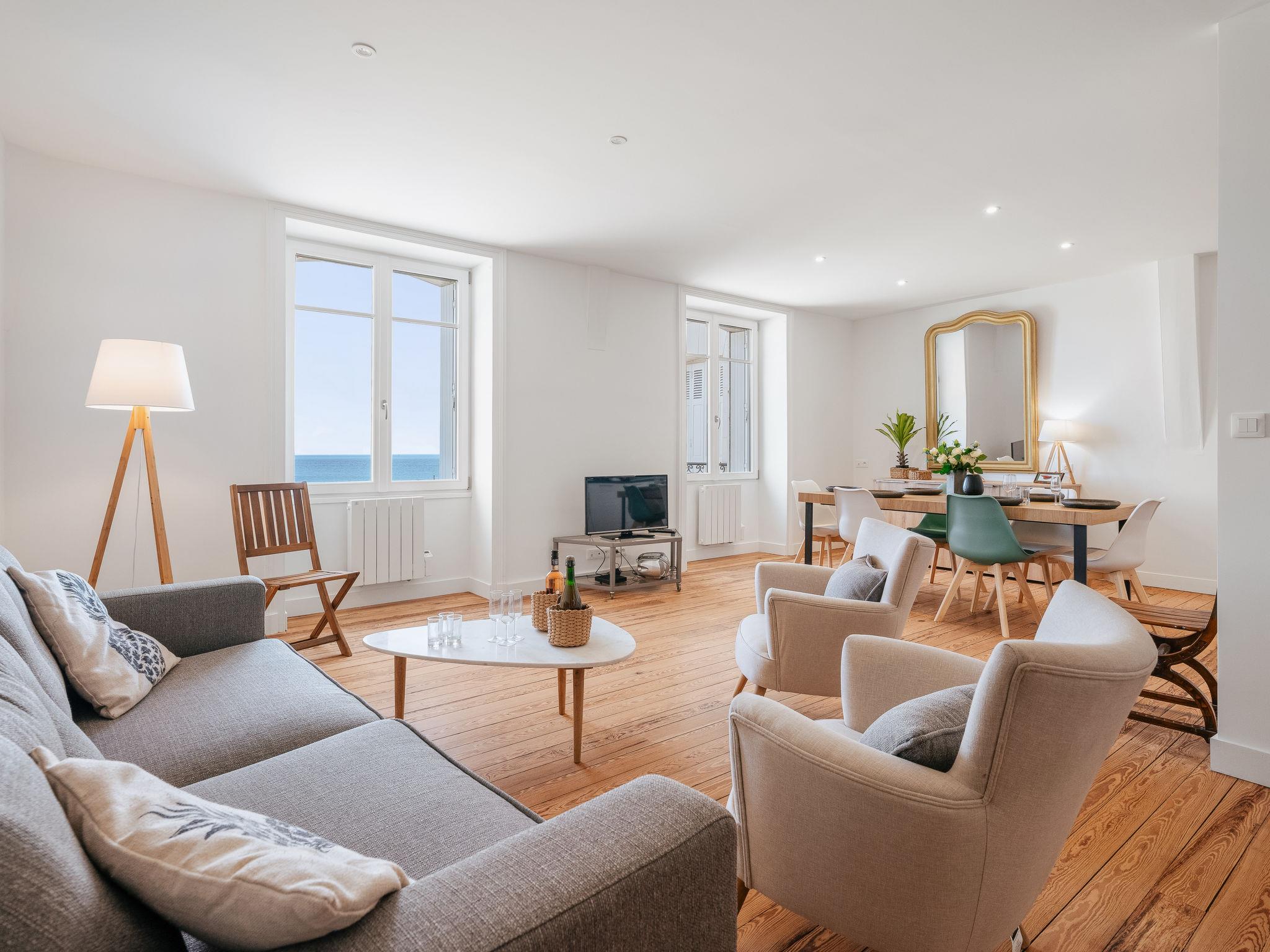"Résidence Les Terrasses", 3-room apartment 65 m2 on 3rd floor. Fully renovated in 2026, comfortable and beautiful furnishings: living/dining room with TV (flat screen). 1 room with 1 french bed (1 x 140 cm, length 200 cm). 1 room with 1 french bed (2 x 70 cm, length 190 cm). Kitchen (oven, dishwasher, 3 induction hot plates, toaster, kettle, microwave, freezer, electric coffee machine). Shower/WC. Electric heating. Very beautiful view of the sea. Facilities: washing machine, dryer, iron, hair dryer. Internet (WiFi, free). Please note: non-smokers only. Smoke alarm. Offer by a private individual according to Art. 155, IV of CGI.