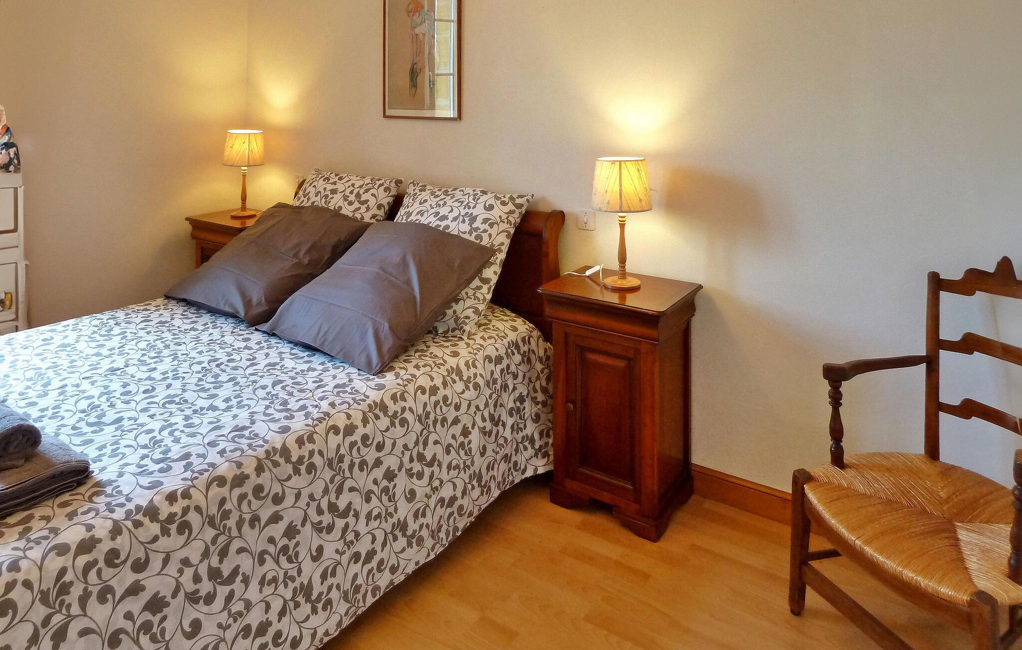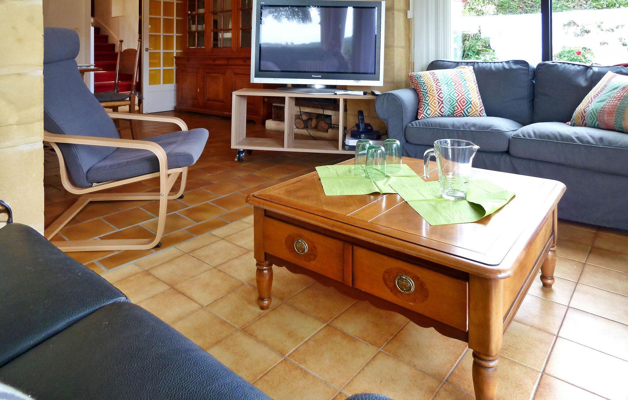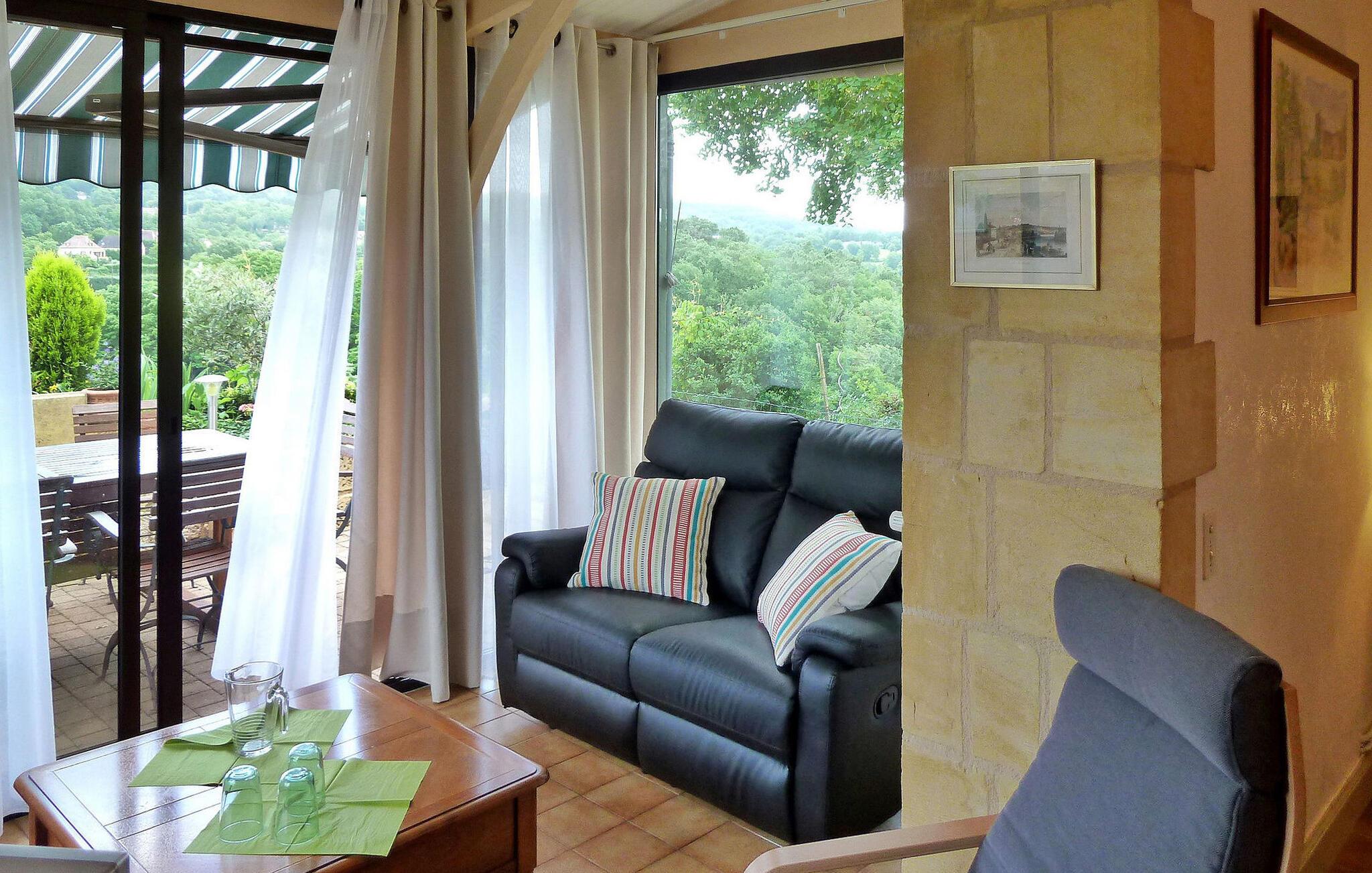 Dieses Steinhaus liegt in Domme, einer mittelalterlichen Stadt gleich außerhalb des lebhaften Touristenzentrums. Das Haus ist klimatisiert und verfügt über eine Terrasse mit atemberaubender Aussicht. Der nahe gelegene Fluss Dordogne eignet sich ideal zum Kanufahren und Schwimmen. Im Erdgeschoss der Immobilie befinden sich eine gut ausgestattete Küche und ein einladender Wohn-/Essbereich mit Eckkamin, eine gemütliche Sitzecke mit Flachbildfernseher und ein Schlafzimmer mit eigenem Bad. Erkerfenster führen zur Außenterrasse und bieten eine faszinierende Aussicht. Im ersten Stock befinden sich die restlichen Schlafzimmer. Draußen bietet das Anwesen einen bezaubernden Garten mit Bäumen, Blumen und einem gepflegten Rasen sowie Liegestühlen zum Entspannen. Die gepflasterte Terrasse verfügt über Gartenmöbel und Panoramablick. Das Haus liegt in der mittelalterlichen Stadt Domme, nicht weit vom Dorfzentrum entfernt. Geschäfte, Boutiquen und Restaurants sind fußläufig erreichbar. Domme: Königliche Bastide aus dem 13. Jahrhundert mit den berühmtesten Ausblicken auf das Périgord und mit Blick auf das Tal der Dordogne. Der Fluss Dordogne mit seinen Kanus ist etwa 3/4 km entfernt. Bitte beachten Sie, dass Parkplätze auf der Straße, jedoch nicht innerhalb der Unterkunft zur Verfügung stehen. Für zusätzlichen Komfort sind alle Schlafzimmer und das Wohnzimmer klimatisiert.