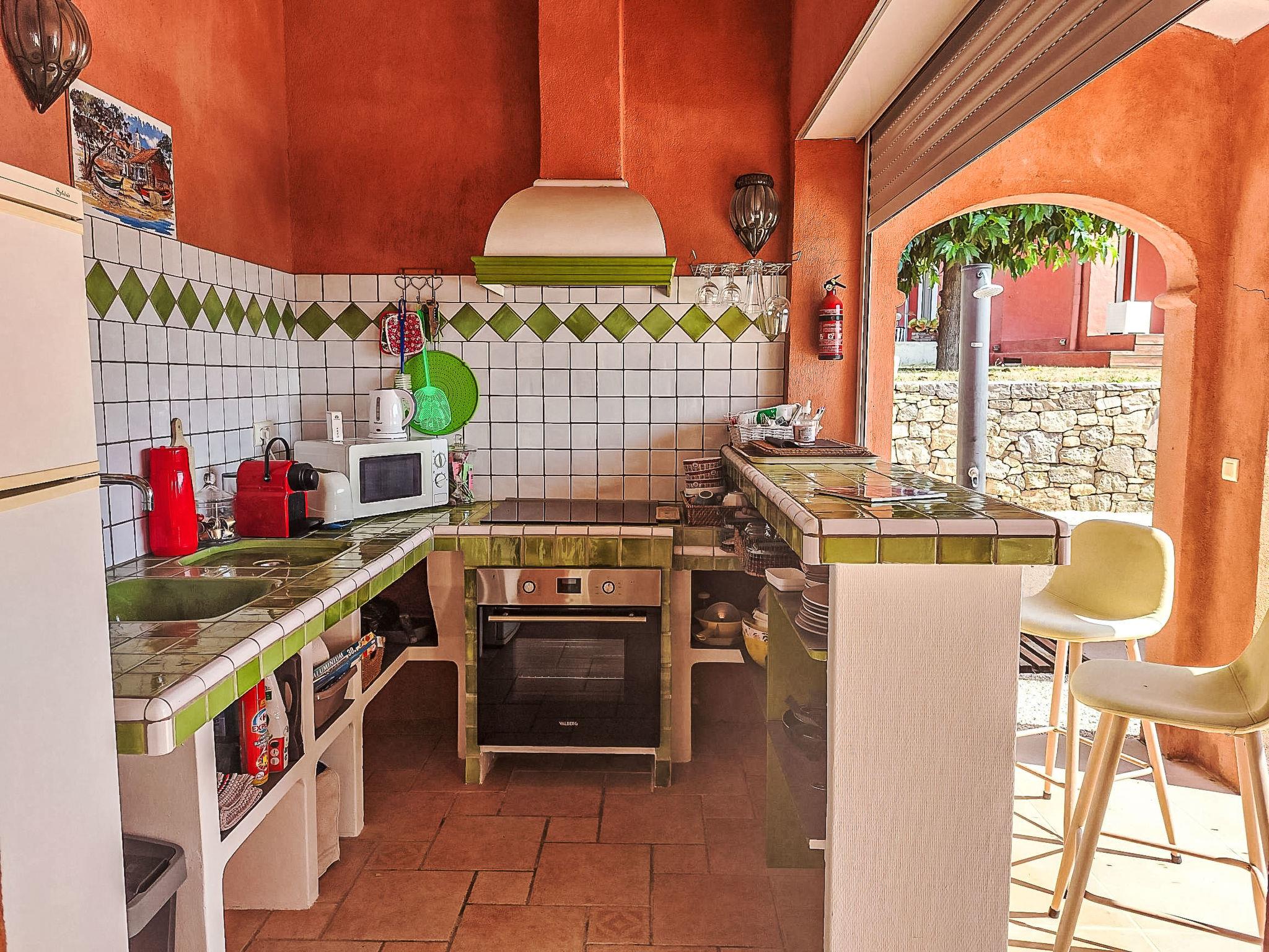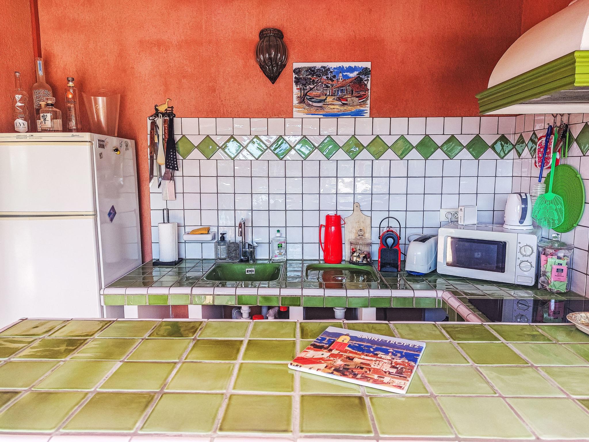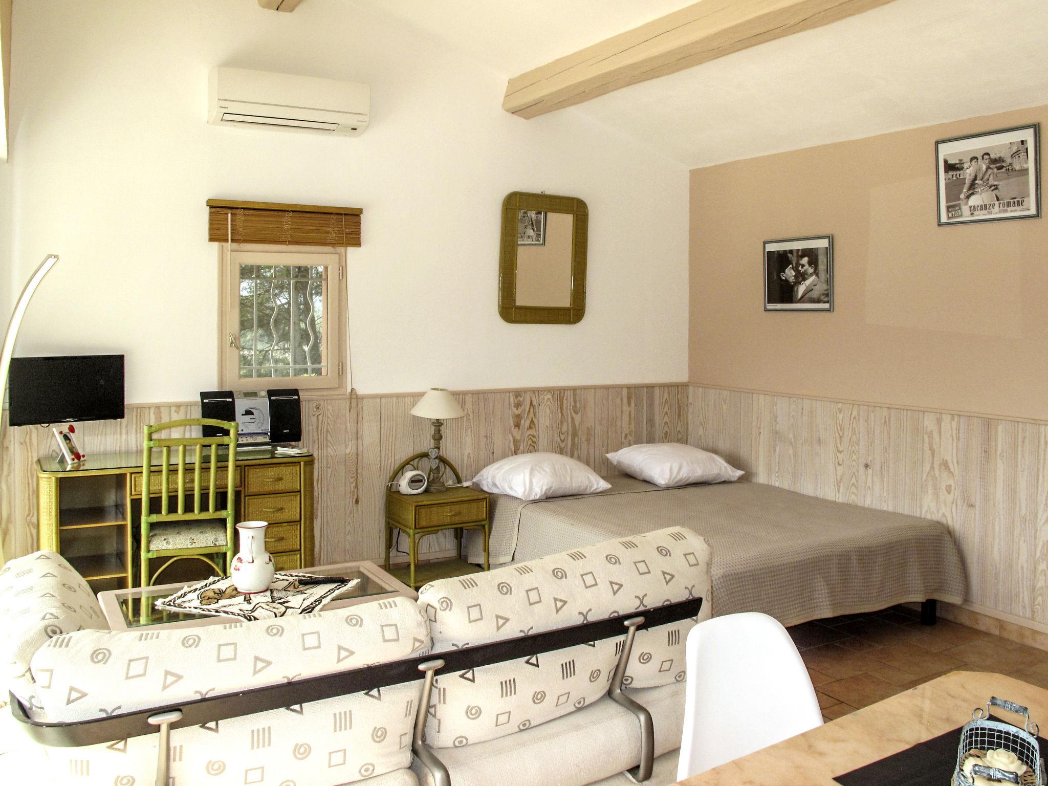 "Le Cabanon", 1-room house 35 m2. Practical and beautiful furnishings: living/sleeping room with 1 french bed (140 cm, length 190 cm), dining table, TV, electric heating and air conditioning. Exit to the terrace. Open kitchen (oven, 3 induction hot plates, toaster, kettle, microwave, freezer, electric coffee machine, Capsules for coffee machine (Nespresso) extra). Shower/WC. Terrace 12 m2, roofed. Terrace furniture, electric barbecue, deck chairs (3). View of the swimming pool and the garden. Facilities: washing machine, iron, children's high chair, baby cot. Internet (WiFi, free). Parking (1 car). Please note: non-smoking house. The kitchen is an open summer kitchen outdoors.
