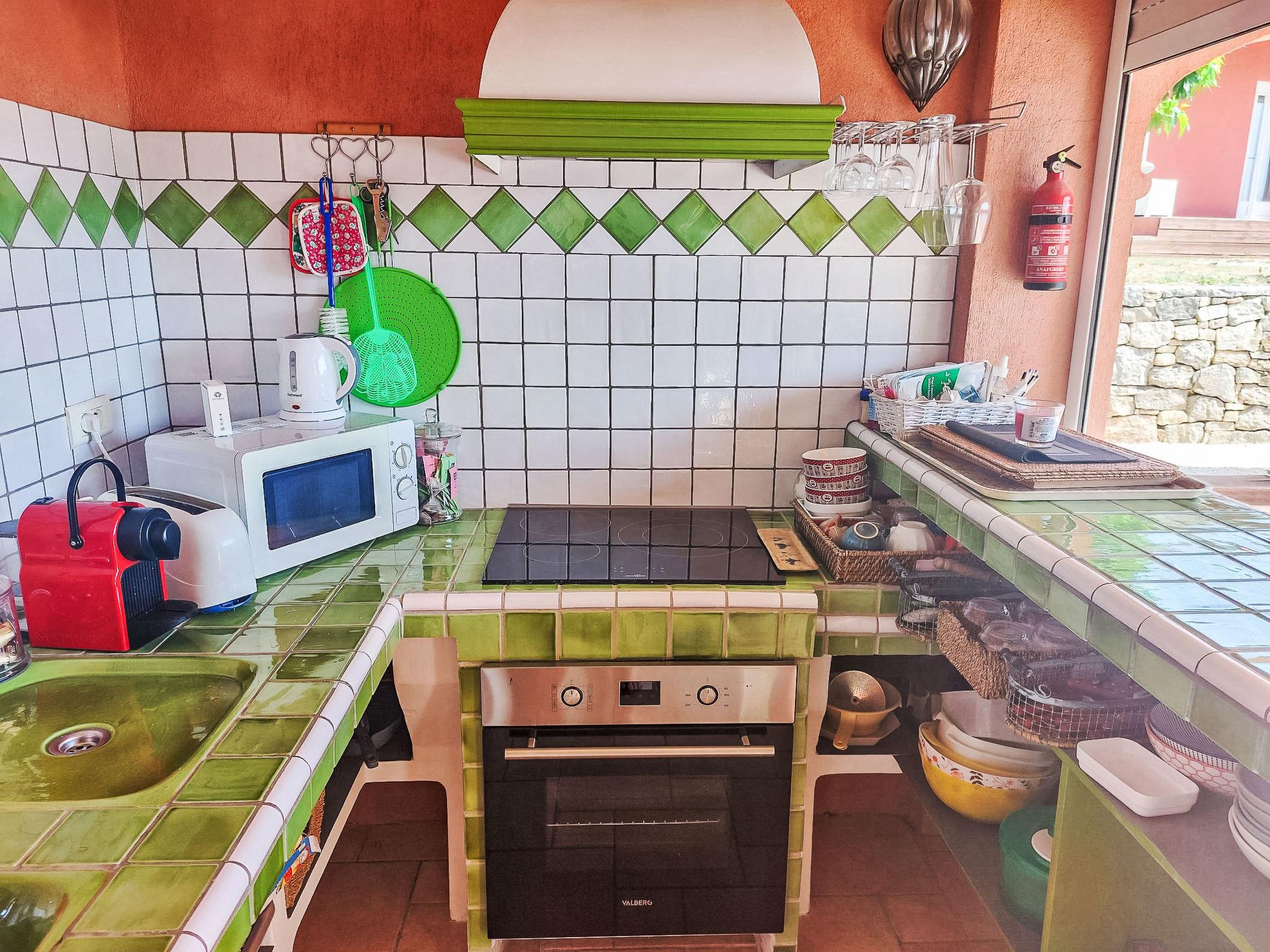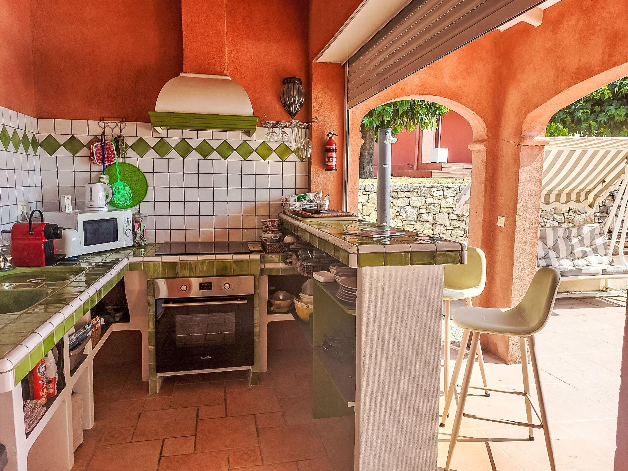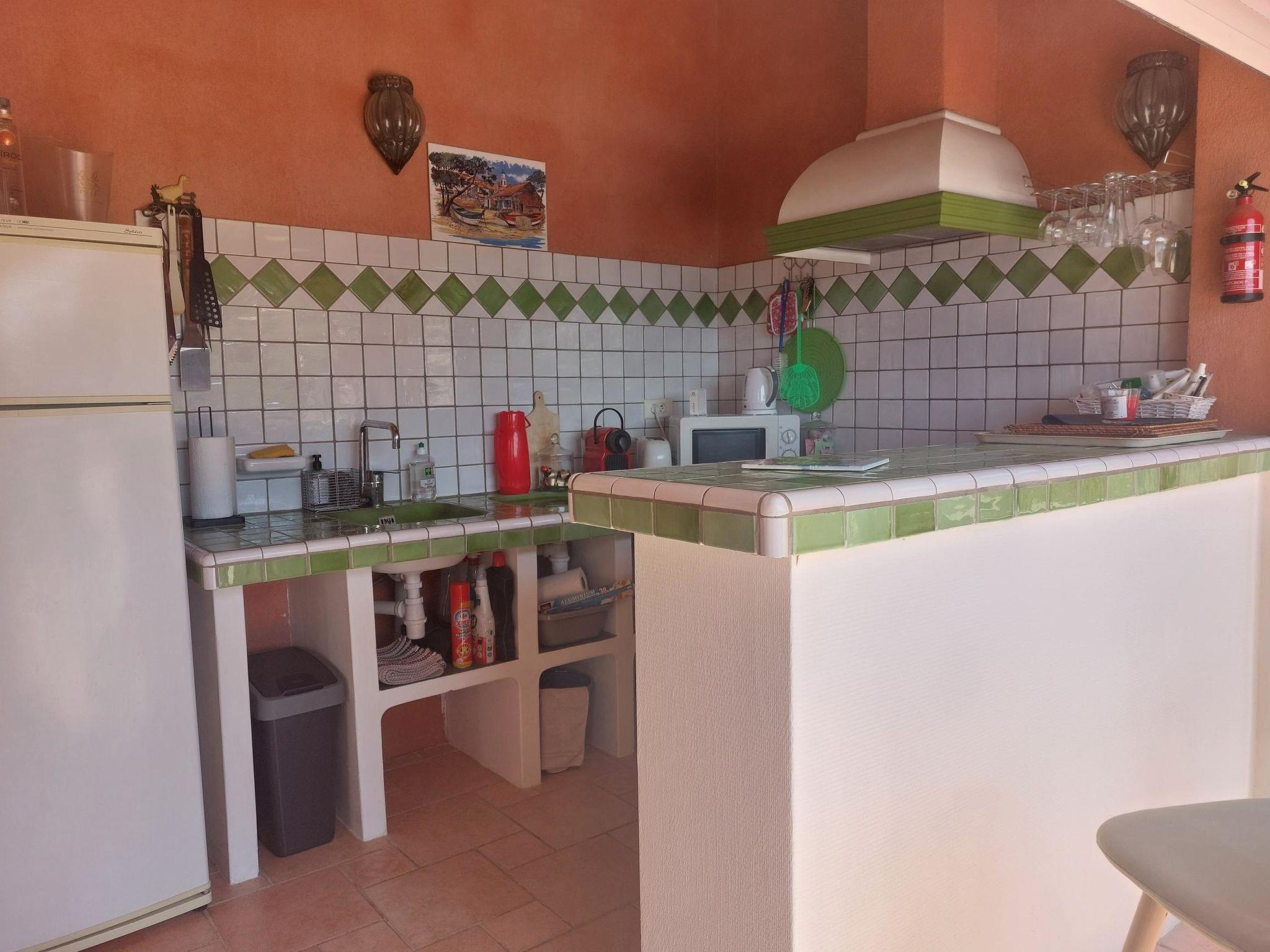 "Le Cabanon", 1-room house 35 m2. Practical and beautiful furnishings: living/sleeping room with 1 french bed (140 cm, length 190 cm), dining table, TV, electric heating and air conditioning. Exit to the terrace. Open kitchen (oven, 3 induction hot plates, toaster, kettle, microwave, freezer, electric coffee machine, Capsules for coffee machine (Nespresso) extra). Shower/WC. Terrace 12 m2, roofed. Terrace furniture, electric barbecue, deck chairs (3). View of the swimming pool and the garden. Facilities: washing machine, iron, children's high chair, baby cot. Internet (WiFi, free). Parking (1 car). Please note: non-smoking house. The kitchen is an open summer kitchen outdoors.