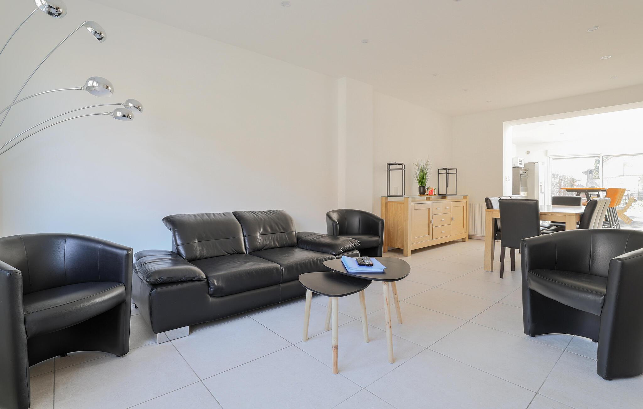 Dieses moderne Ferienhaus ist ideal für größere Familien und Gruppen, die Komfort und Geselligkeit schätzen. Zaubern Sie in der hellen, offenen Küche gemeinsam köstliche Gerichte und genießen Sie Ihre Mahlzeiten in großer Runde am langen Esstisch. Entspannen Sie auf den bequemen Ledersofas im offenen Wohnbereich und verbringen Sie gemeinsame Zeit bei einem fröhlichen Spieleabend.