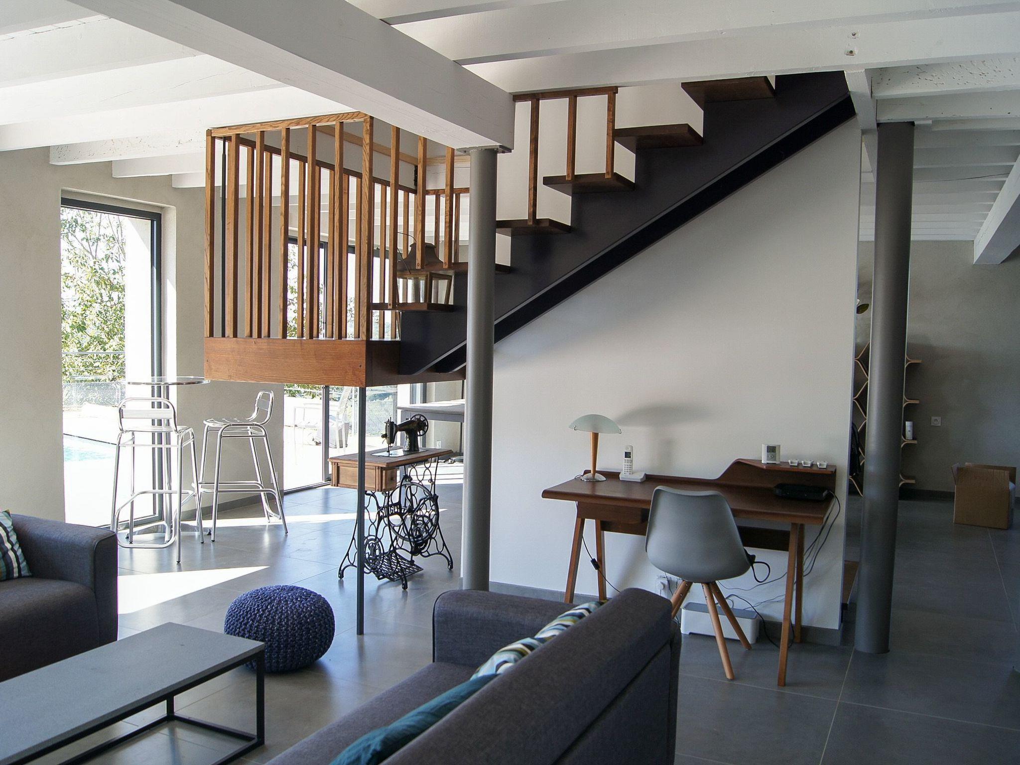 The charm of the exterior is just as remarkable, with a 110 m2 wooden terrace on three sides, incorporating a 9 x 4.5 m swimming pool secured by an electric roller shutter. This layout allows you to take full advantage of the sunny climate, with the added benefit of a large tree at the rear providing shade and coolness on hot summer days. The outdoor space is an invitation to relax, in harmony with the soothing hillside landscape.