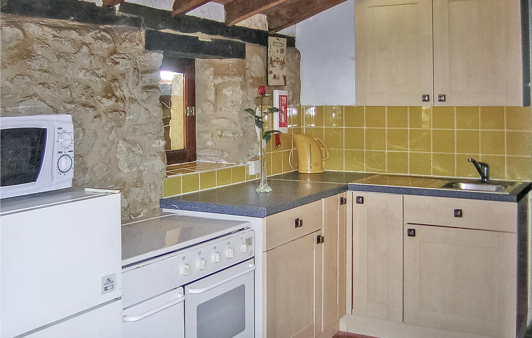 Genießen Sie einen Aufenthalt auf dem Land in einer Unterkunft, die sich gut für Paare eignet und Ihnen Ruhe und Entspannung bietet. Richten Sie sich in den schlicht eingerichteten Innenräumen ein. Bereiten Sie Speisen in der praktischen Küche zu und freuen Sie sich über die gemütliche Atmosphäre der steinernen Wände und Holzbalken. Entspannen Sie im Wohnbereich mit Sofa oder nehmen Sie Ihre Mahlzeiten am kleinen Tisch ein.