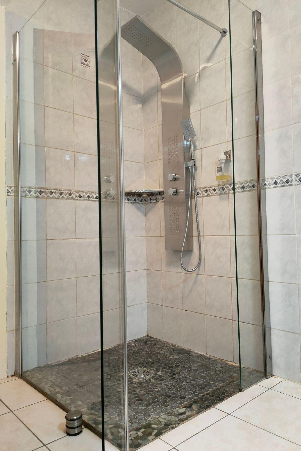 ~ Bathroom: Italian shower, single washbasin, washing machine, heated towel rail.